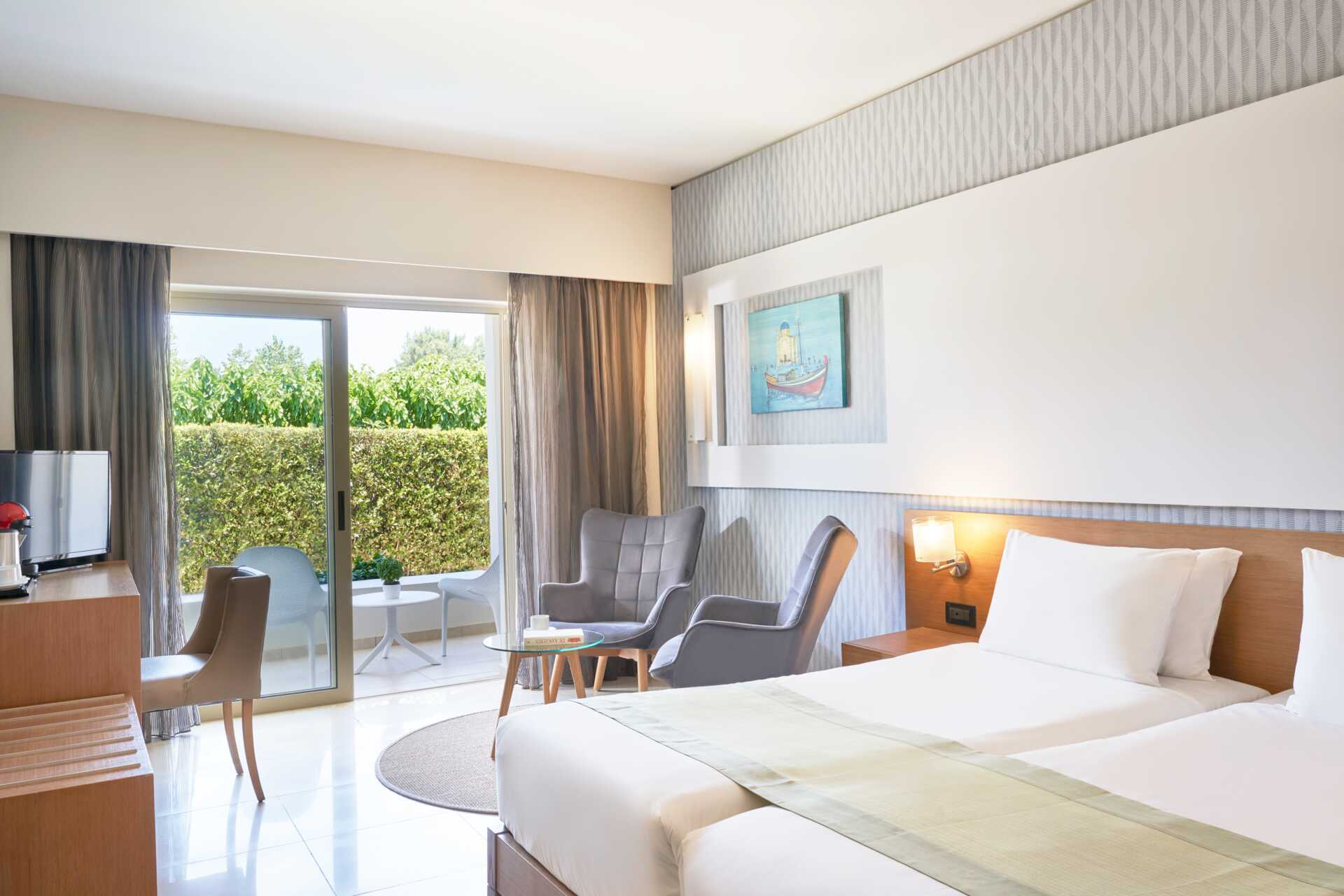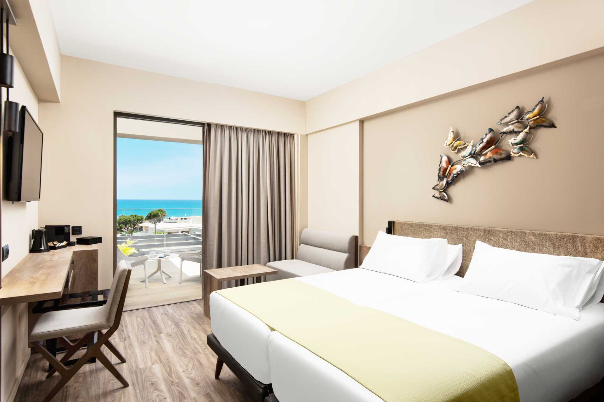 Deluxe-værelser med balkon eller terrasse, nogle med havudsigt. Deluxe-værelserne er placeret i en separat bygning bygget i 2020, og for at komme til disse værelser skal du krydse en trafikeret vej eller gå via en bro. En dobbeltseng eller to enkeltsenge. Gratis wifi, aircondition og deponering. Køleskab. El-kedel og kaffe/te. Tv med internationale kanaler. Badekåber og tøfler. Hårtørrer. Badeværelse med bruser og toilet. Rengøring 7 gange om ugen.