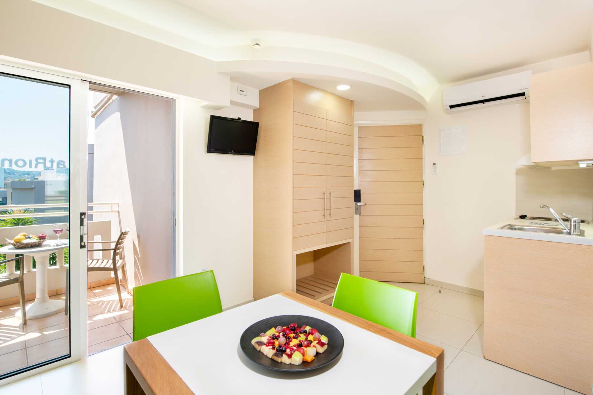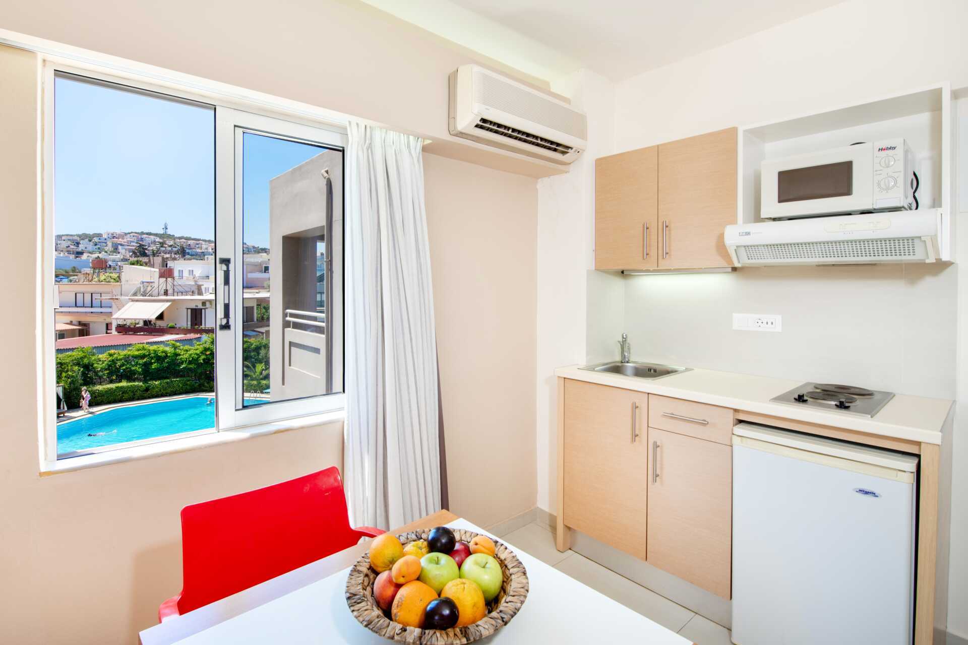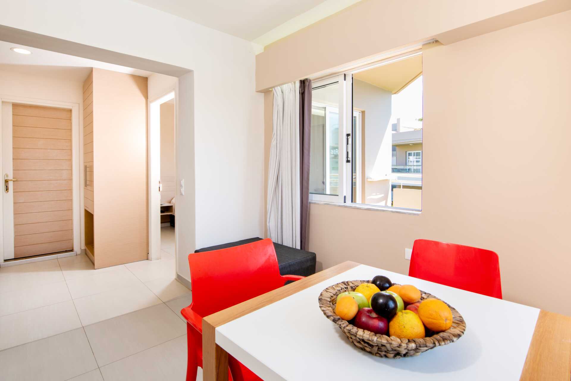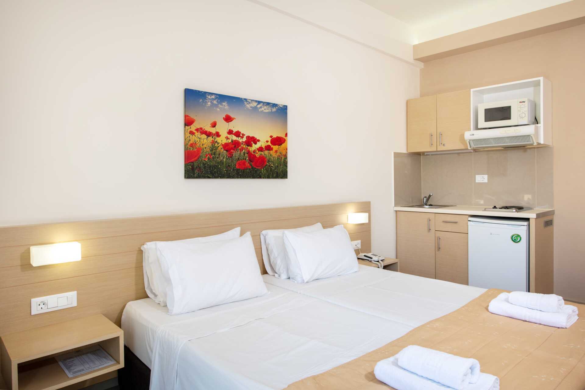 1-værelses lejligheder i varierende størrelser. Balkon eller terrasse i stueplan. Næsten alle lejligheder, med undtagelse af enkelte lejligheder med terrasse i stueplan, er renoveret. Flere trin for at komme til nogle lejligheder. Nogle lejligheder med terrasse har et par trin op til terrassen. Soveværelse kombineret med minikøkken. To enkeltsenge. Mulighed for ekstra opredning i enkeltseng. Minikøkken med kogeplader, mikroovn, el-kedel, kaffemaskine, køleskab og enkelt køkkenudstyr. Gratis wifi, aircondition og deponering. Tv med internationale kanaler. Hårtørrer. Badeværelse med bruser og toilet. Rengøring 6 gange om ugen.
