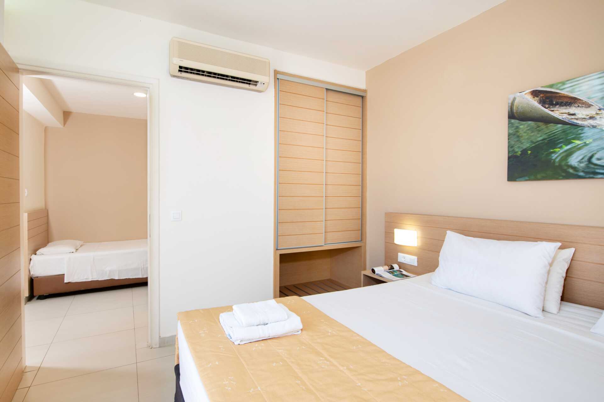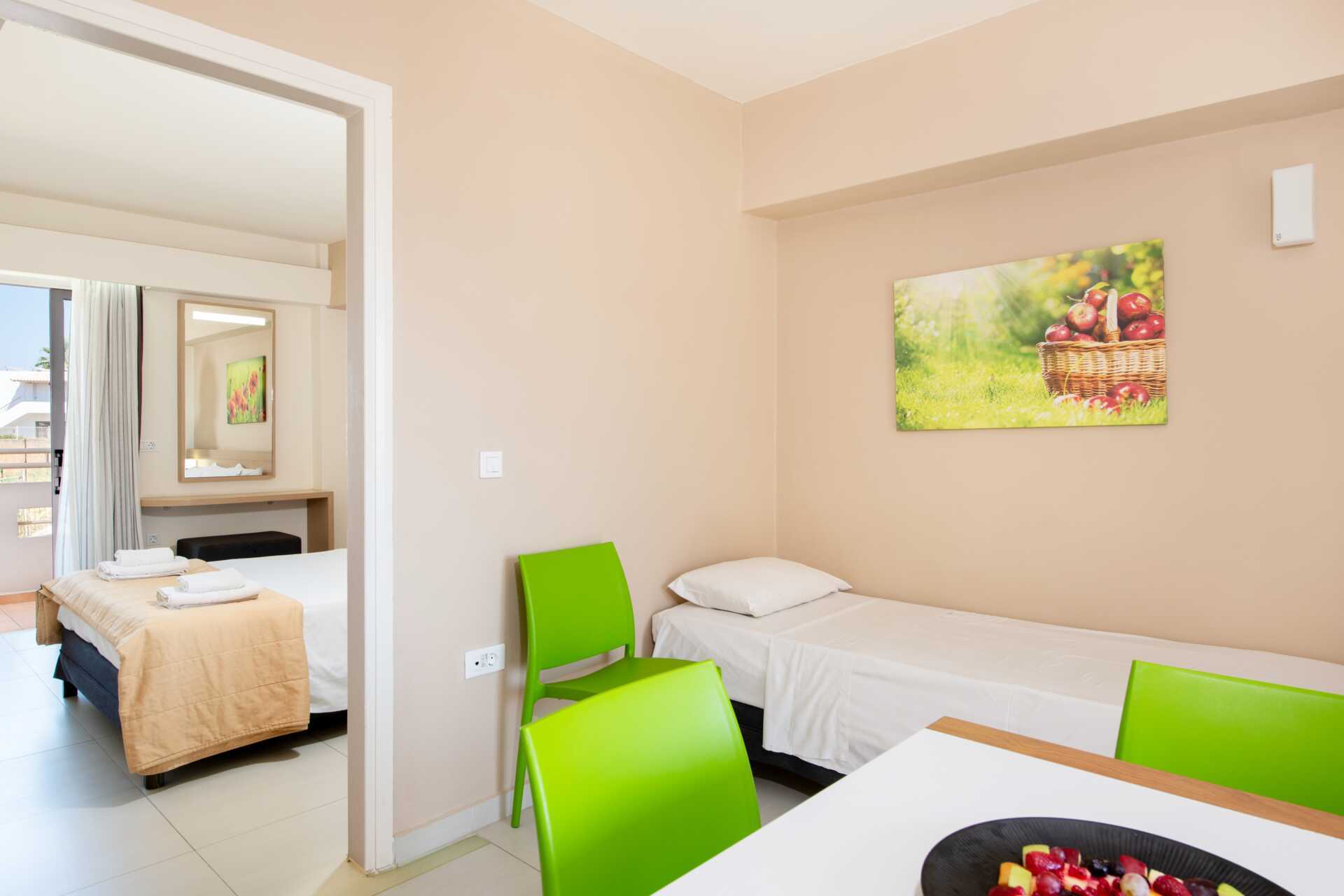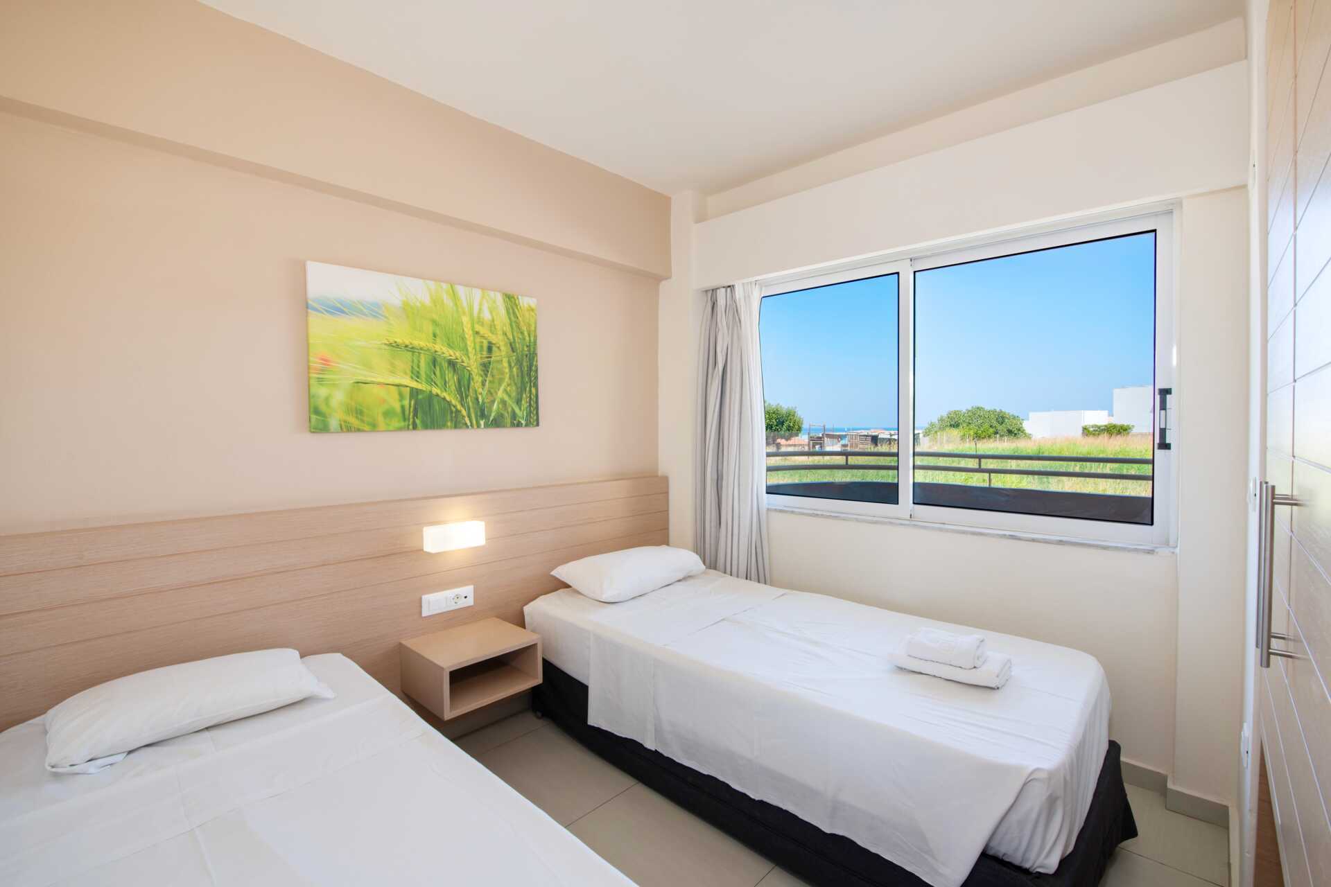3-værelses lejlighed med balkon eller balkon i stueplan, nogle balkoner med pooludsigt. To soveværelser og kombineret opholdsrum med minikøkken. I nogle 3-værelses lejligheder er det ene soveværelse lille. En dobbeltseng eller to enkeltsenge i hvert soveværelse. Mulighed for ekstra opredning i sovesofaer eller enkeltsenge. Bruges alle ekstra opredninger, bliver lejligheden trang. Minikøkken med kogeplader, el-kedel, køleskab, mikroovn, kaffemaskine og enkelt køkkenudstyr. Gratis wifi, aircondition og deponering. Tv med internationale kanaler. Hårtørrer. Badeværelse med bruser og toilet. Rengøring 6 gange om ugen.