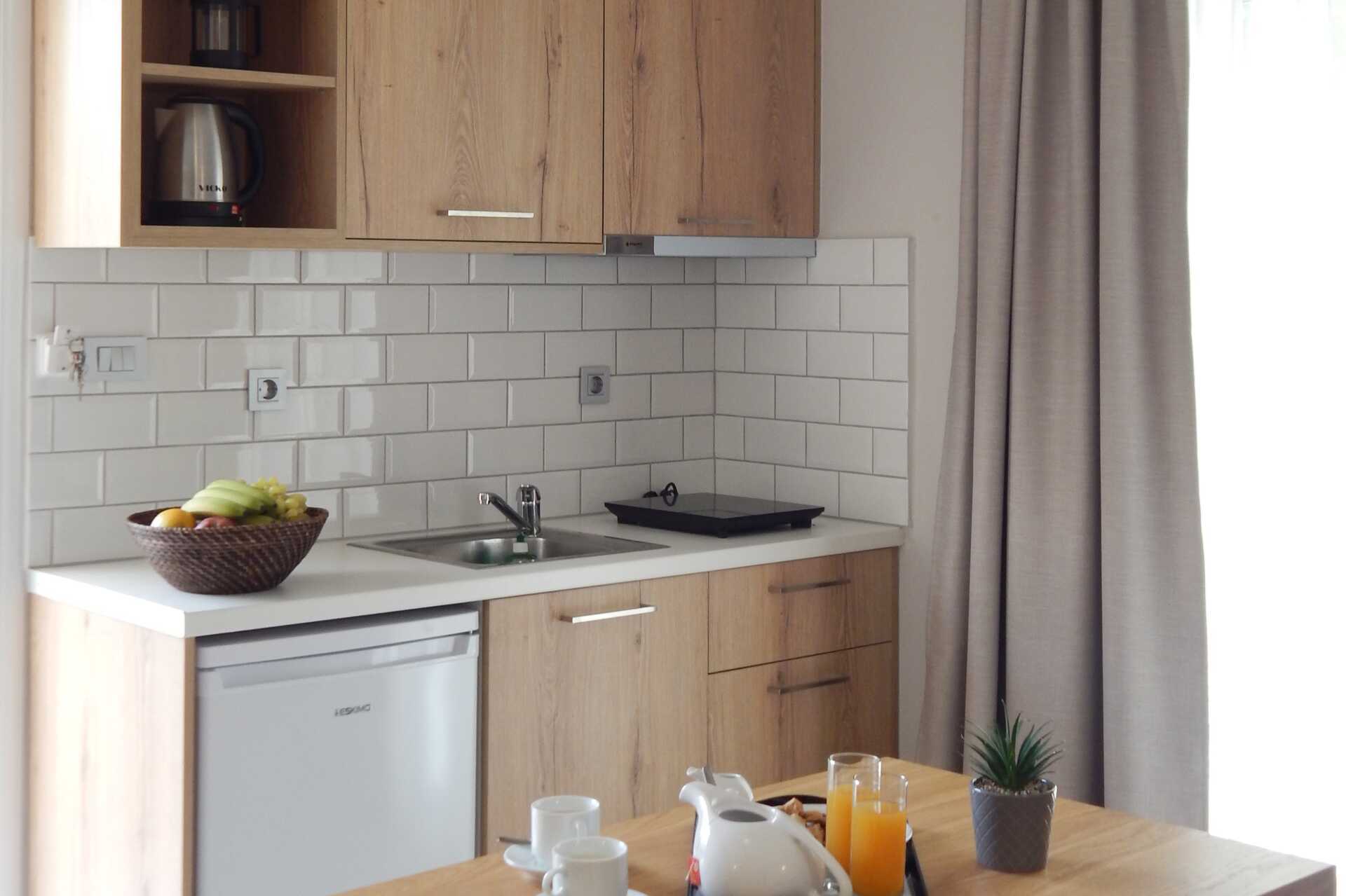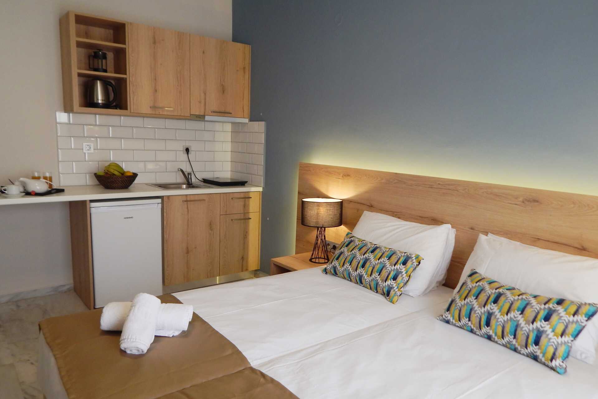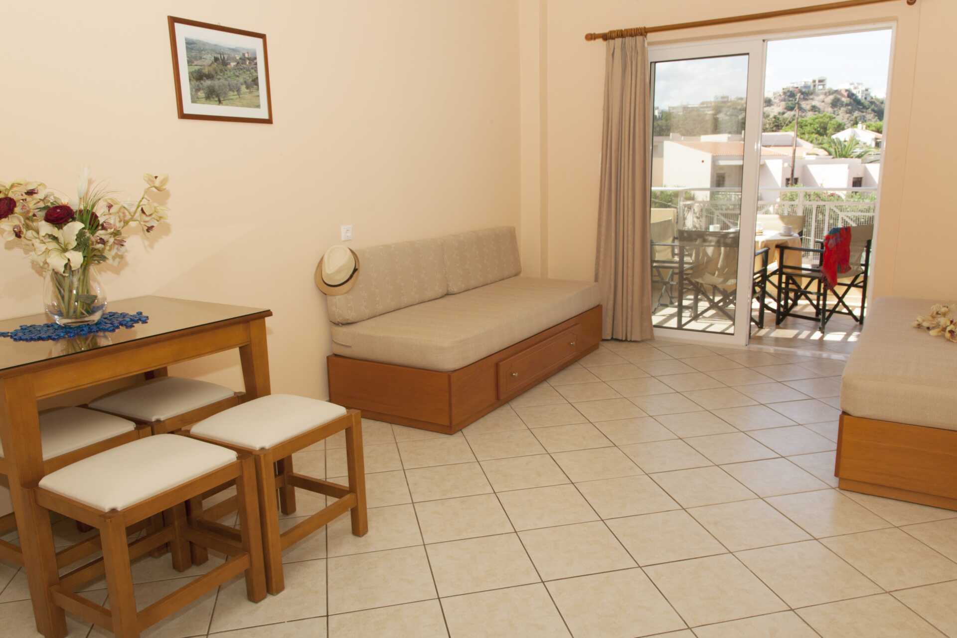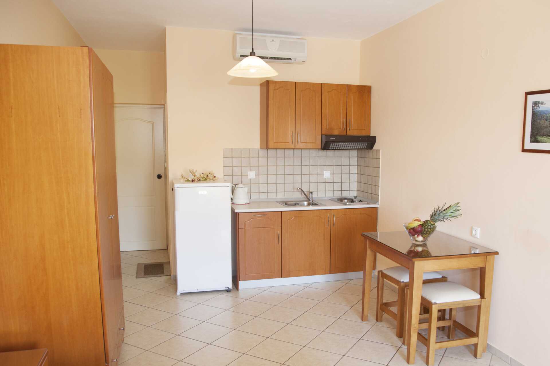 1-værelses lejligheder med balkon eller terrasse i stueplan. Soveværelse kombineret med minikøkken. En dobbeltseng eller to enkeltsenge. Minikøkken med kogeplader, køleskab med fryser, kaffemaskine, el-kedel og enkelt køkkenudstyr. Gratis wifi og aircondition. Deponering mod betaling. Hårtørrer. Badeværelse med bruser og toilet. Rengøring 6 gange om ugen.