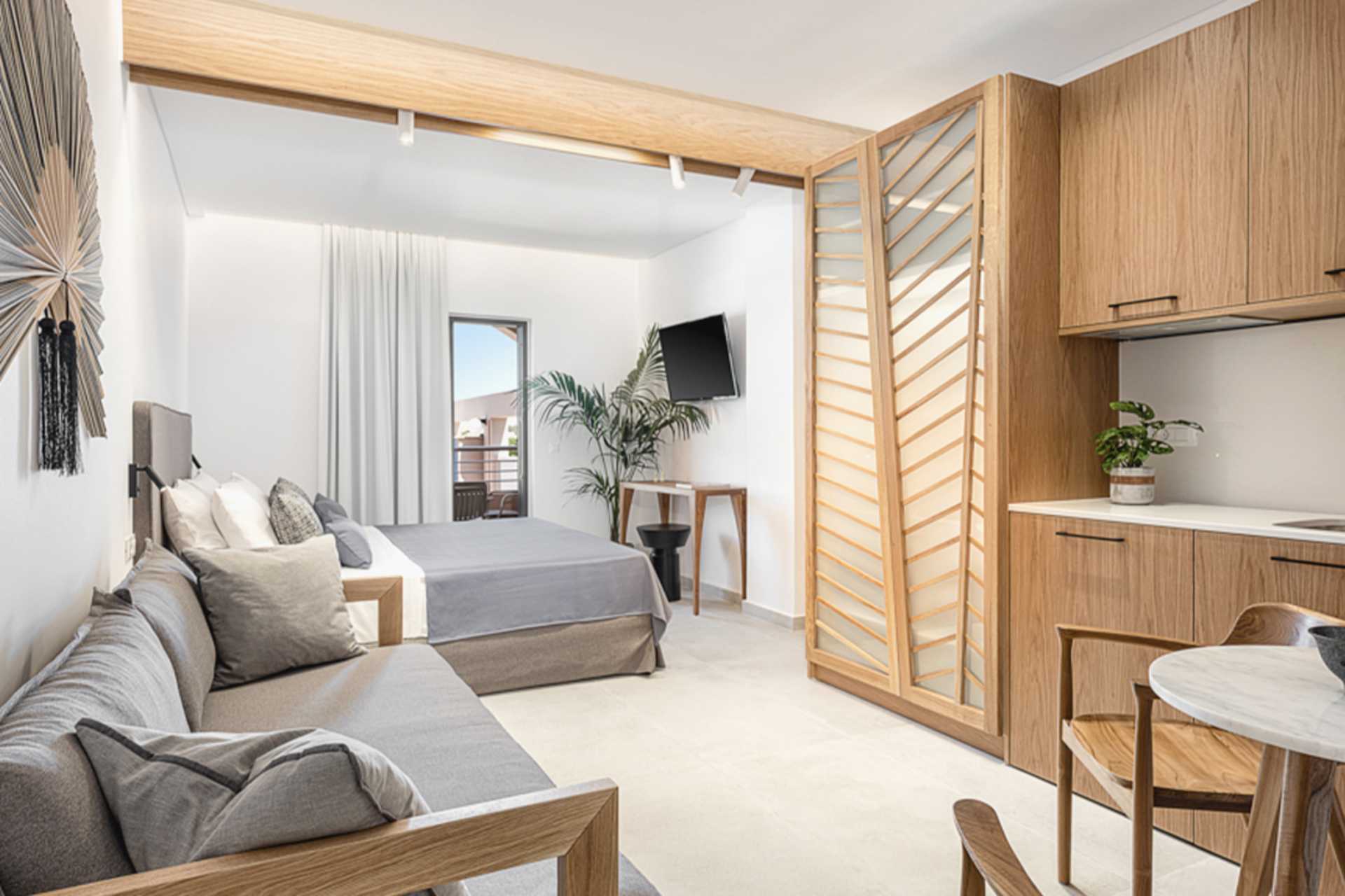 1-værelses lejlighed superior med balkon eller terrasse. Kombineret soveværelse og minikøkken. En dobbeltseng eller to enkeltsenge. Mulighed for ekstra opredninger i sovesofa. Minikøkken med kogeplader, køleskab, el-kedel og enkelt køkkenudstyr. Gratis wifi. Aircondition og deponering mod betaling. Tv med internationale kanaler. Badeværelse med bruser og toilet. Rengøring 6 gange om ugen.