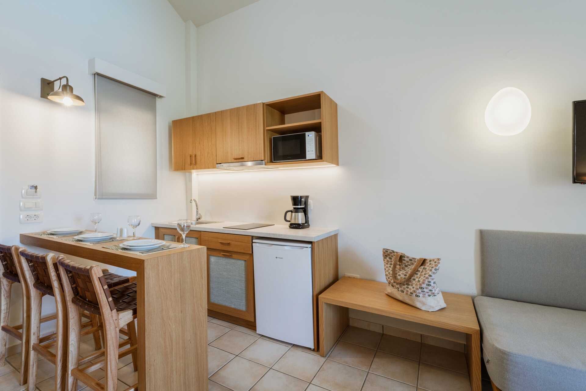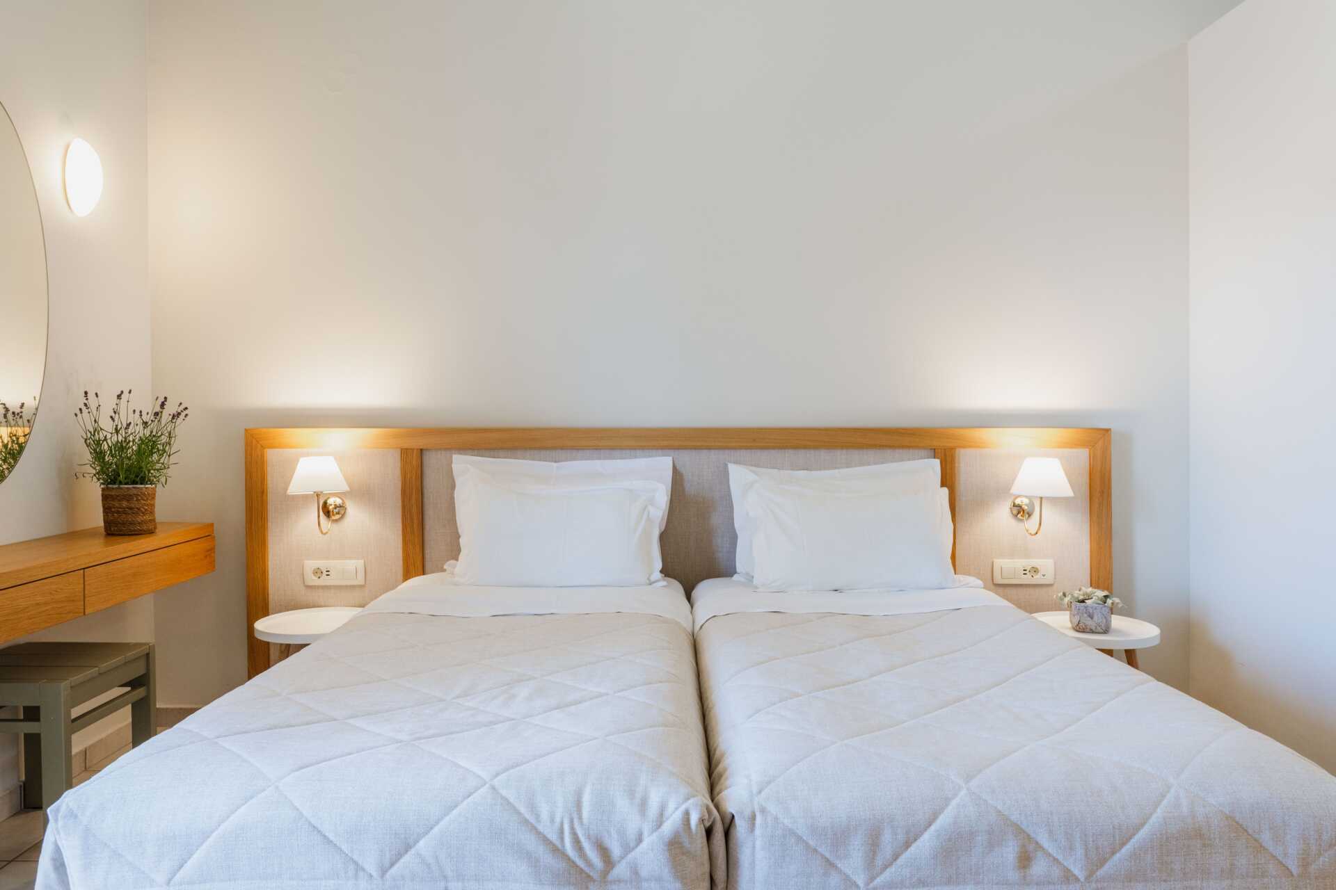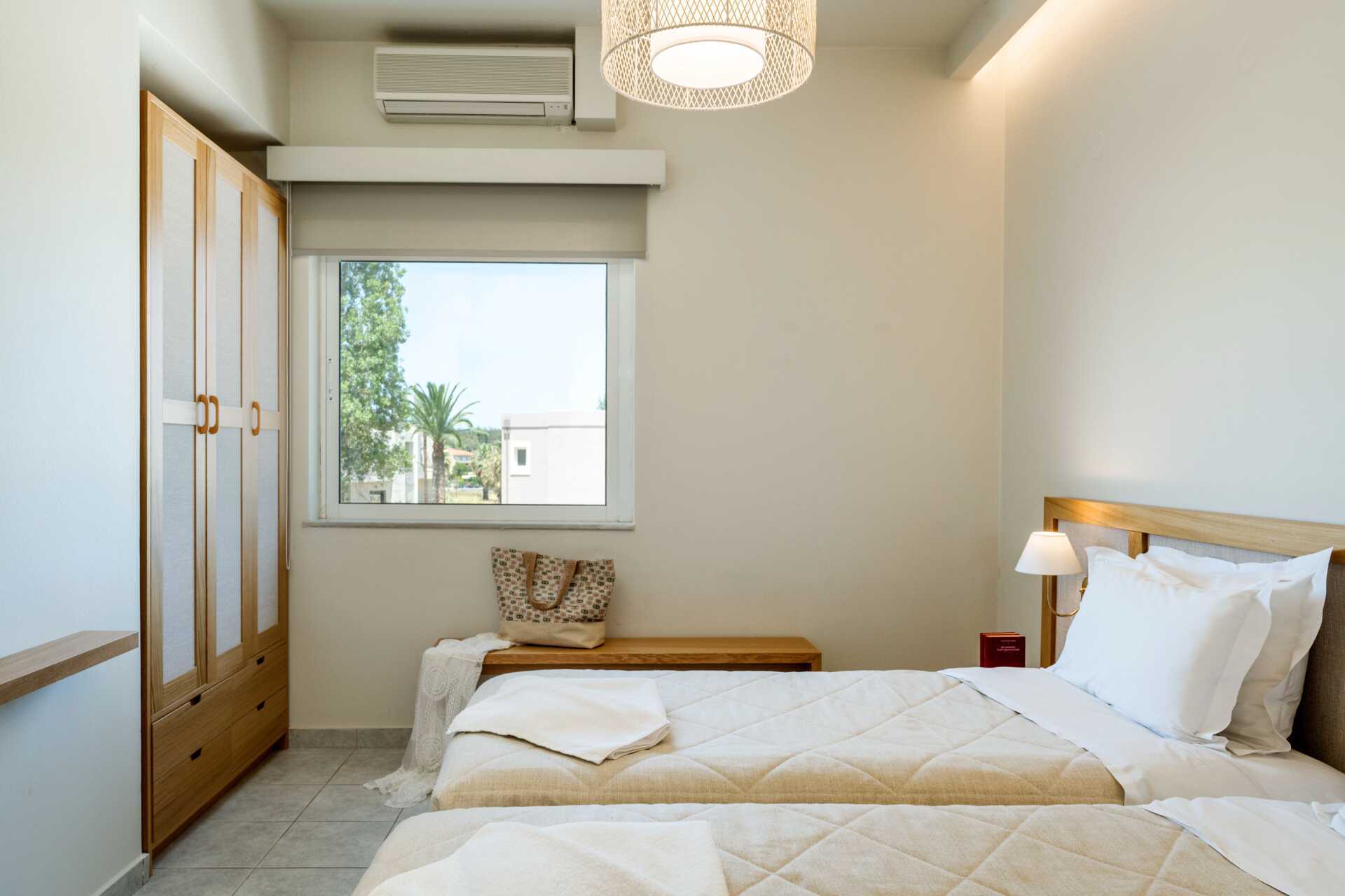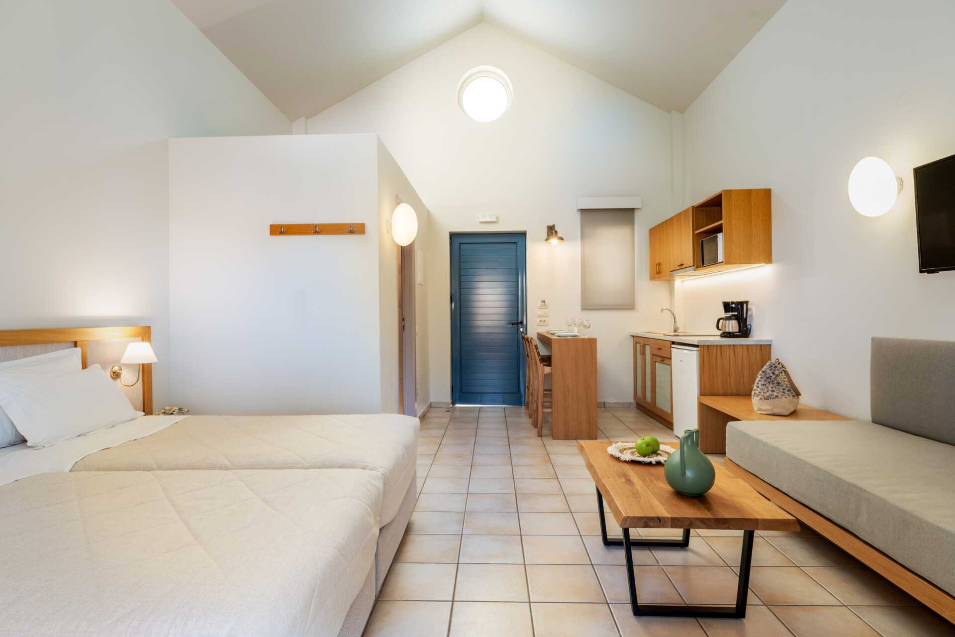 1-værelses lejligheder med balkon eller balkon i stueplan, nogle med pooludsigt. To enkeltsenge. Kombineret opholdsrum og minikøkken med kogeplader, køleskab, kaffemaskine, toaster og enkelt køkkenudstyr. Mulighed for ekstra opredning i sovesofa. Gratis wifi, aircondition og deponering. Tv med lokale kanaler. Hårtørrer. Badeværelse med bruser og toilet. I lejlighederne med pooludsigt skal 3. person være et barn. Rengøring 6 gange om ugen.