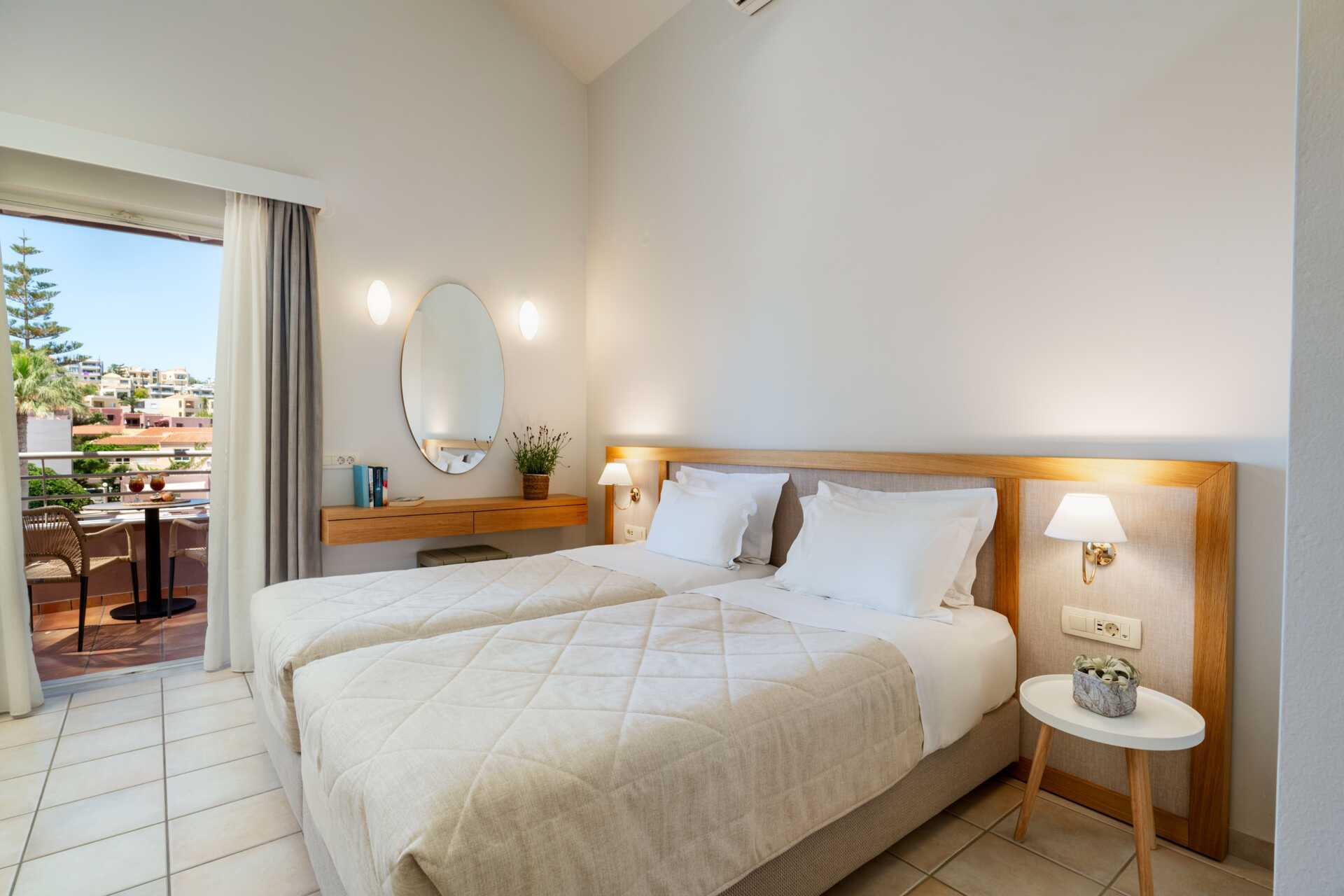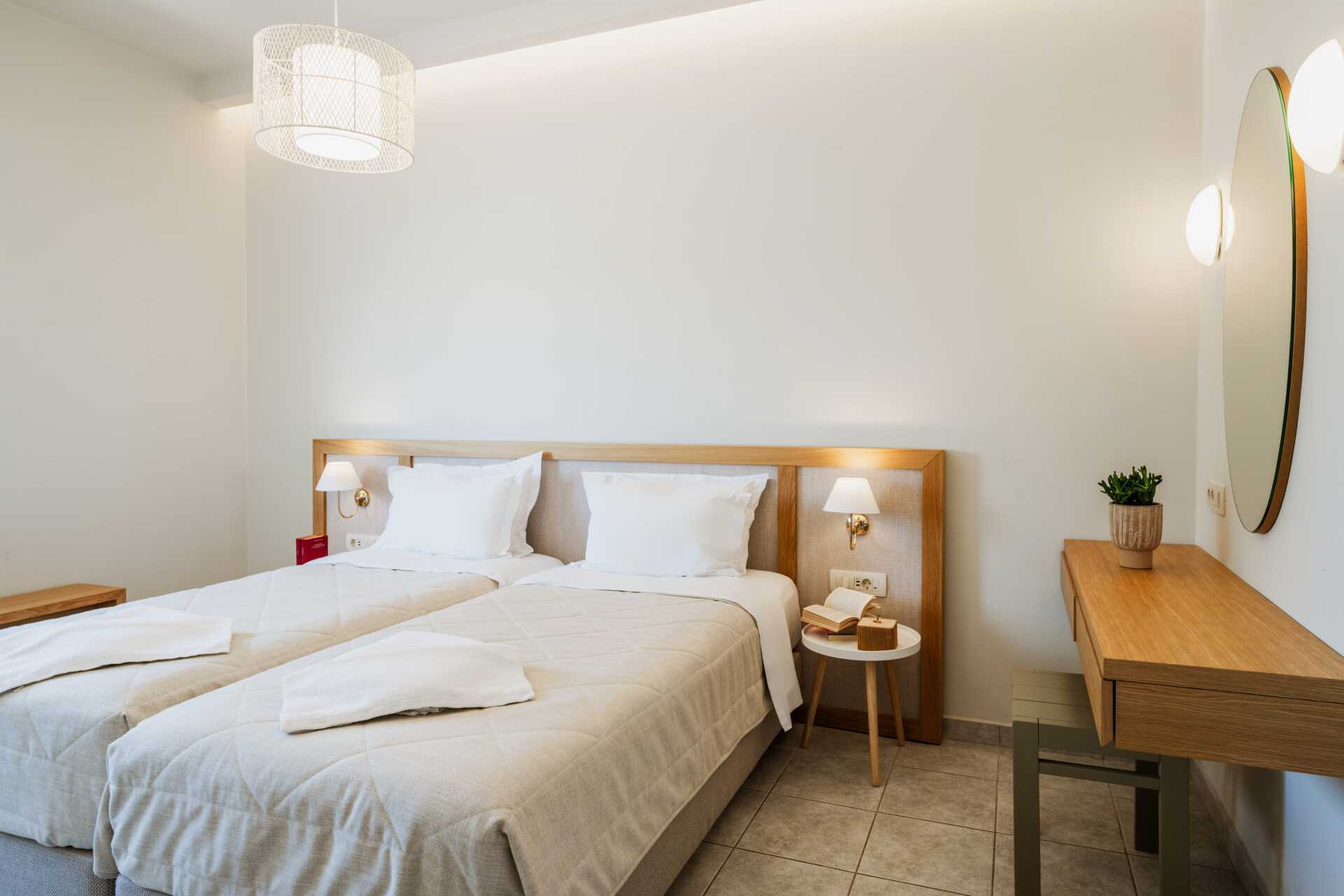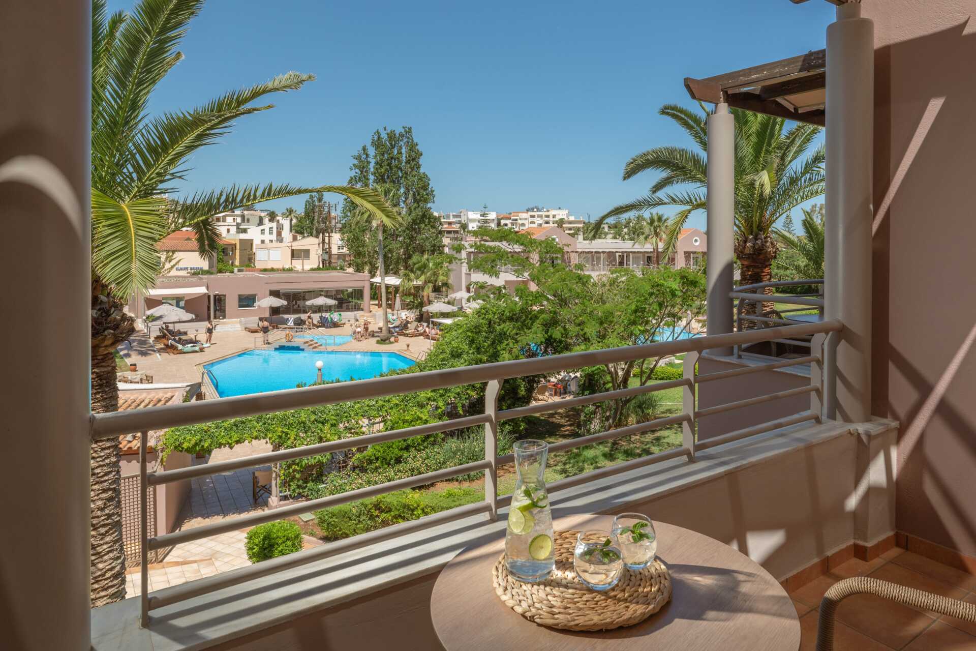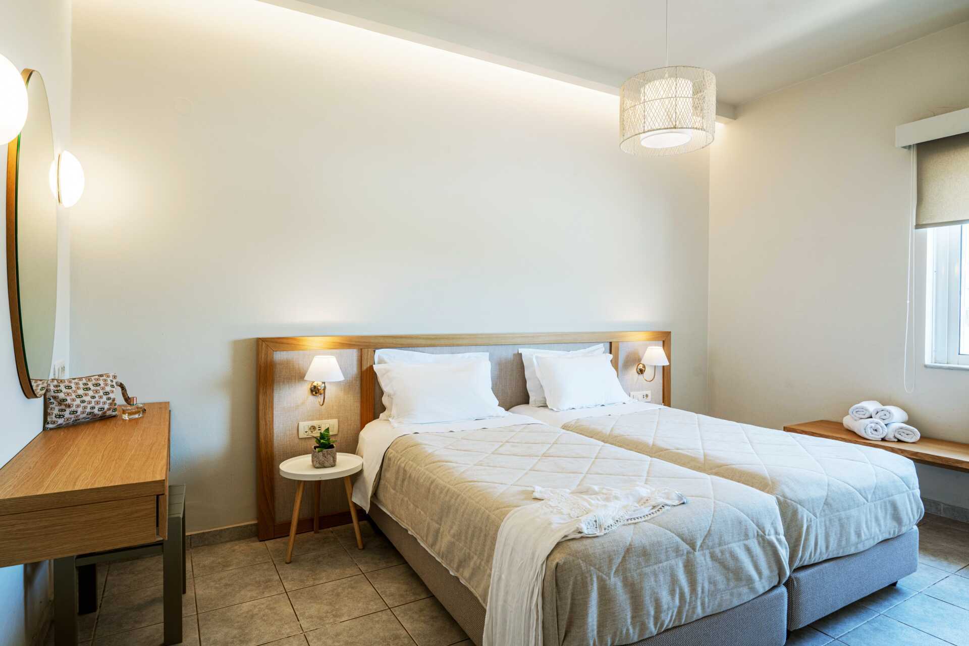 1-værelses lejligheder med balkon eller balkon i stueplan, nogle med pooludsigt. To enkeltsenge. Kombineret opholdsrum og minikøkken med kogeplader, køleskab, kaffemaskine, toaster og enkelt køkkenudstyr. Mulighed for ekstra opredning i sovesofa. Gratis wifi, aircondition og deponering. Tv med lokale kanaler. Hårtørrer. Badeværelse med bruser og toilet. I lejlighederne med pooludsigt skal 3. person være et barn. Rengøring 6 gange om ugen.