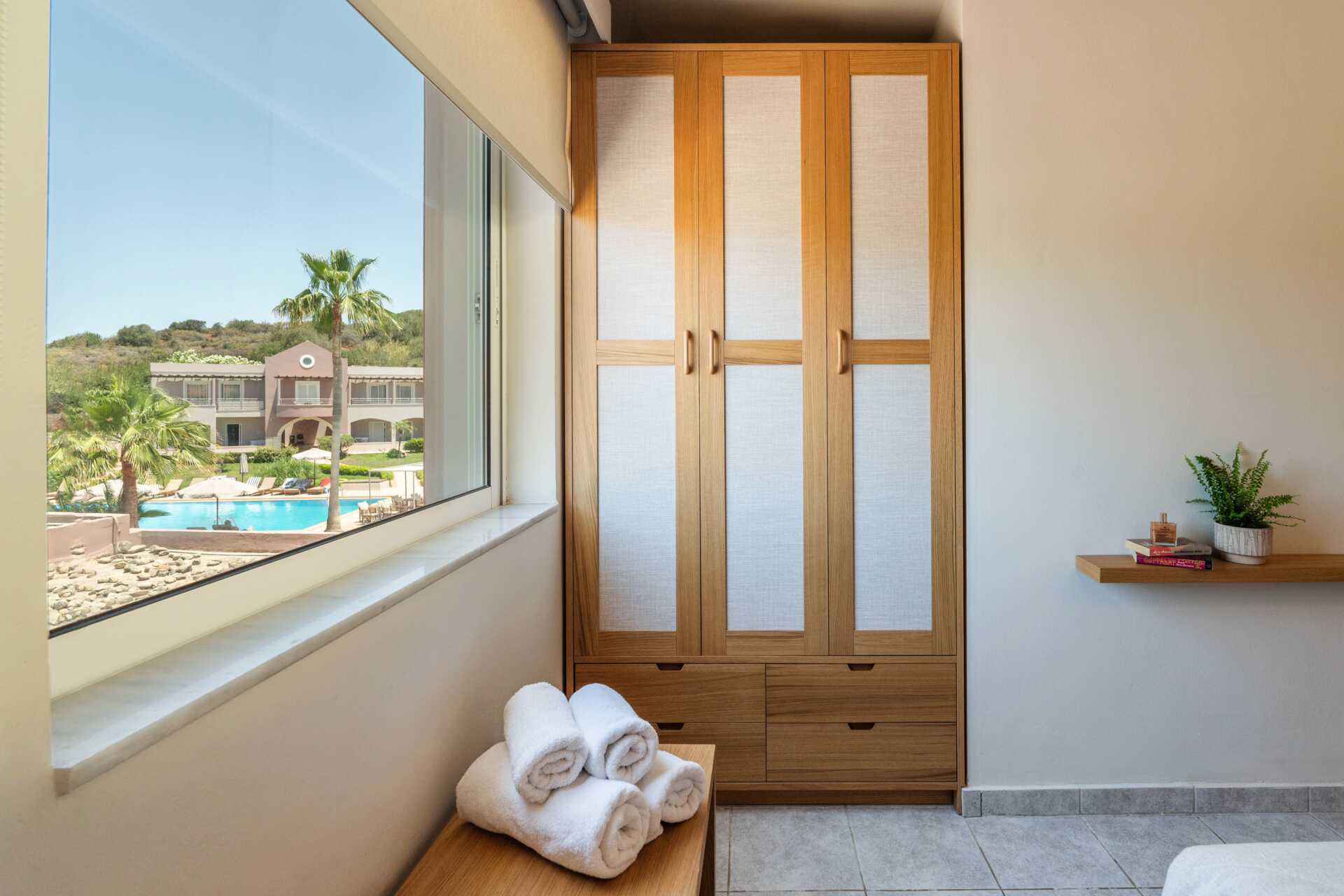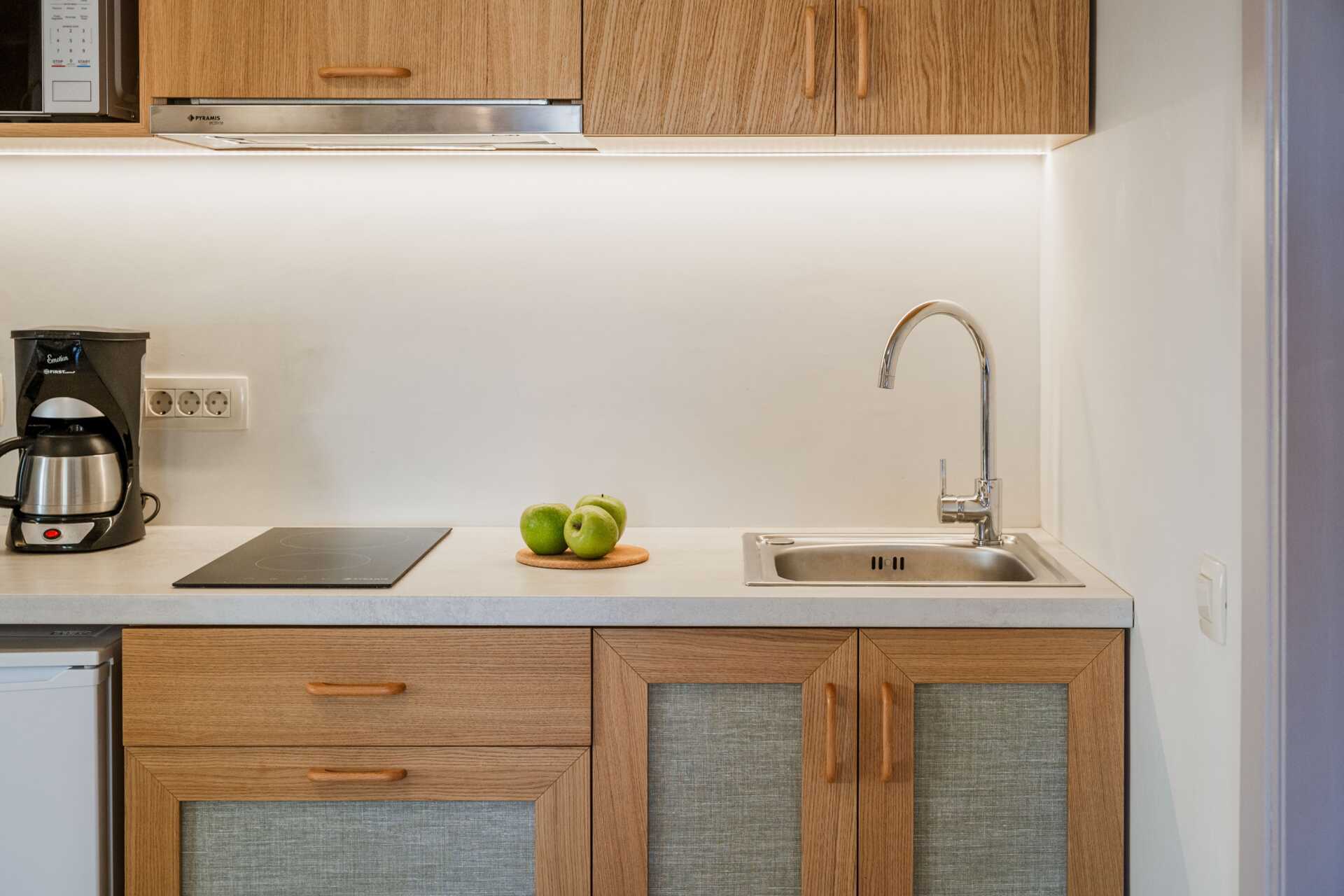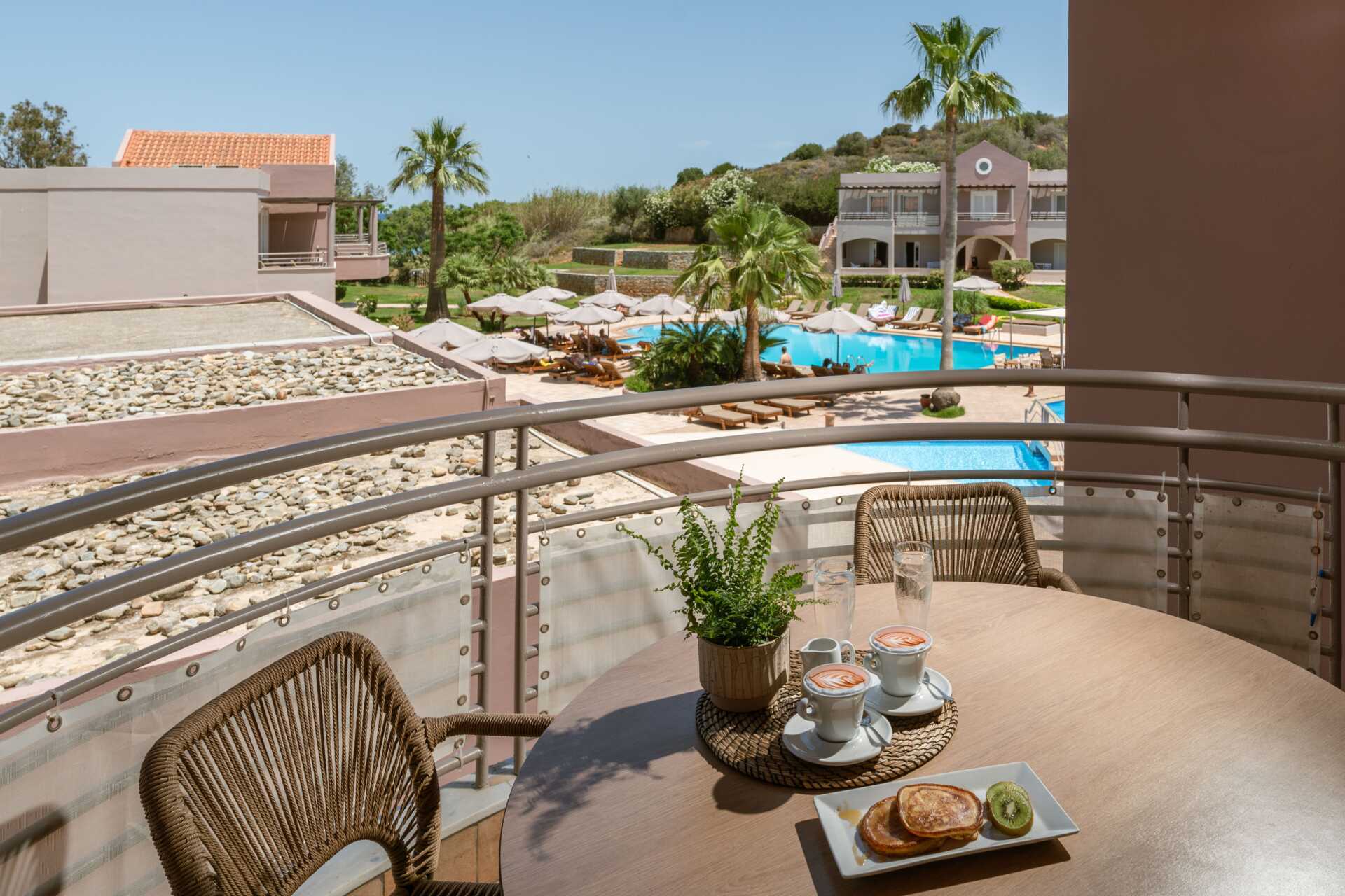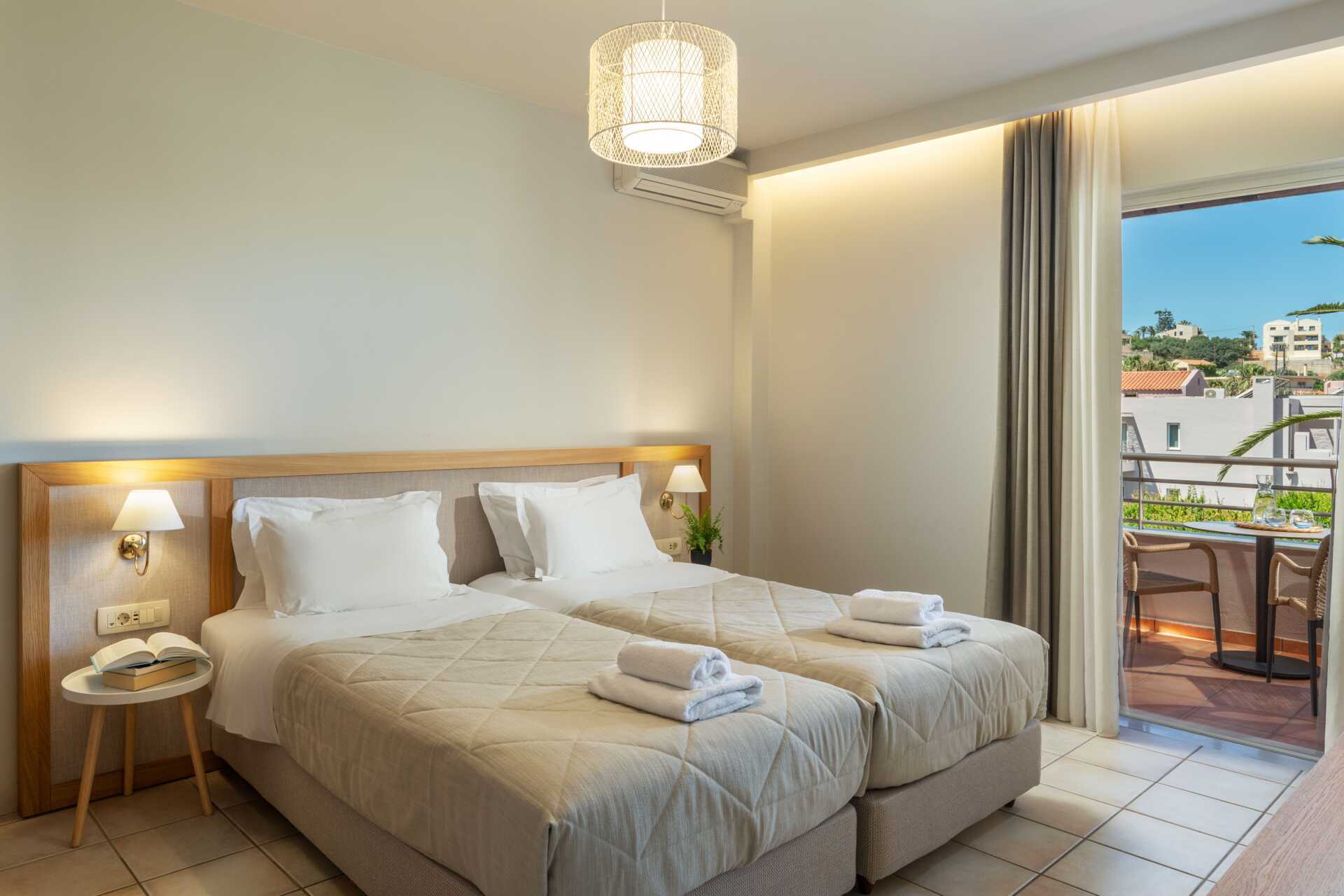 1-værelses lejligheder med balkon eller balkon i stueplan, nogle med pooludsigt. To enkeltsenge. Kombineret opholdsrum og minikøkken med kogeplader, køleskab, kaffemaskine, toaster og enkelt køkkenudstyr. Mulighed for ekstra opredning i sovesofa. Gratis wifi, aircondition og deponering. Tv med lokale kanaler. Hårtørrer. Badeværelse med bruser og toilet. I lejlighederne med pooludsigt skal 3. person være et barn. Rengøring 6 gange om ugen.
