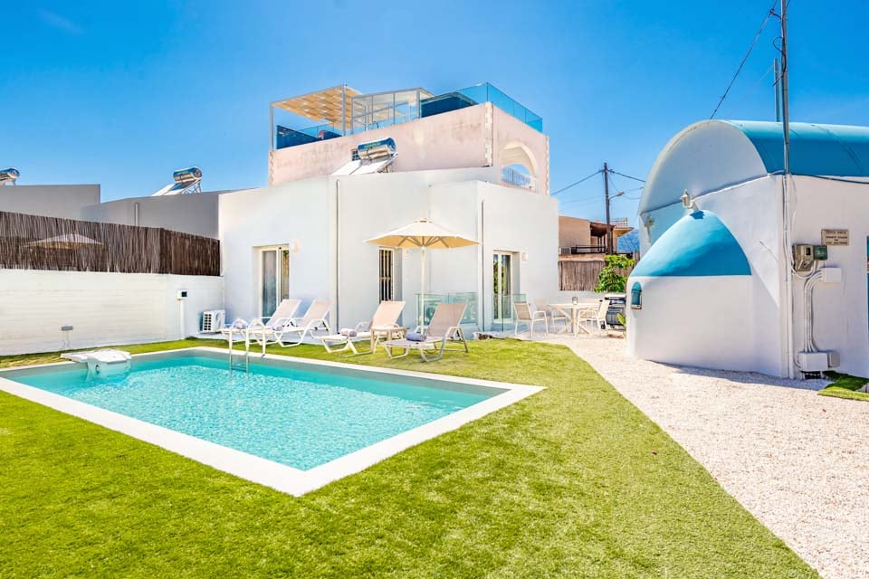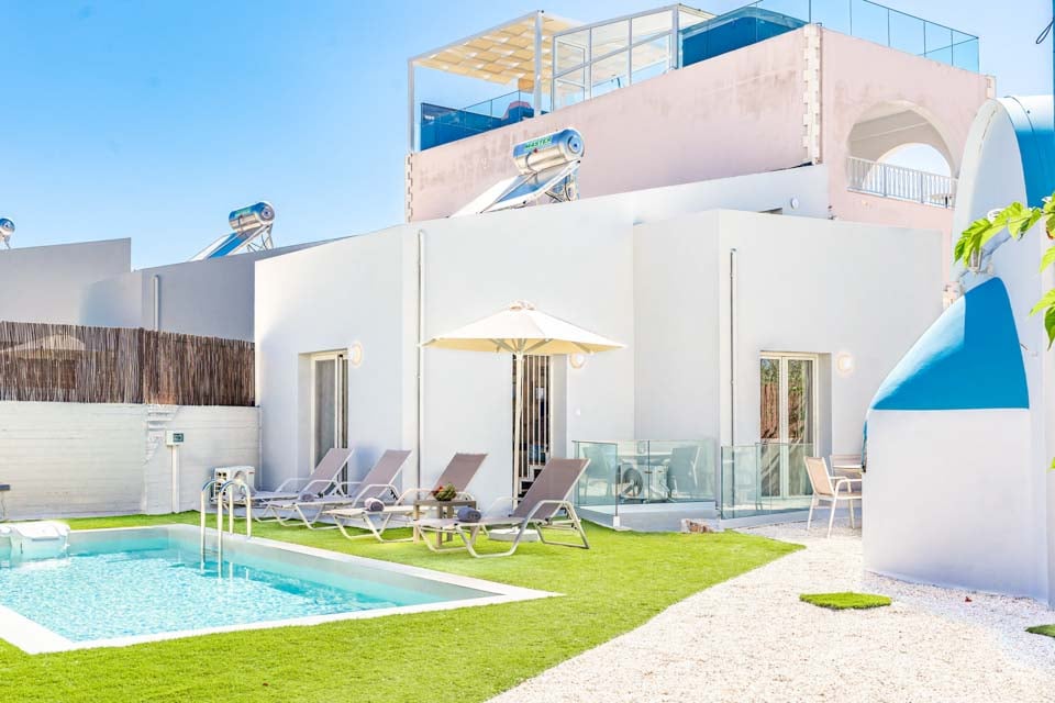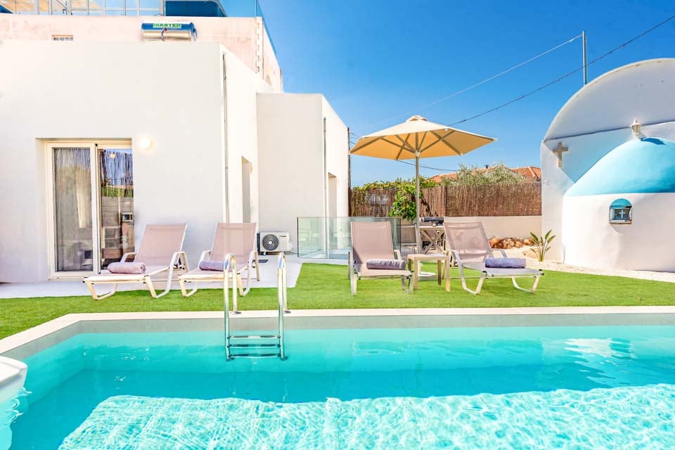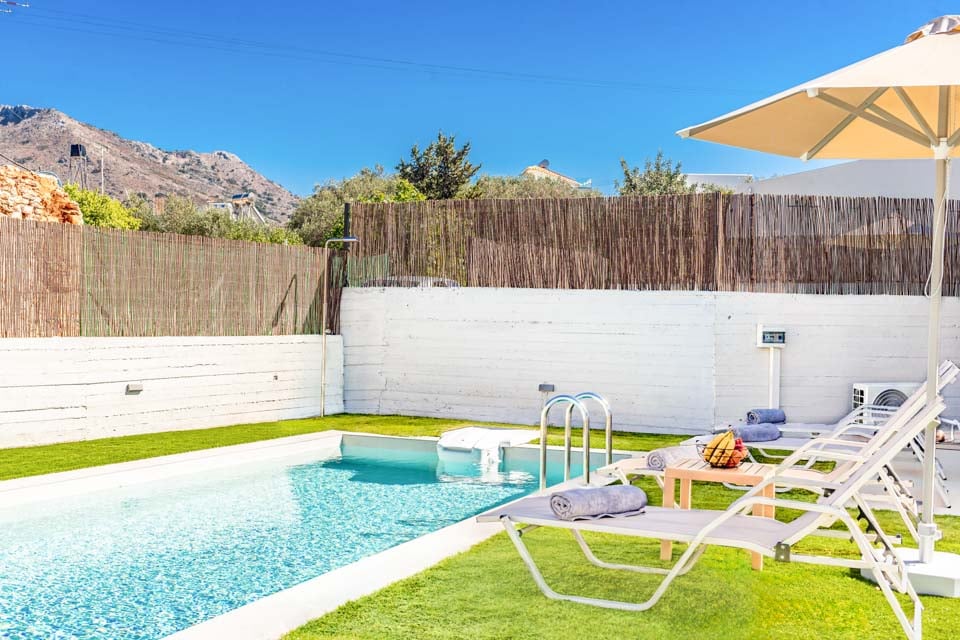 Uanset tidspunktet er det altid det perfekte tidspunkt at tage et plask i din private pool. Nyd det kølige og forfriskende vand, mens det skyller alle dine bekymringer væk. Du vil hurtigt glemme alle dine hverdagsstress, når du slapper af i din private oase. Med den klare blå himmel som spejl er følelsen af solen på din hud, der varmer dig op på de smukke græske eftermiddage, virkelig uovertruffen. Der er intet bedre sted at arbejde på din solbrunhed end her! Nyd liggestolene ved poolen, når du bare har lyst til at slappe af uden at blive gennemblødt – perfekt til en doven eftermiddag i den dejlige varme.