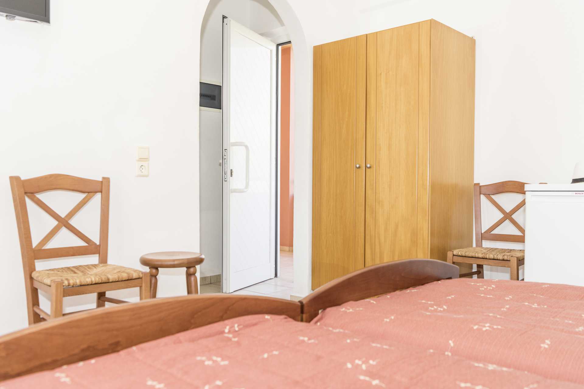 Dobbeltværelse med balkon eller balkon i stueplan. En dobbeltseng eller to enkeltsenge. Gratis aircondition og deponering. Gratis wifi og kan tilgås afhængigt af hvor du bor på hotellet, og fungerer normalt bedst på balkonen. Køleskab. Tv. Badekar/bruser og toilet. Rengøring 6 gange om ugen.