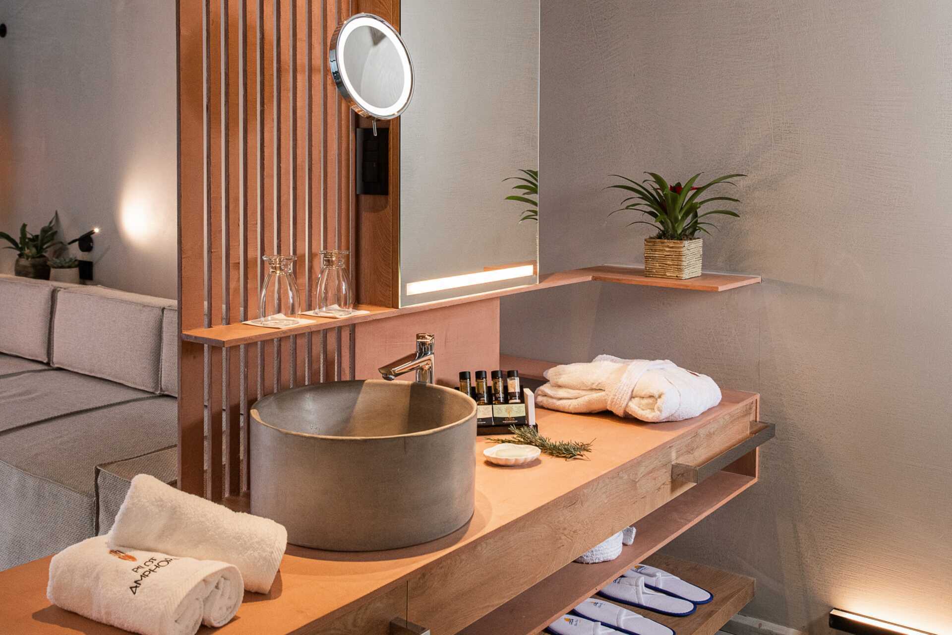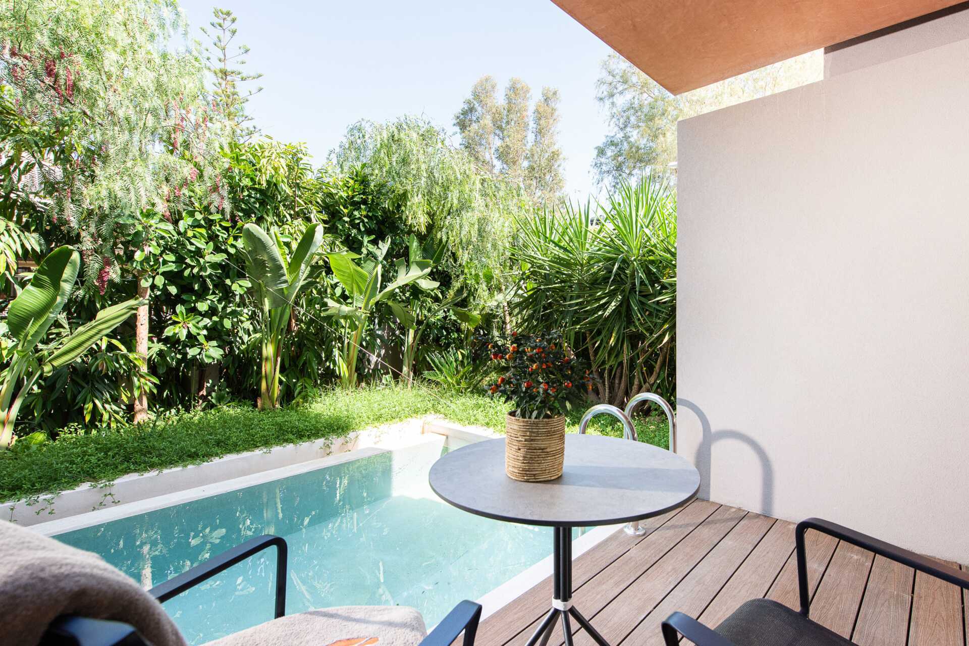 Dobbeltværelser med terrasse og privat pool. På terrassen er der borde og stole og en stige ned i poolen. En dobbeltseng eller to enkeltsenge. Gratis wifi, aircondition og deponering. Minibar. Nespresso maskine, kabler medfølger. Tv med internationale kanaler. Hårtørrer. Glasdør mellem soveværelse og badeværelse. Frostede glasvægge til bad og toilet. Rengøring 7 gange om ugen.
