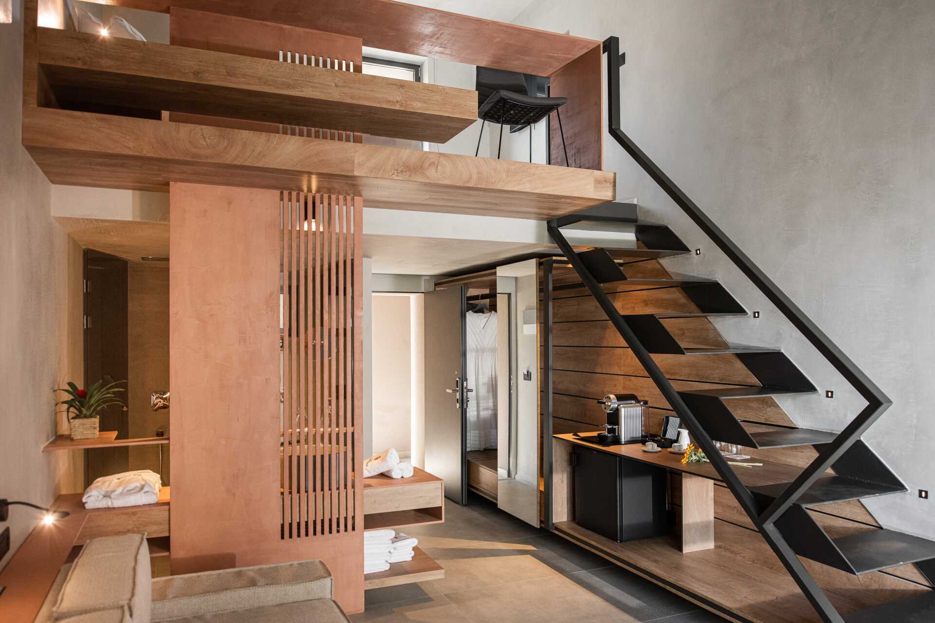Dobbeltværelser i etage med balkon. I stueplan findes et opholdsrum med mulighed for ekstra opredninger i sovesofa og åben planløsning til badeværelse med matteret glasdøre til brus og toilet. En trappe op er der hems med dobbeltseng. Gratis wifi, aircondition og deponering. Minibar. Nespresso maskine, kapsler medfølger. Tv med internationale kanaler. Glasdør mellem soveværelse og badeværelse. Rengøring 7 gange om ugen.