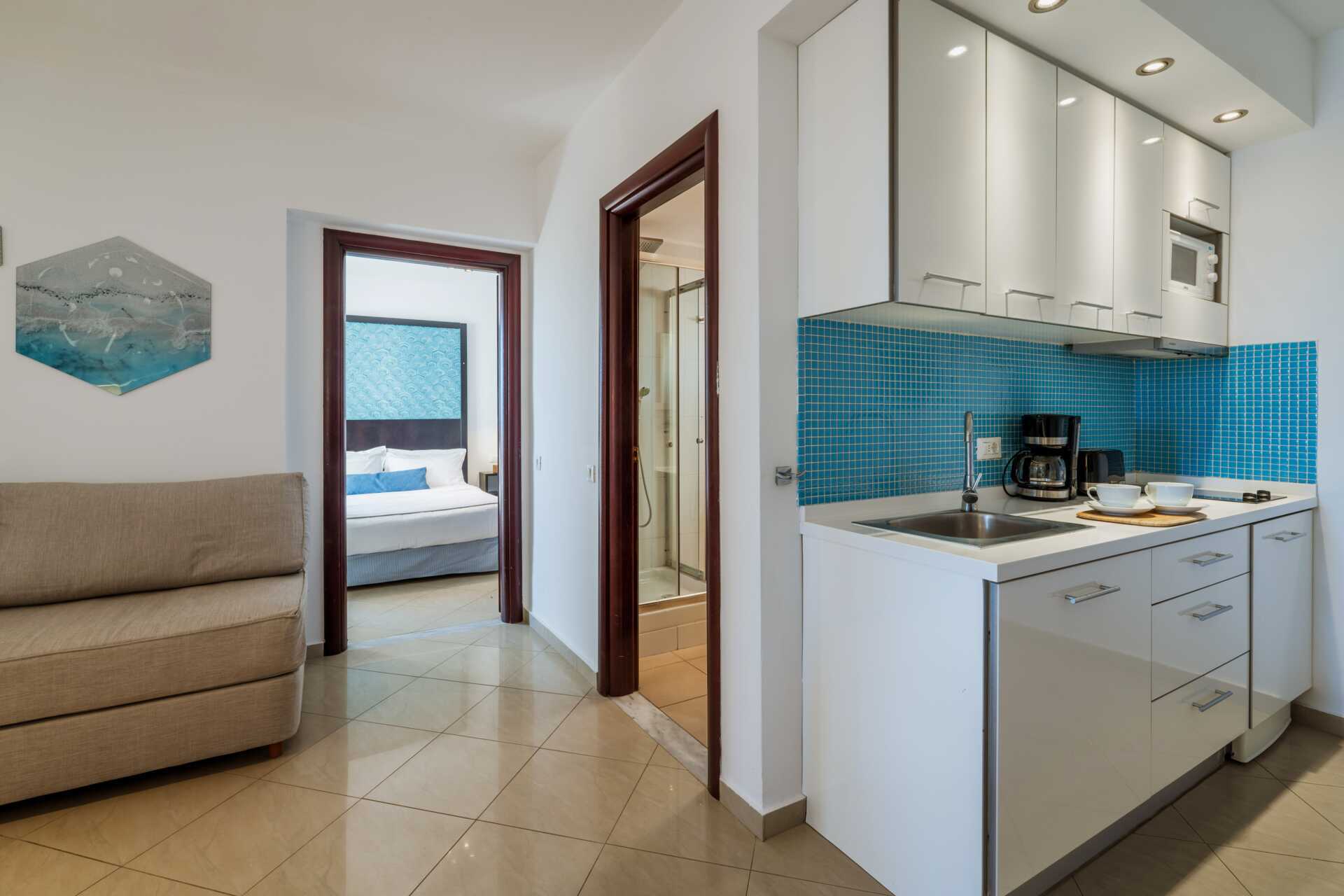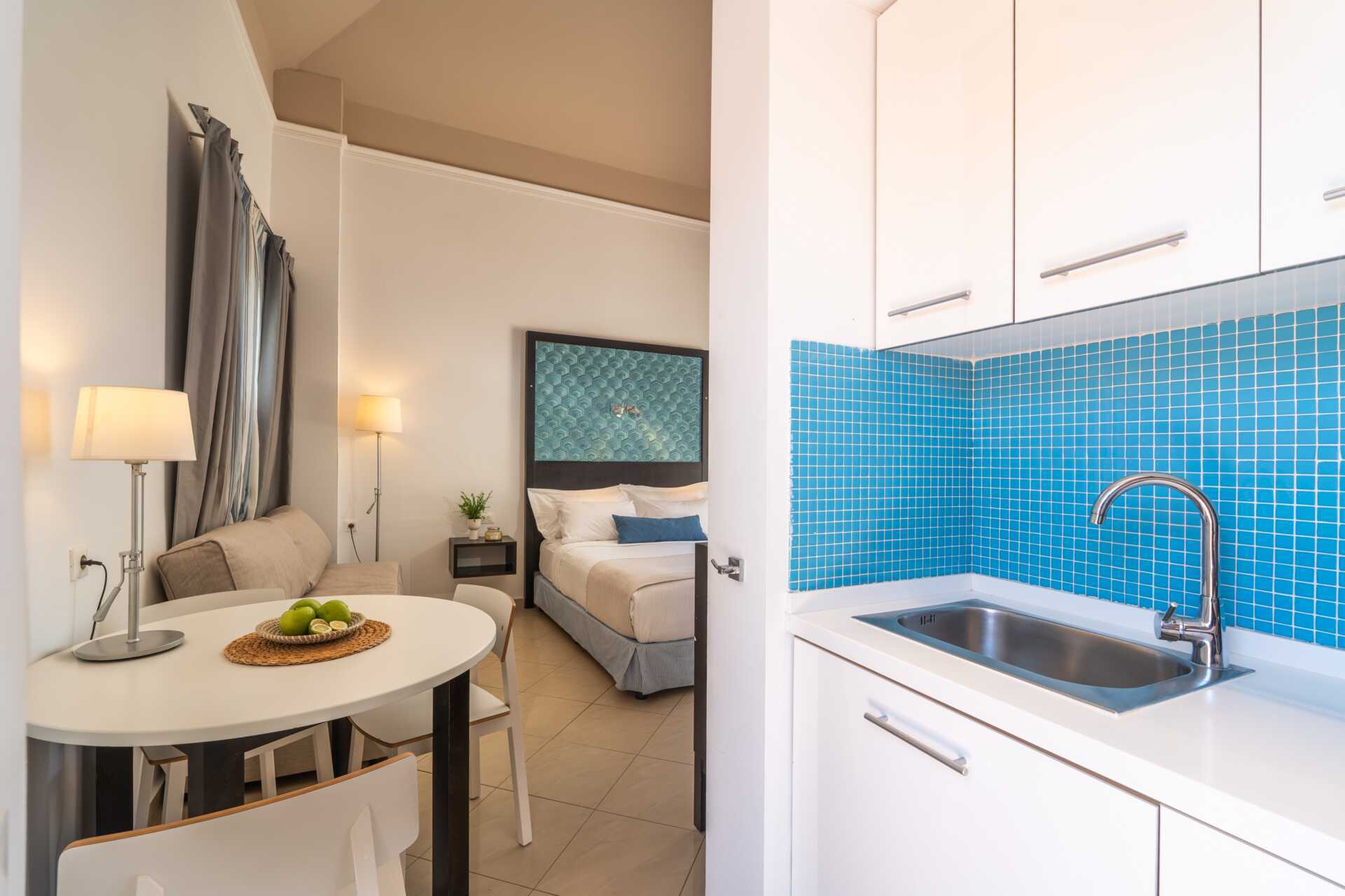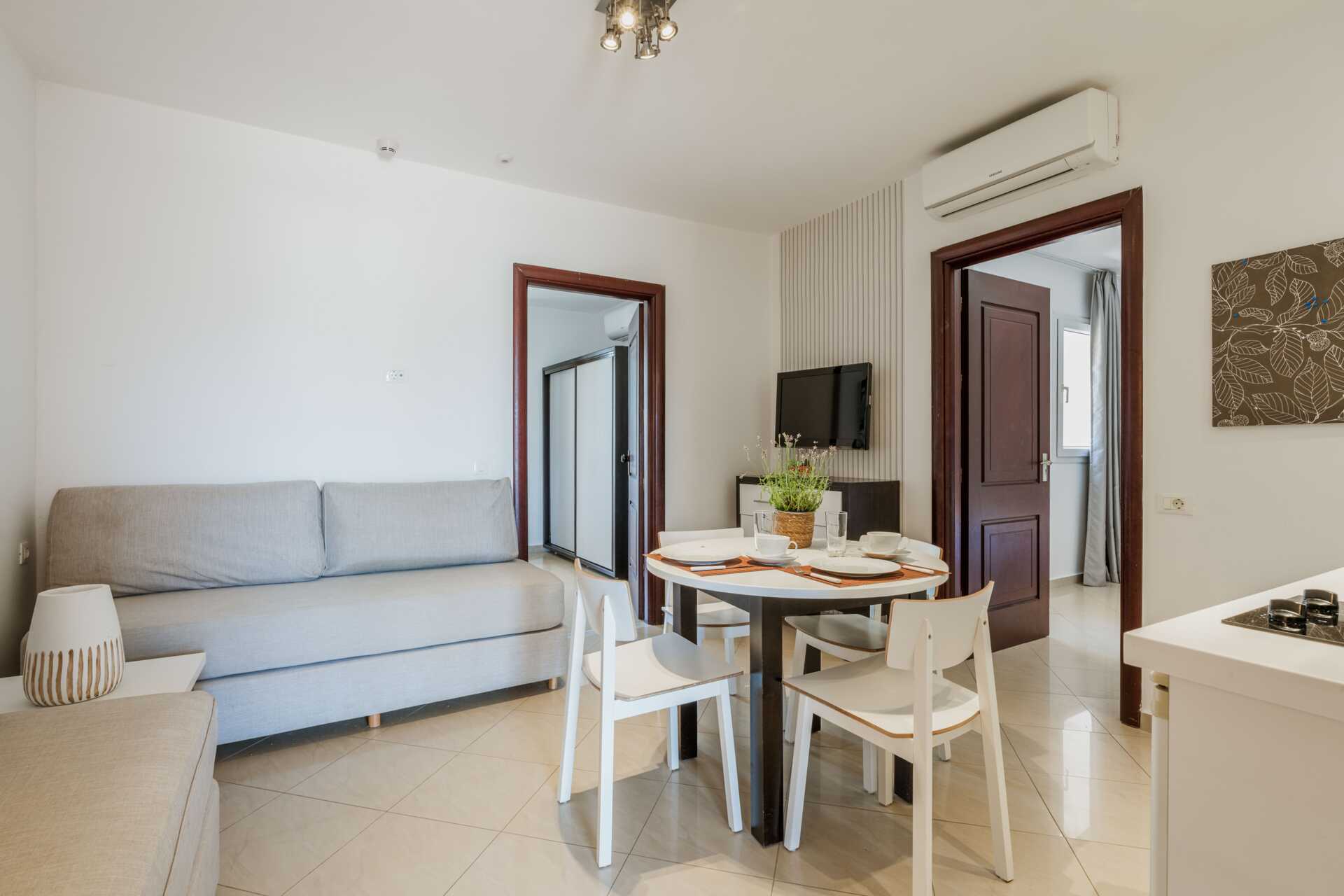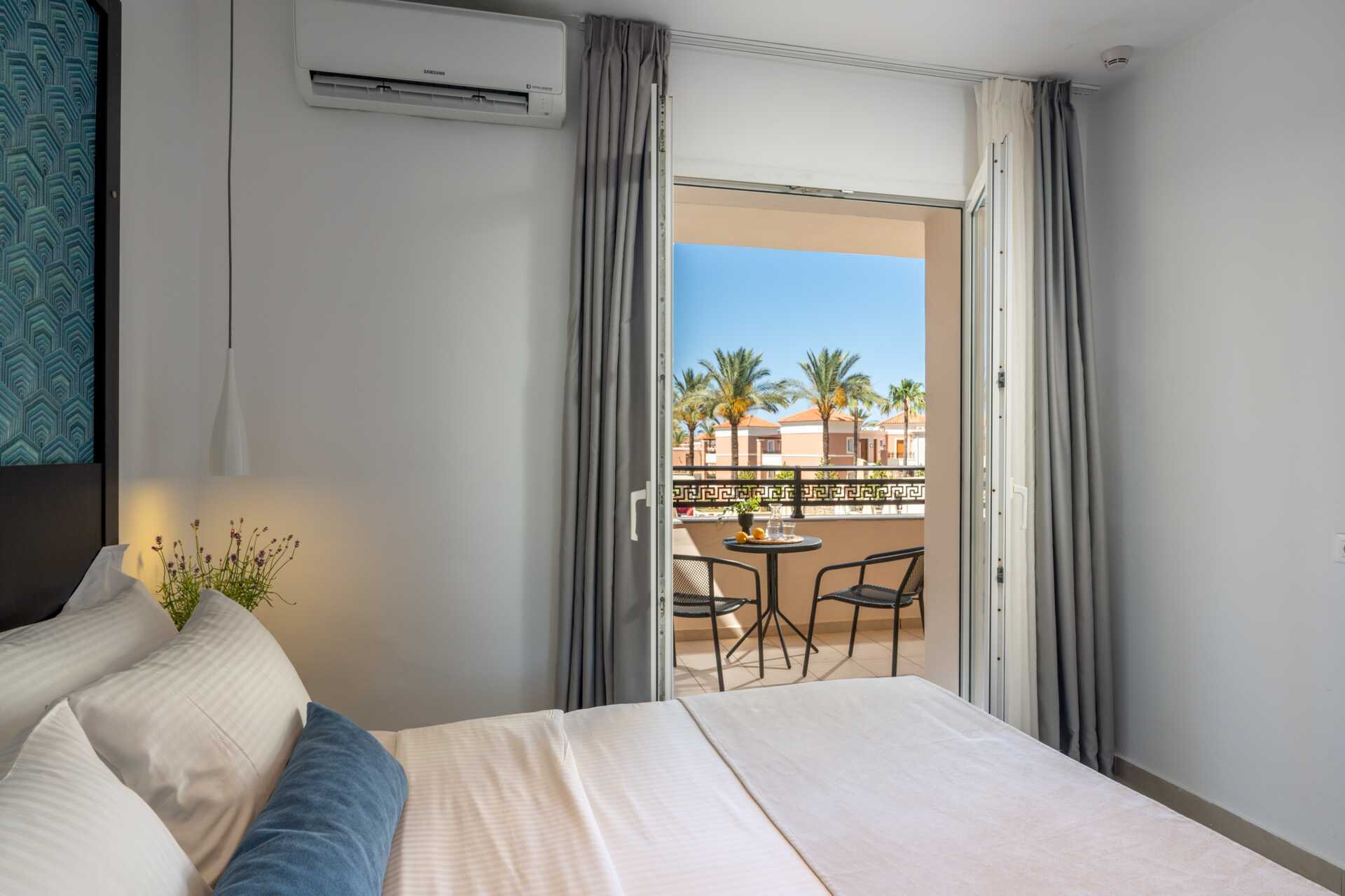 2-værelses lejlighed med balkon, nogle med havudsigt eller med delvis havudsigt. Lejlighederne er beliggende i Aphrodite-delen af hotellet tættere på havet. Værelserne for op til tre personer er ca. 28-30 kvm, værelserne for op til fire personer på omkring 30-40 kvm. Soveværelse og kombineret opholdsrum/minikøkken. En dobbeltseng. Mulighed for ekstra opredning i sovesofa. Minikøkken med køleskab, kogeplader, kaffemaskine, el-kedel, brødrister og enkelt køkkenudstyr. Gratis wifi, aircondition og deponering. Tv med internationale kanaler. Hårtørrer. Badeværelse med bruser og toilet. Rengøring 6 gange om ugen.