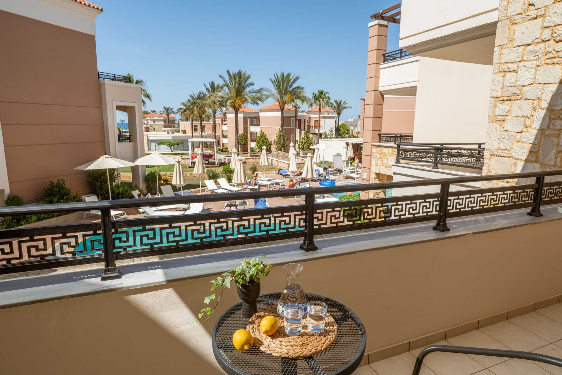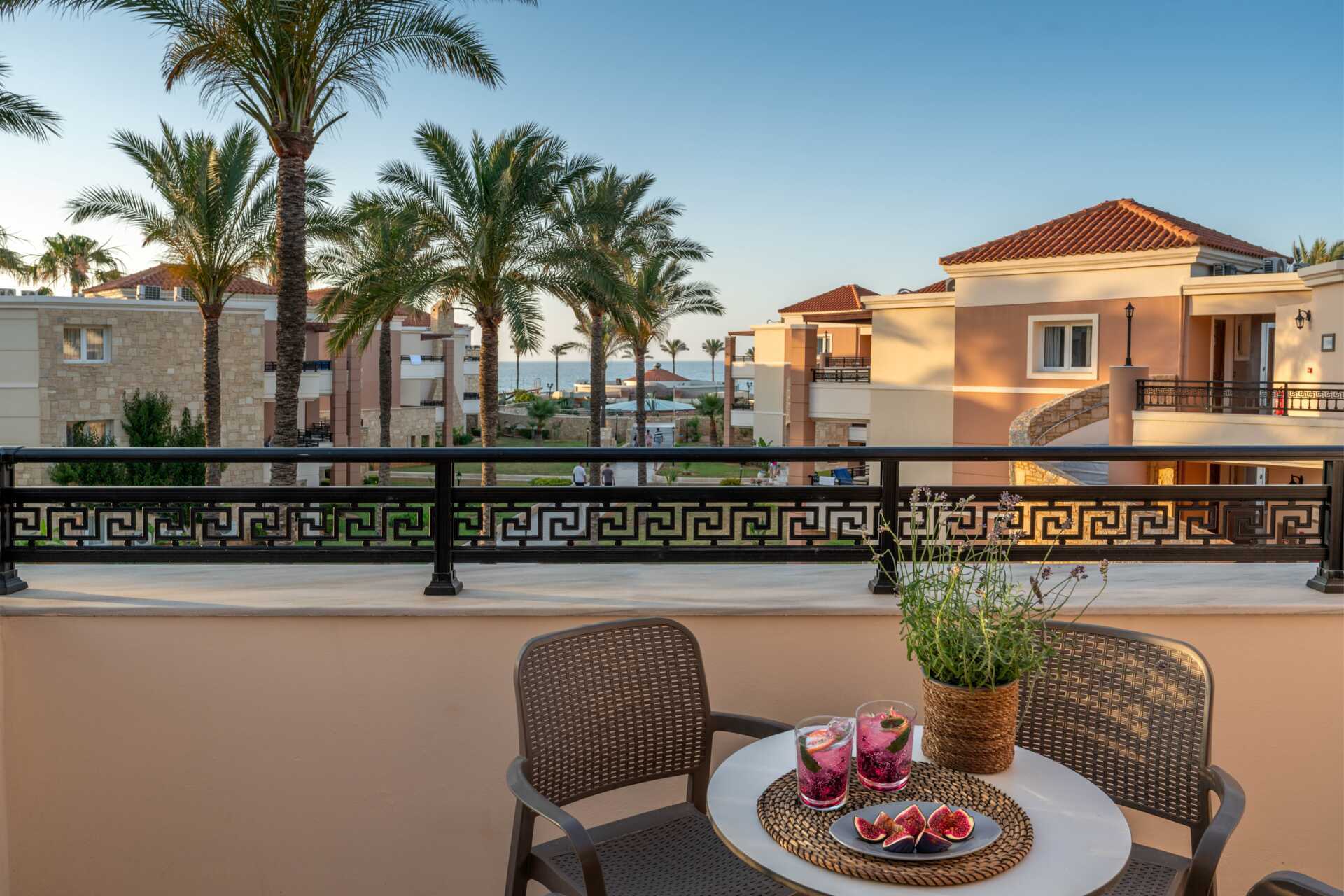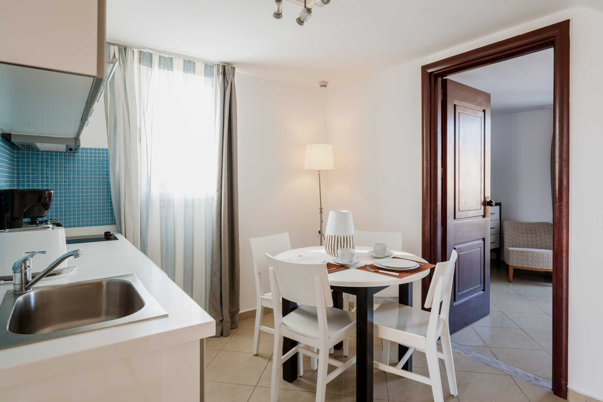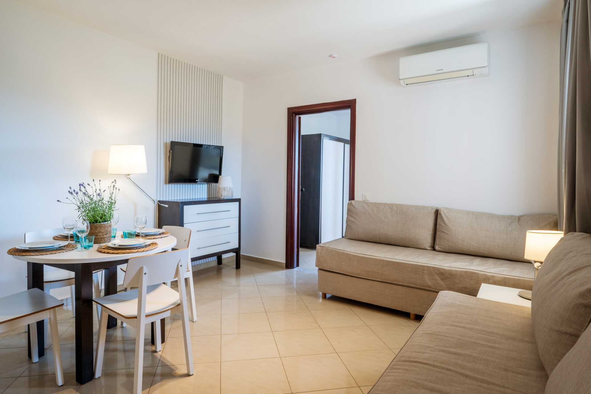 2-værelses lejlighed med balkon, nogle med havudsigt eller med delvis havudsigt. Lejlighederne er beliggende i Aphrodite-delen af hotellet tættere på havet. Værelserne for op til tre personer er ca. 28-30 kvm, værelserne for op til fire personer på omkring 30-40 kvm. Soveværelse og kombineret opholdsrum/minikøkken. En dobbeltseng. Mulighed for ekstra opredning i sovesofa. Minikøkken med køleskab, kogeplader, kaffemaskine, el-kedel, brødrister og enkelt køkkenudstyr. Gratis wifi, aircondition og deponering. Tv med internationale kanaler. Hårtørrer. Badeværelse med bruser og toilet. Rengøring 6 gange om ugen.