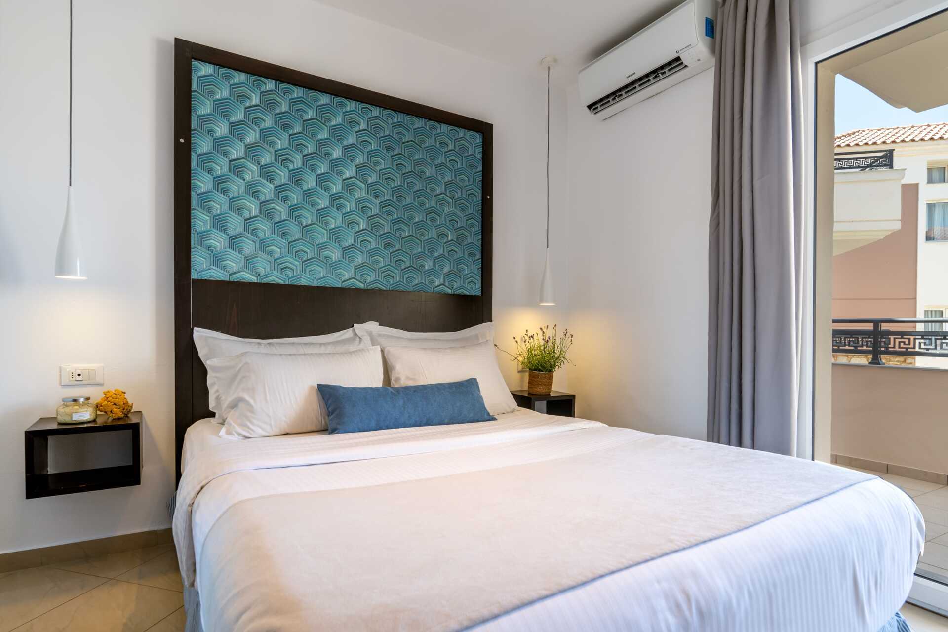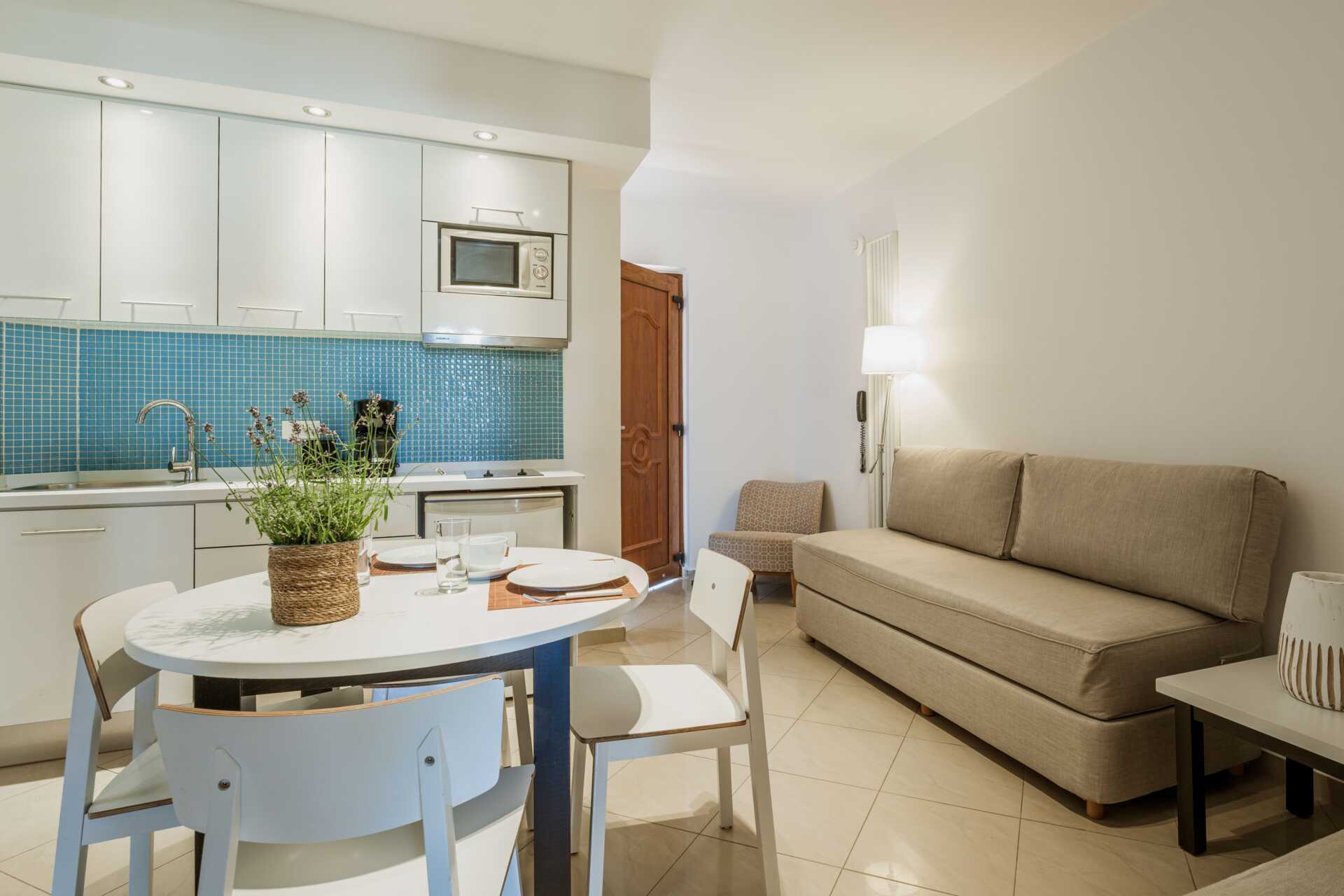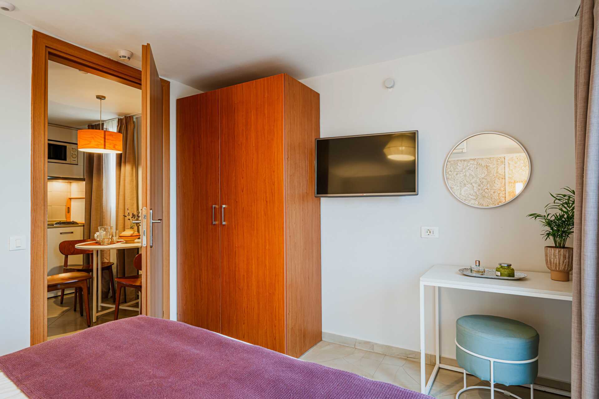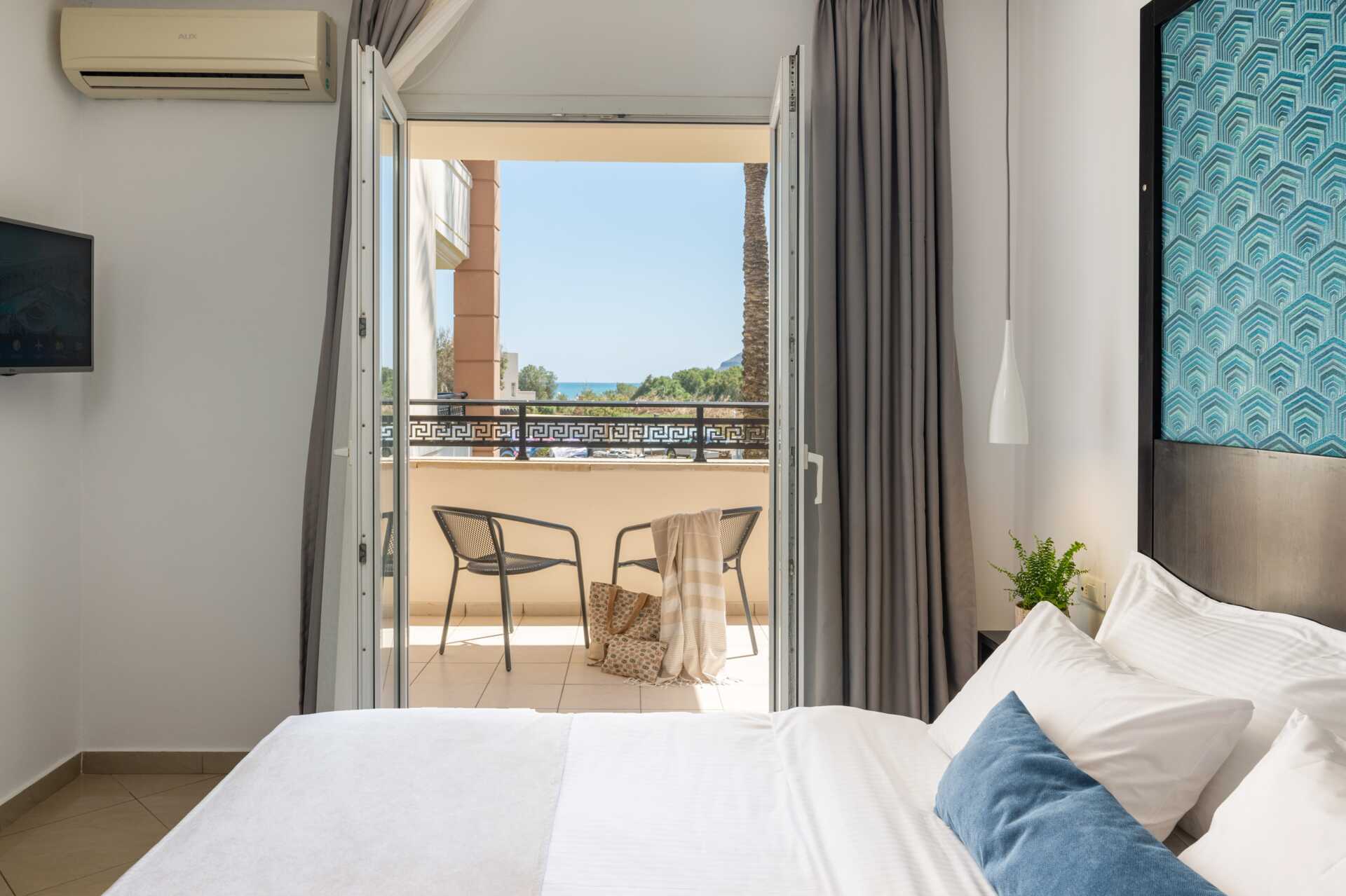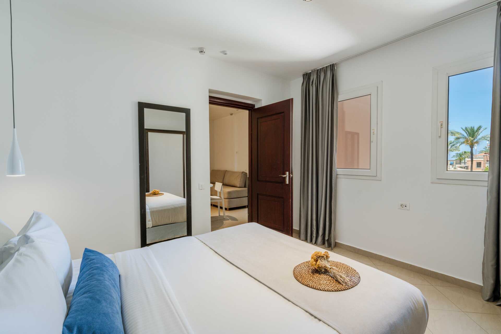 2-værelses lejlighed med balkon, nogle med havudsigt eller med delvis havudsigt. Lejlighederne er beliggende i Aphrodite-delen af hotellet tættere på havet. Værelserne for op til tre personer er ca. 28-30 kvm, værelserne for op til fire personer på omkring 30-40 kvm. Soveværelse og kombineret opholdsrum/minikøkken. En dobbeltseng. Mulighed for ekstra opredning i sovesofa. Minikøkken med køleskab, kogeplader, kaffemaskine, el-kedel, brødrister og enkelt køkkenudstyr. Gratis wifi, aircondition og deponering. Tv med internationale kanaler. Hårtørrer. Badeværelse med bruser og toilet. Rengøring 6 gange om ugen.