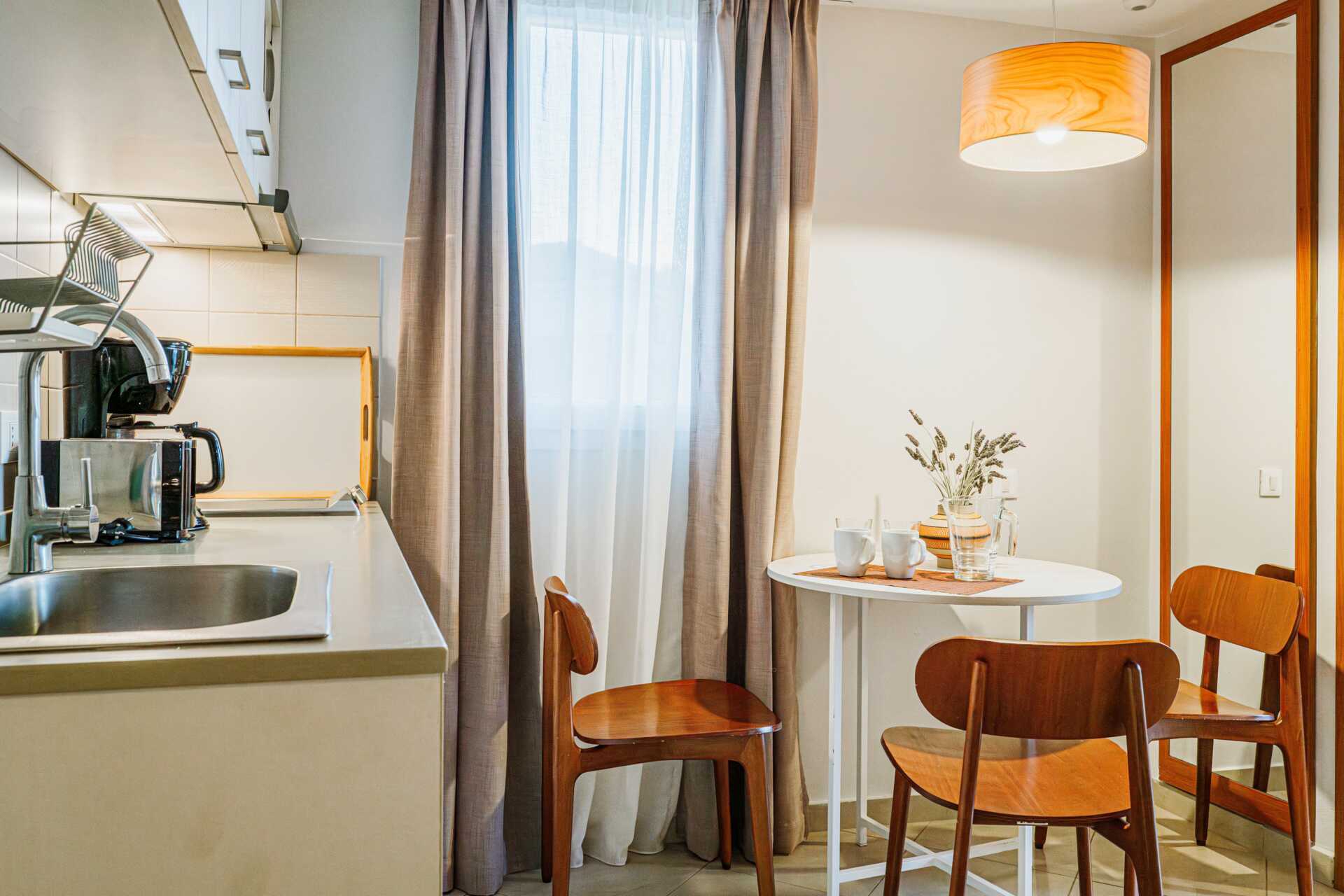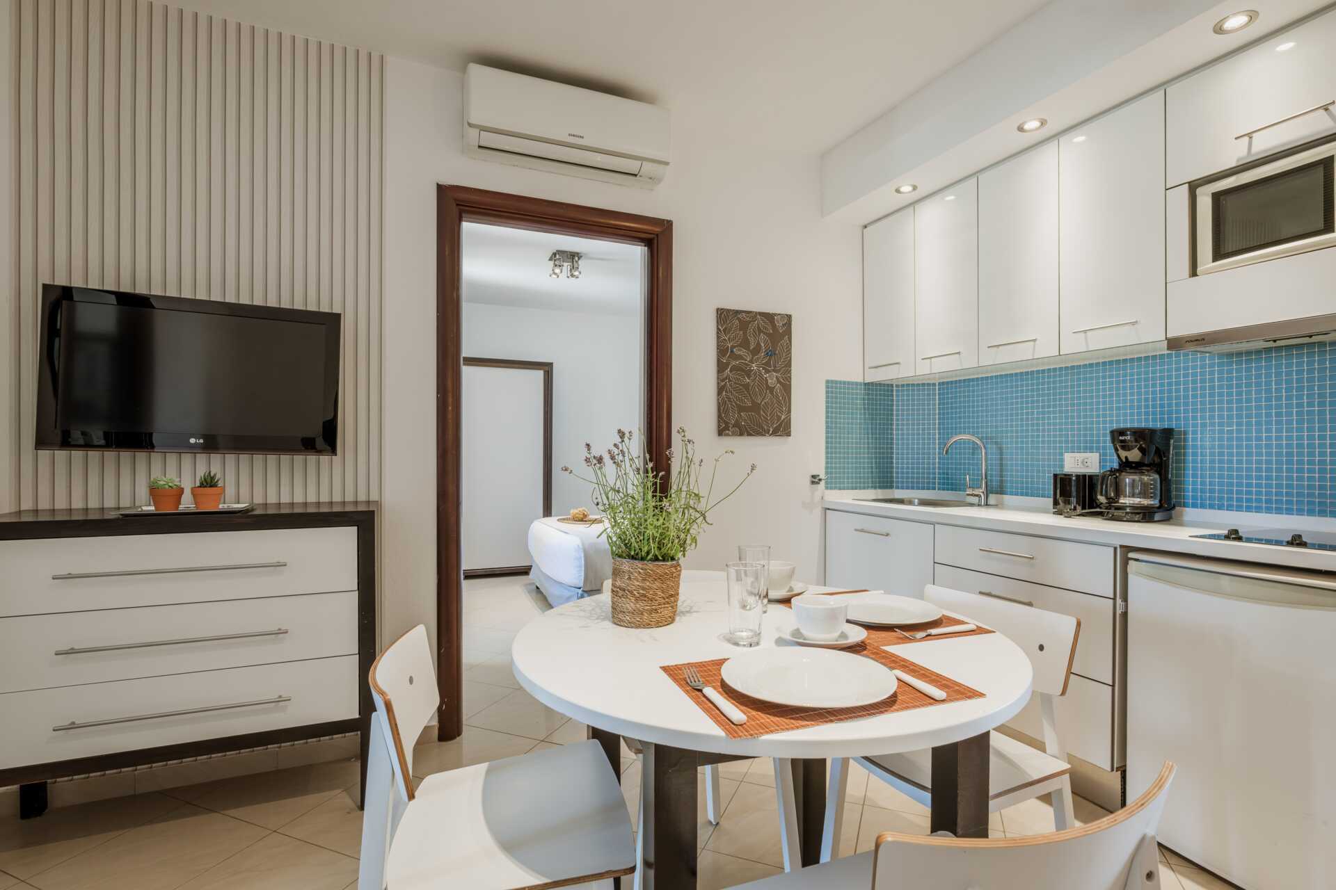 1-værelses lejlighed med balkon, nogle med pooludsigt. Lejlighederne ligger i Olympus-delen af hotellet. Soveværelse kombineret med minikøkken. En dobbeltseng. Mulighed for ekstra opredning i sovesofa. Minikøkken med køleskab, kogeplader, kaffemaskine, el-kedel, brødrister og enkelt køkkenudstyr. Gratis wifi, aircondition og deponering. Tv med internationale kanaler. Hårtørrer. Badeværelse med bruser og toilet. Rengøring 6 gange om ugen.