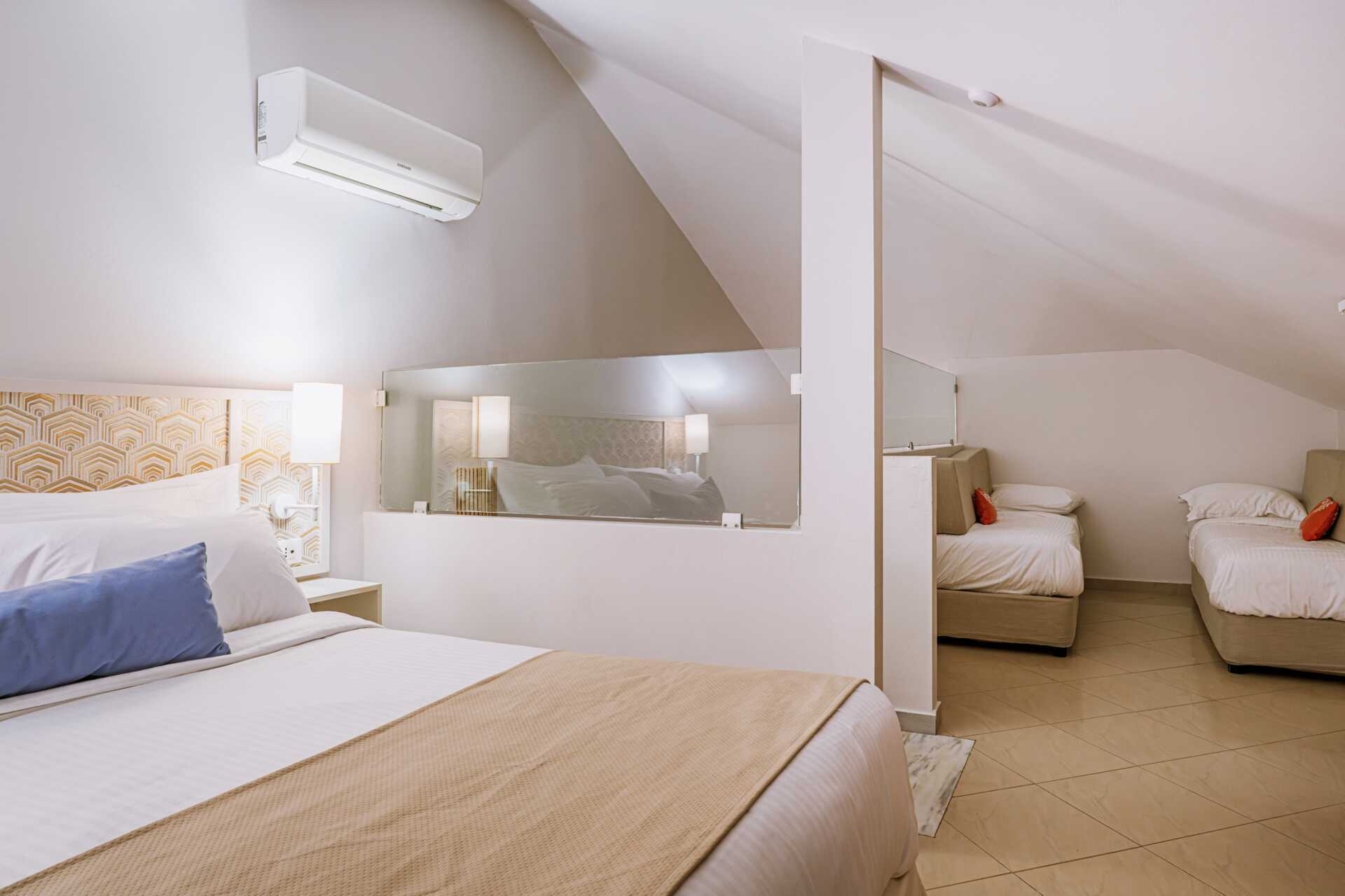 3-værelses lejlighed med balkon og pooludsigt. Lejlighederne ligger i Olympus-delen af hotellet. To soveværelser og kombineret opholdsrum med minikøkken. En dobbeltseng i hvert soveværelse. Mulighed for ekstra opredninger i sovesofa. Minikøkken med køleskab, kogeplader, kaffemaskine, el-kedel, brødrister og enkelt køkkenudstyr. Gratis wifi, aircondition og deponering. Tv med internationale kanaler. Hårtørrer. Badeværelse med bruser og toilet. Rengøring 6 gange om ugen.