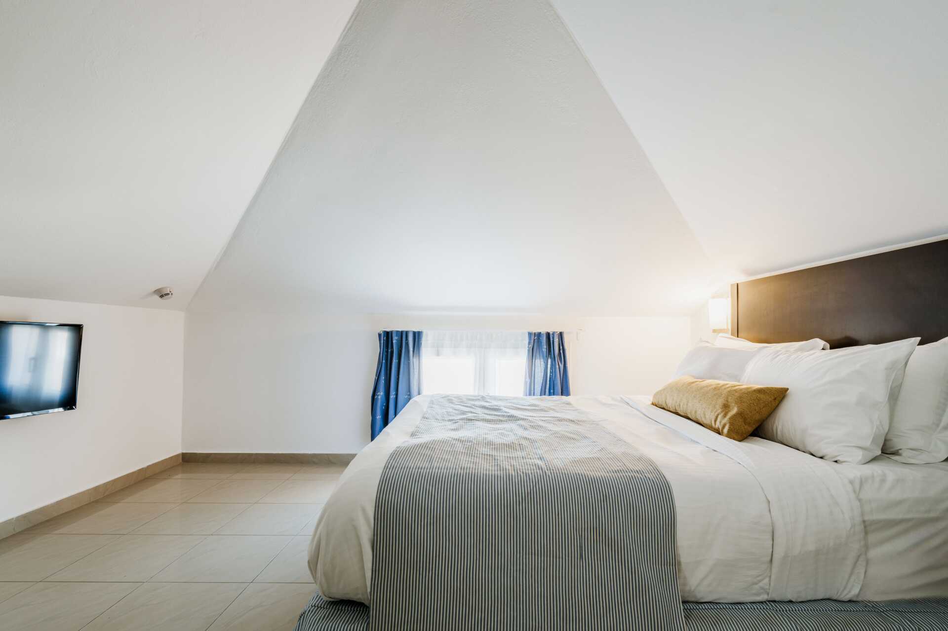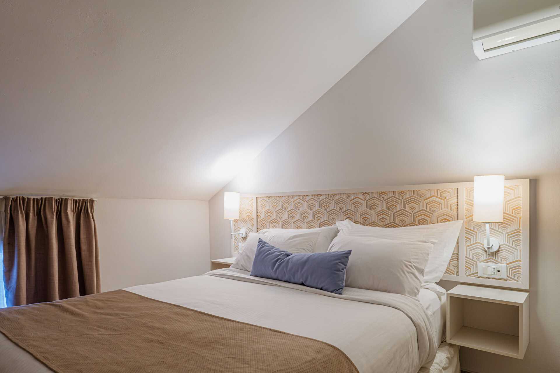 2-værelses lejlighed i etage med balkon eller terrasse. Denne lejlighedstype fås både i Olympus-delen og Afrodite-delen, tættere på havet. I entréplan er der minikøkken og soveværelse med dobbeltseng. Ovenpå er der mulighed for ekstra opredninger i sovesofaer på hems. Minikøkken med køleskab, kogeplader, kaffemaskine, el-kedel, brødrister og enkelt køkkenudstyr. Gratis wifi, aircondition og deponering. Tv med internationale kanaler. Hårtørrer. Badeværelse med bruser og toilet. Rengøring 6 gange om ugen.