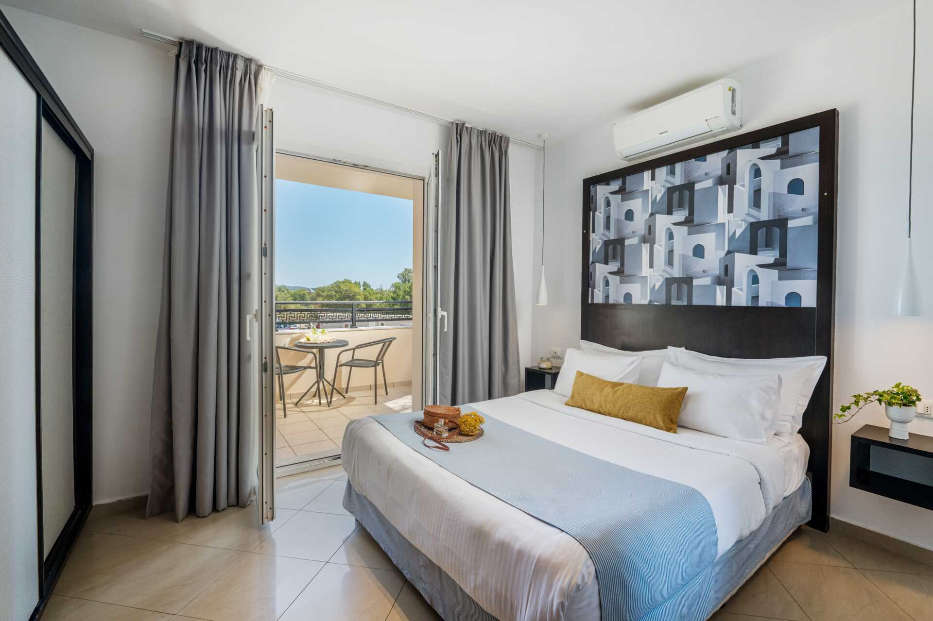2-værelses lejlighed med balkon, nogle med delvis havudsigt eller med havudsigt. Lejlighederne er beliggende i Aphrodite-delen af hotellet tættere på havet. I entréplan er der minikøkken og soveværelse med dobbeltseng. Ovenpå er der mulighed for ekstra opredninger i sovesofaer på hems. Minikøkken med køleskab, kogeplader, kaffemaskine, el-kedel, brødrister og enkelt køkkenudstyr. Gratis wifi, aircondition og deponering. Tv med internationale kanaler. Hårtørrer. Badeværelse med bruser og toilet. Rengøring 6 gange om ugen.