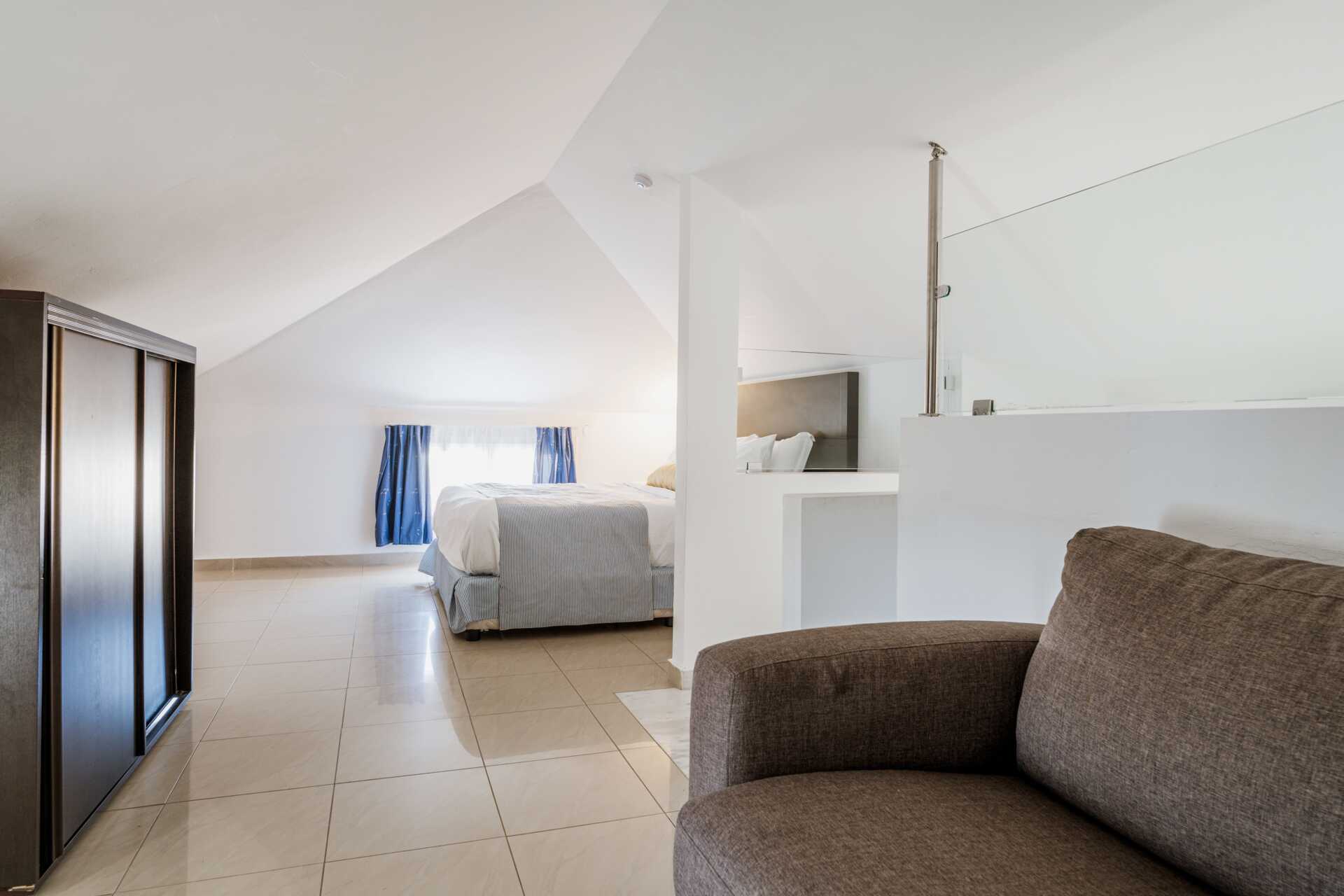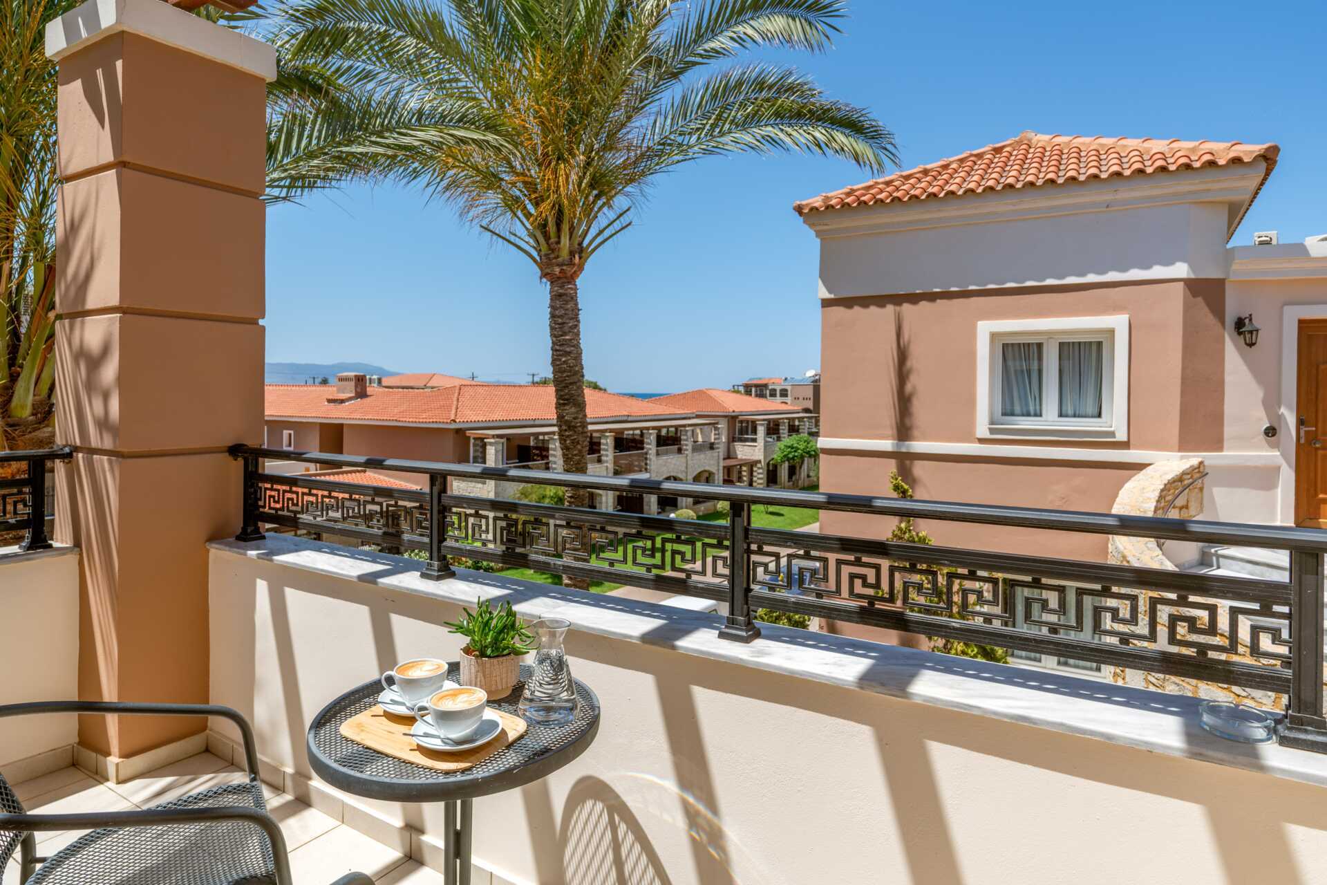 2-værelses lejlighed i etage med balkon, nogle med delvis havudsigt. Lejlighederne er beliggende i Aphrodite-delen af hotellet tættere på havet. I stueplan er der et minikøkken og et soveværelse med dobbeltseng. Ovenpå er der mulighed for ekstra opredninger i sovesofaer på hems. Minikøkken med køleskab, kogeplader, kaffemaskine, el-kedel, brødrister og enkelt køkkenudstyr. Gratis wifi, aircondition og deponering. Tv med internationale kanaler. Hårtørrer. Badeværelse med bruser og toilet. Rengøring 6 gange om ugen.