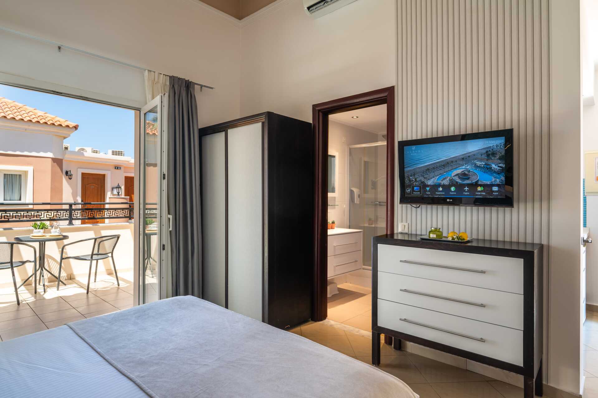 3-værelses lejlighed med balkon, nogle med havudsigt eller med delvis havudsigt. Lejlighederne er beliggende i Aphrodite-delen af hotellet tættere på havet. To soveværelser og kombineret opholdsrum med minikøkken. En dobbeltseng i hvert soveværelse. Mulighed for ekstra opredninger i sovesofa. Minikøkken med køleskab, kogeplader, kaffemaskine, el-kedel, brødrister og enkelt køkkenudstyr. Gratis wifi, aircondition og deponering. Tv med internationale kanaler. Hårtørrer. Badeværelse med bruser og toilet. Rengøring 6 gange om ugen.