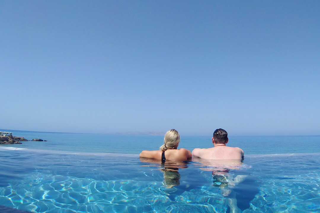 The Island er et stilfuldt og pænt hotel, der byder gæster over 16 år velkommen, og det ligger direkte ved stranden i den lille by Gouves - halvvejs mellem Hersonissos og Heraklion. Hotellet har fire pools, hvoraf tre er udendørs pools og en indendørs pool, som er åbne fra morgen til aften. Solstole og parasoller ved pools og på stranden. Poolhåndklæder indgår. Pool- og strandbar.