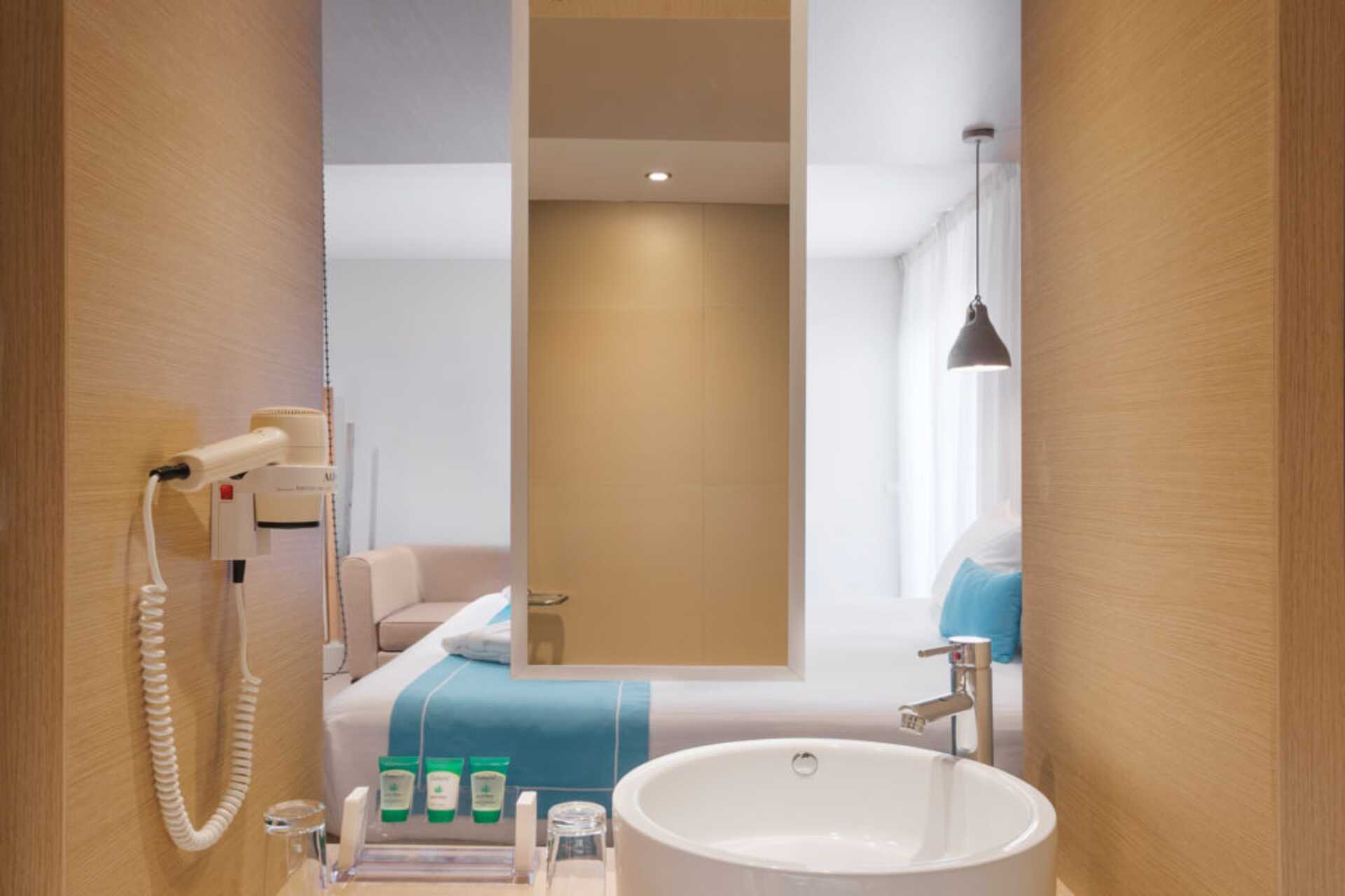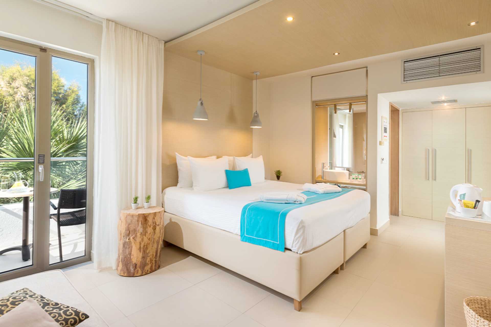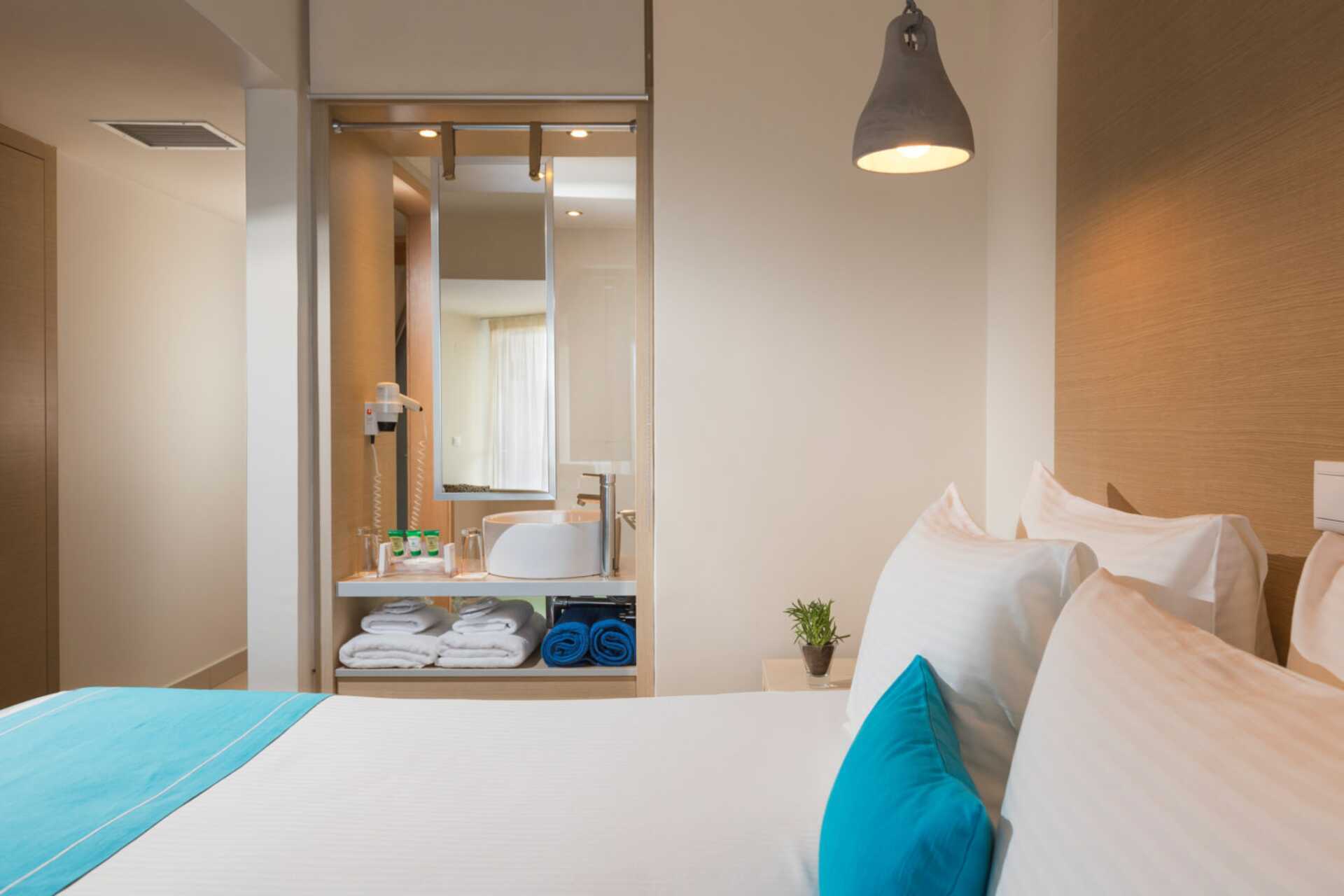 Dobbeltværelse med balkon eller terrasse eller med balkon og havudsigt. En dobbeltseng eller to enkeltsenge. Gratis wifi, aircondition og deponering. Køleskab. En flaske vand indgår og genopfyldes hver dag. El-kedel og kaffe/te. Tv med internationale kanaler. Hårtørrer. Badeværelse med badekar eller bruser samt toilet. Rengøring 7 gange om ugen.