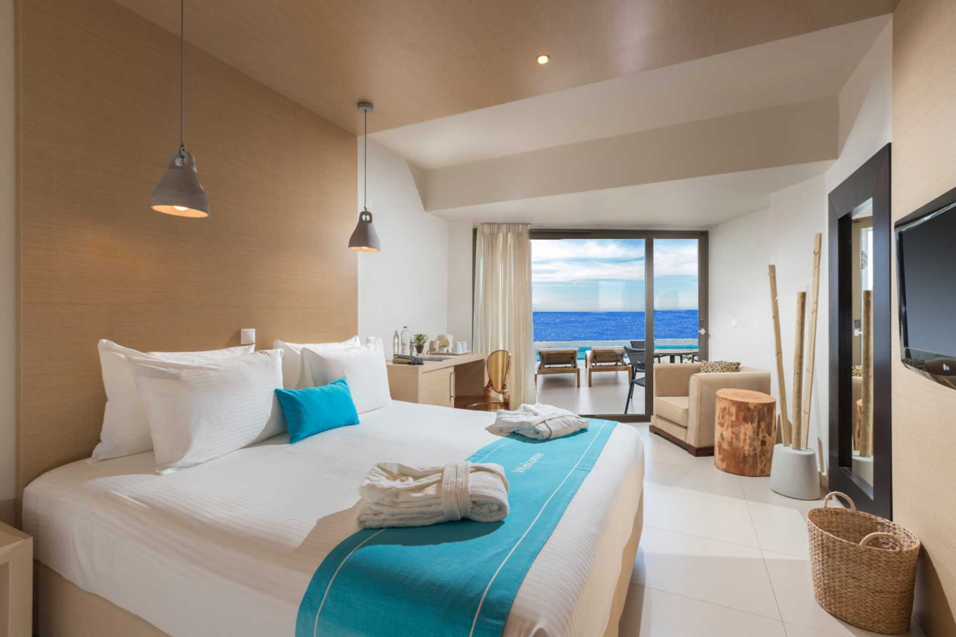 Dobbeltværelse med udeplads og udgang til delt infinitypool. På udepladsen er der to solstole og en parasol. Pools deles med tre værelser. En dobbeltseng. Gratis wifi, aircondition og deponering. Køleskab. En flaske vand indgår og genopfyldes hver dag. El-kedel og kaffe/te. Tv med internationale kanaler. Hårtørrer. Badekåber og tøfler. Badeværelse med badekar eller bruser samt toilet. Rengøring 7 gange om ugen.