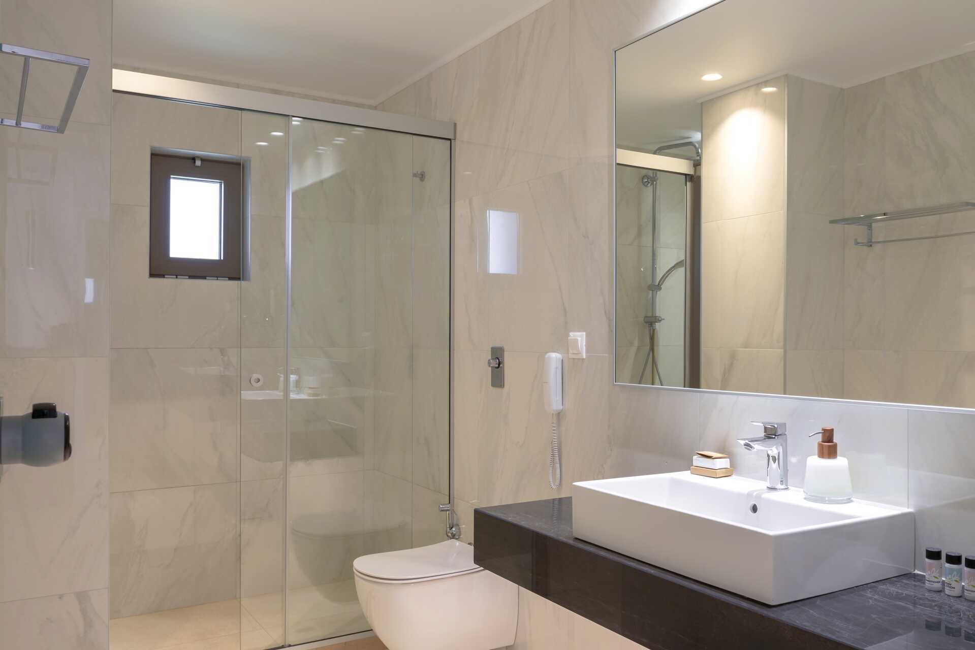Junior-suite med delt pool på udepladsen. Suiten har åben planløsning til badeværelset. En dobbeltseng. Mulighed for ekstra opredning i sovesofa. Gratis wifi, deponering og aircondition. Køleskab - en flaske vand indgår og genopfyldes hver dag. El-kedel og kaffe/te. Nespresso-maskine, kapsler indgår. Tv med internationale kanaler. Badekåber og tøfler. Badeværelse med badekar og seperat bruser samt toilet. Rengøring 7 gange om ugen.