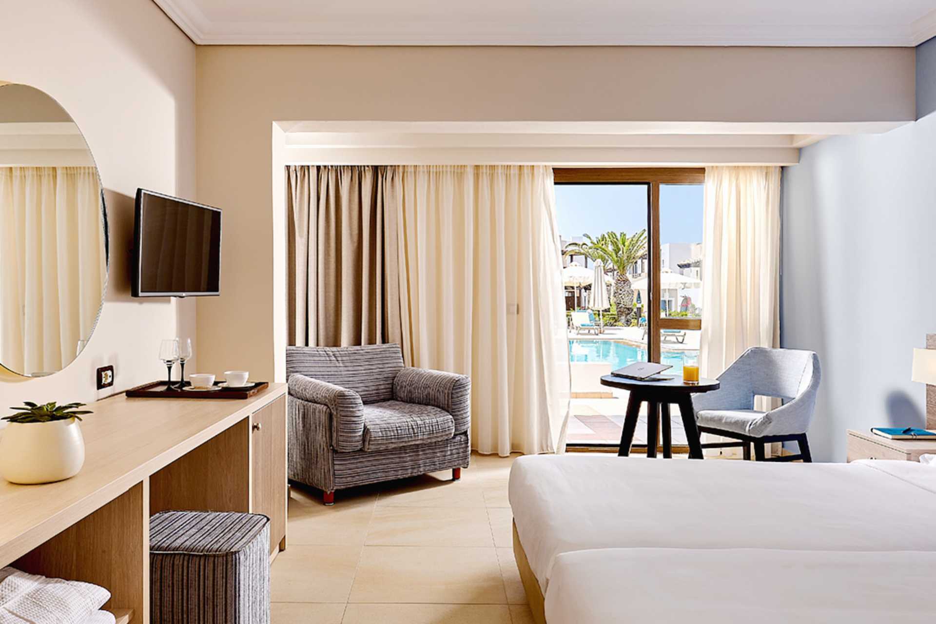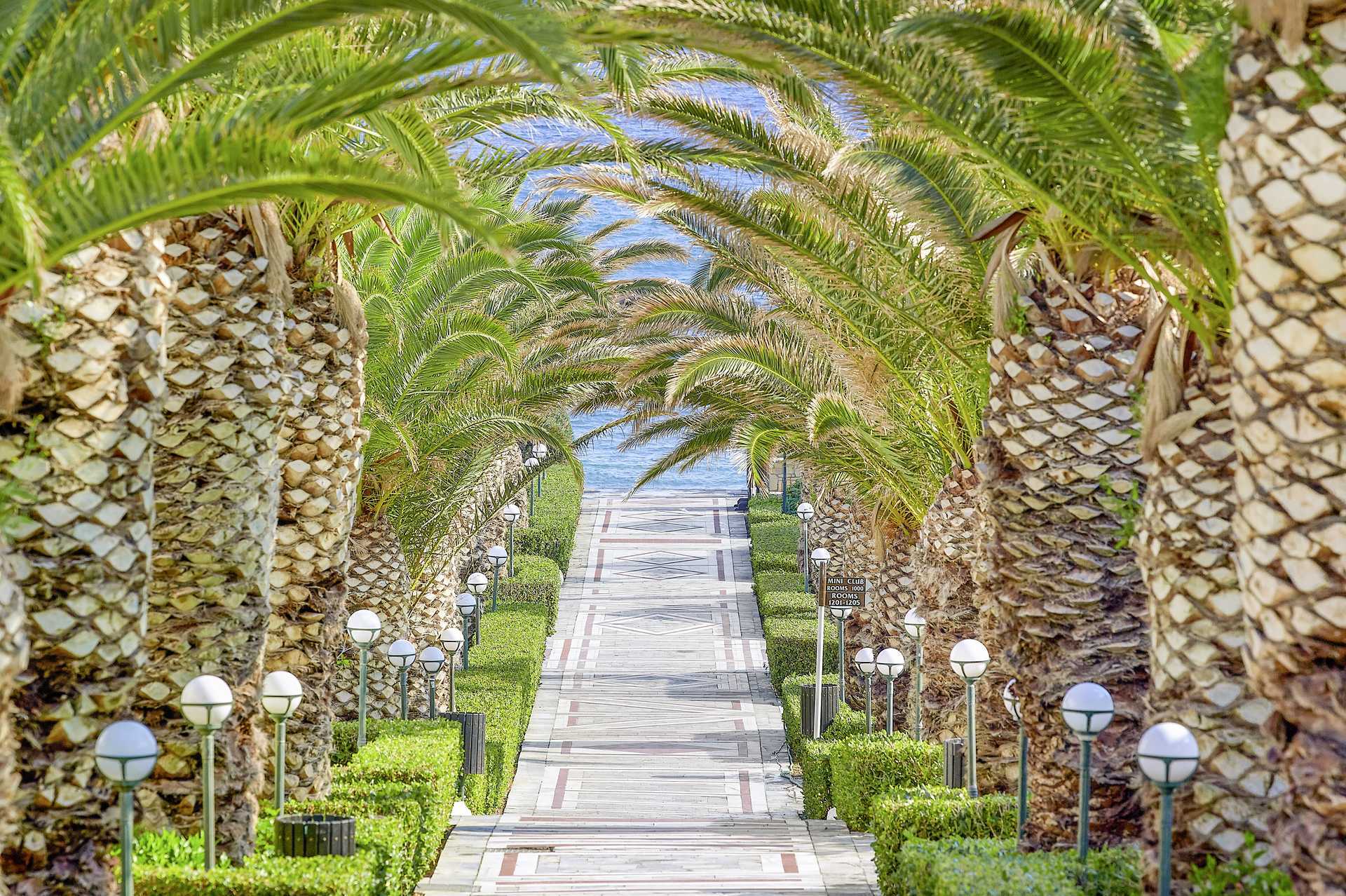 All Inclusive-hotellet Knossos Royal tilbyder indkvartering i charmerende bungalows spredt ud i en frodig have. Hotellet har flere pools og en sjov vandrutsjebane, der garanterer mange glade øjeblikke under din ferie. Et stenkast væk ligger sandstranden til afslappende dage med din yndlingsbog i skyggen, eller du kan få chancen for at prøve spændende vandsport.