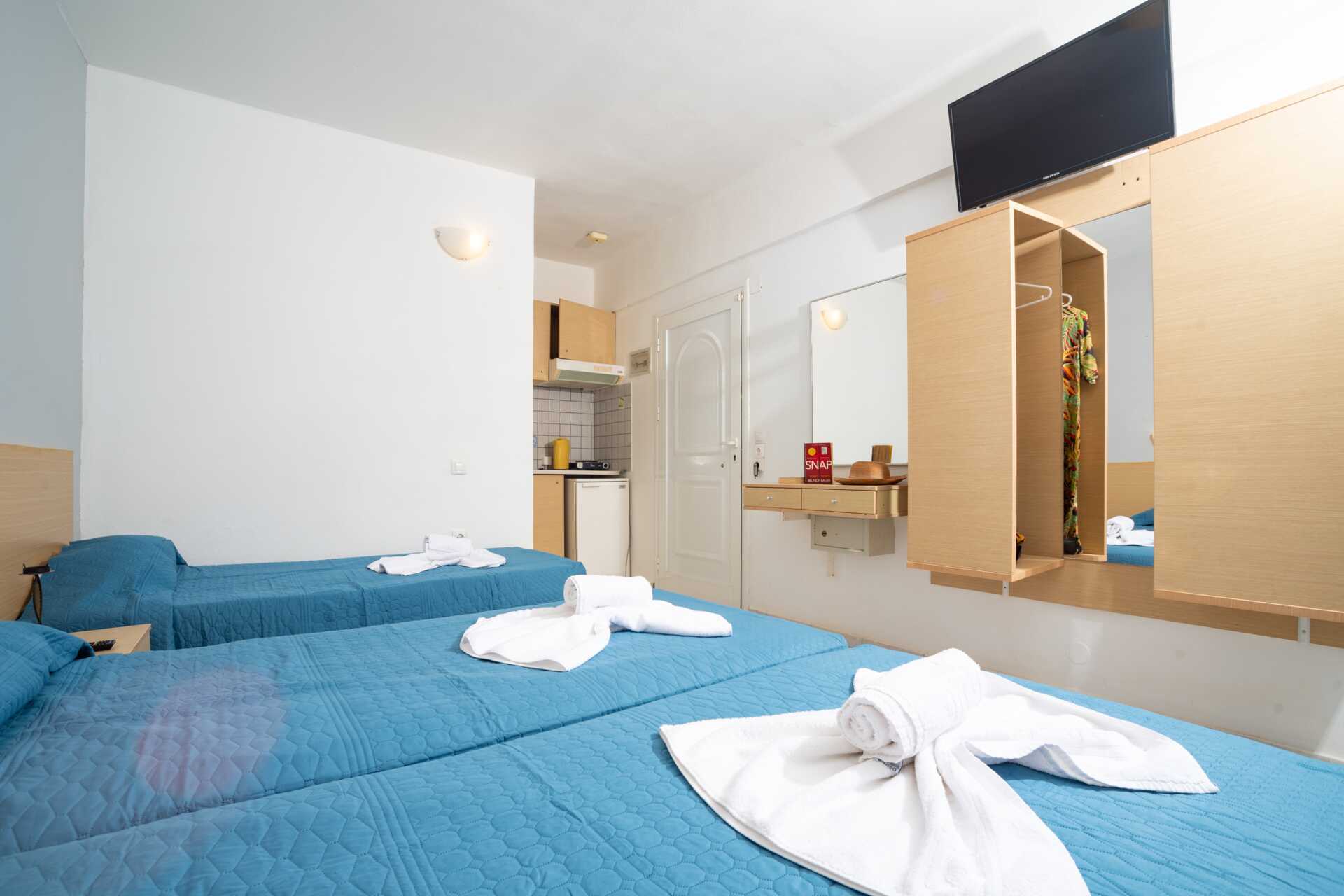 1-værelses lejligheder med balkon eller balkon i stueplan, nogle med pooludsigt. Soveværelse kombineret med minikøkken. To enkeltsenge. Mulighed for ekstra opredning i enkeltseng. Minikøkken med køleskab, kogeplader og enkelt køkkenudstyr. Gratis wifi. Aircondition og deponering mod betaling. Hårtørrer. Badeværelse med bruser og toilet. Rengøring 2 gange om ugen.