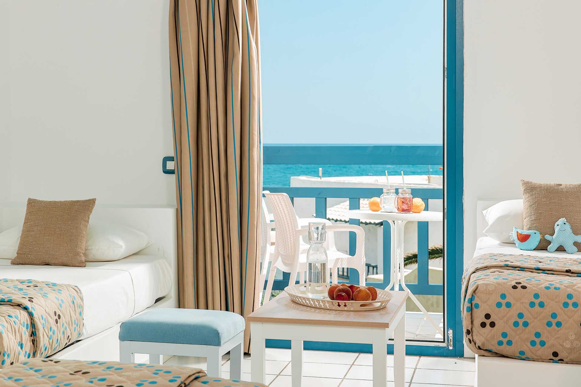 Familie-værelser med balkon eller terrasse, nogle med havudsigt. En dobbeltseng eller to enkeltsenge. Mulighed for ekstra opredning i de to sovesofaer. Gratis wifi, aircondition og deponering. Minibar er inkluderet og genopfyldes hver anden dag. El-kedel og kaffe/te. Tv med internationale kanaler. Hårtørrer. Badeværelse med badekar og toilet. Rengøring 7 gange om ugen. Børn under to år tæller med i det maksimale antal personer i lokalet.
