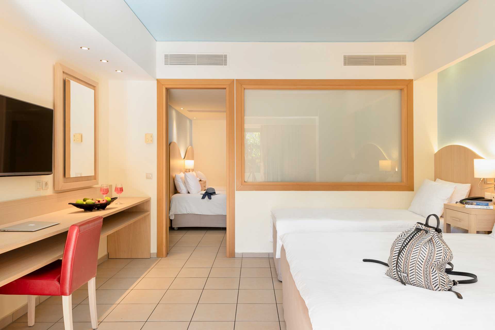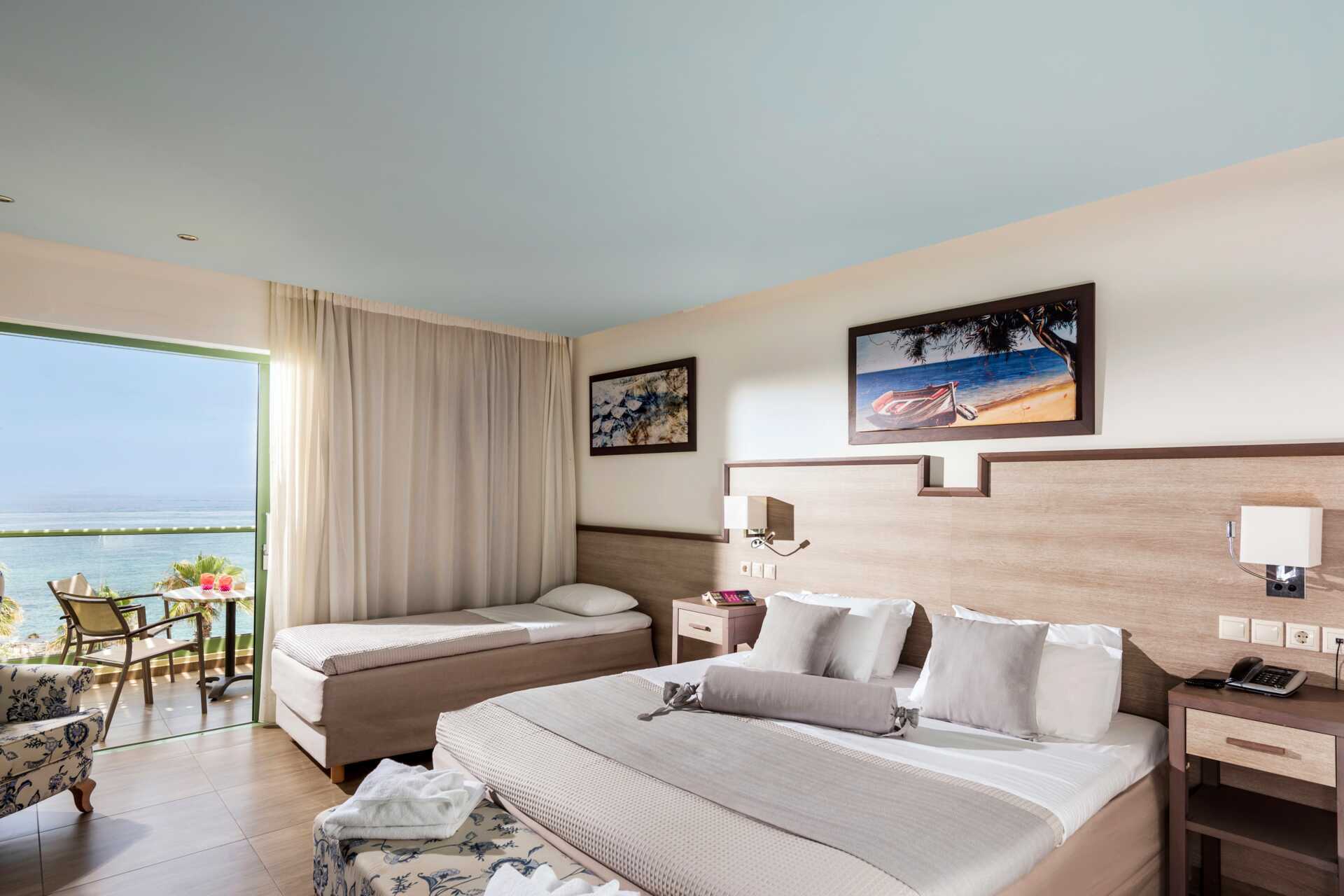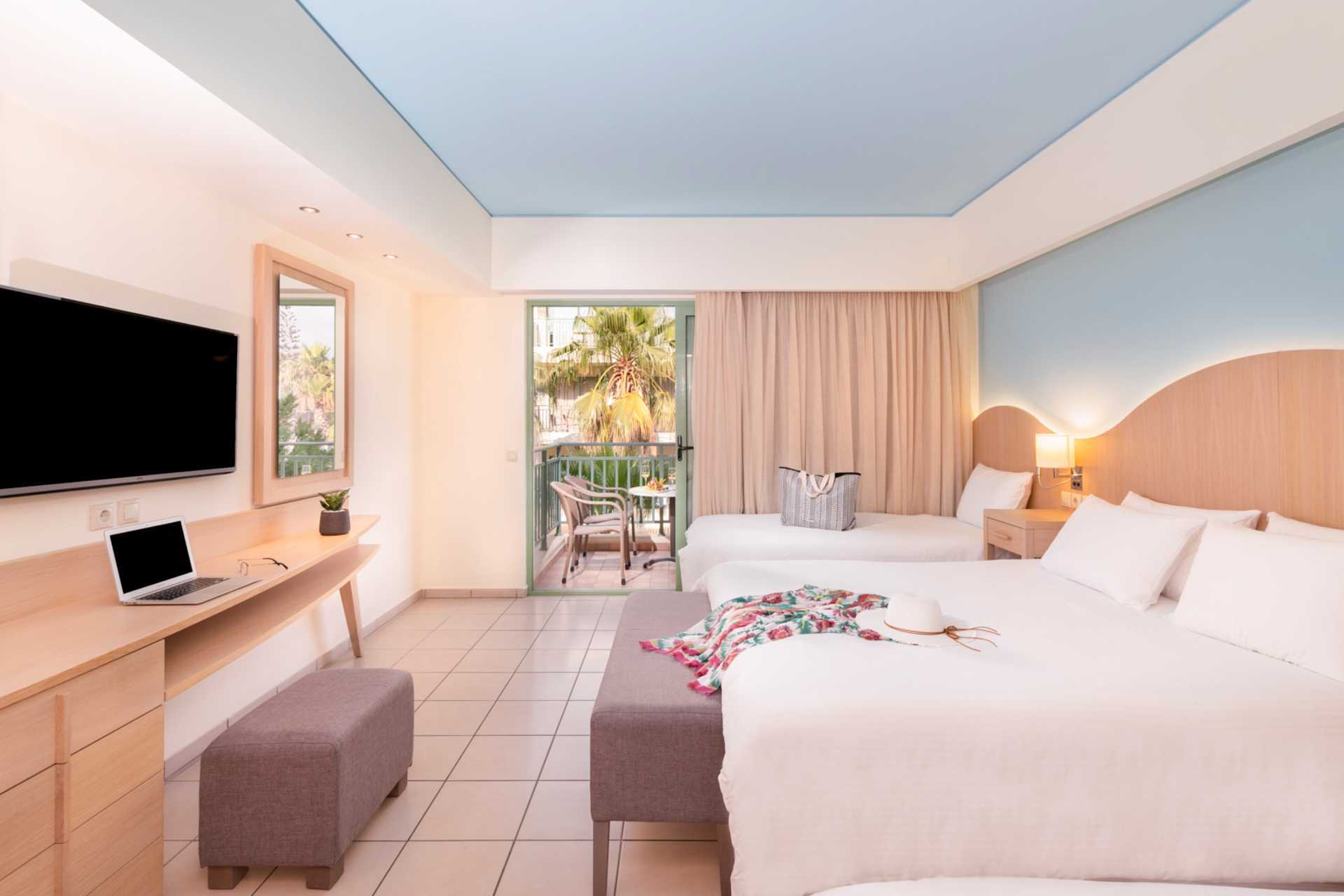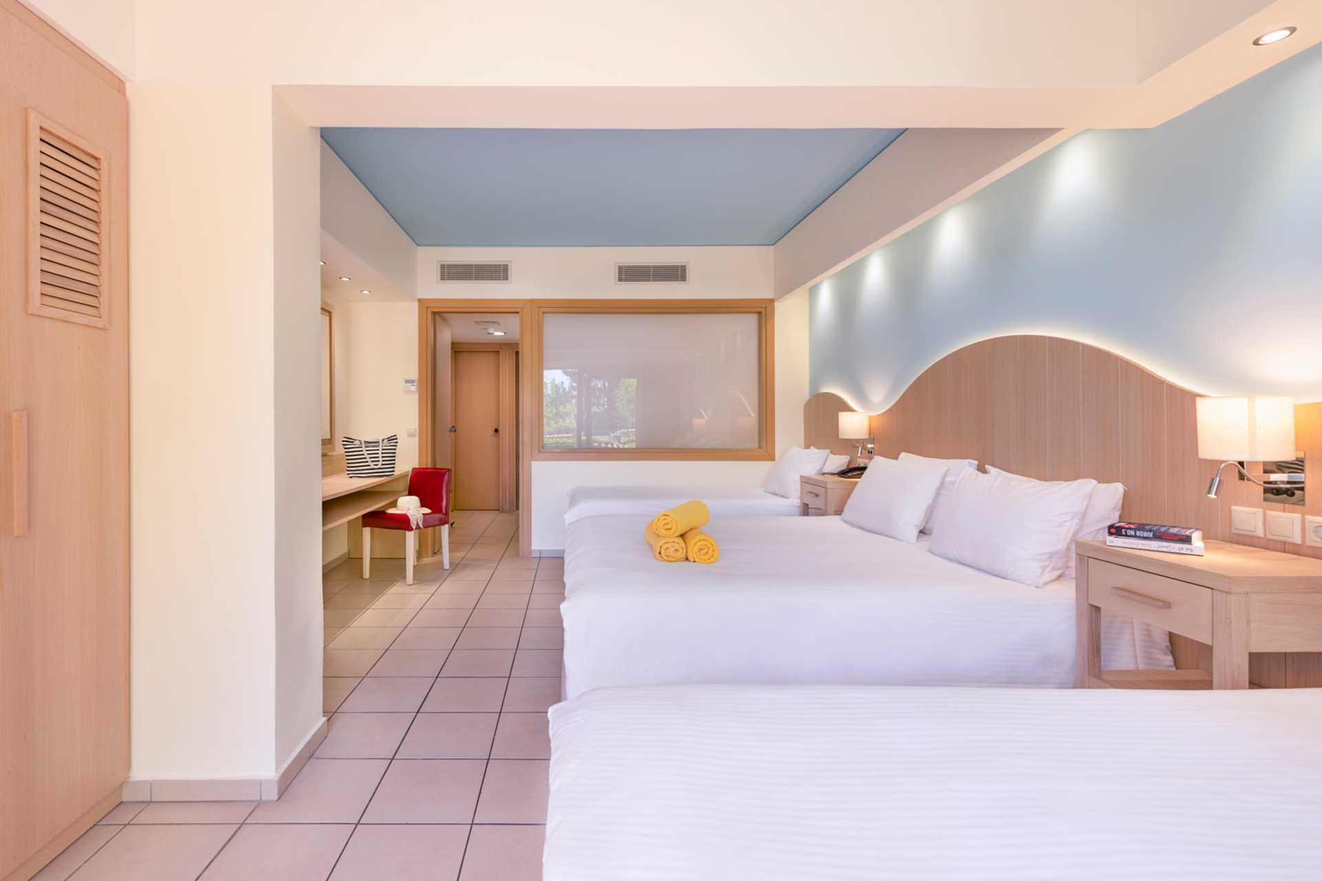 Familie-værelser med terrasse. Et soveværelse med en dobbeltseng og to enkeltsenge og et soveværelse med to enkeltsenge. Gratis wifi, aircondition og deponering. Køleskab - to flasker vand er inkluderet og genopfyldes hver dag. Mikroovn. El-kedel og kaffe/te. Tv med internationale kanaler. Hårtørrer. Badeværelse med badekar eller bruser samt toilet. Rengøring 7 gange om ugen. Børn under to år tæller med i det maksimale antal personer på værelset.