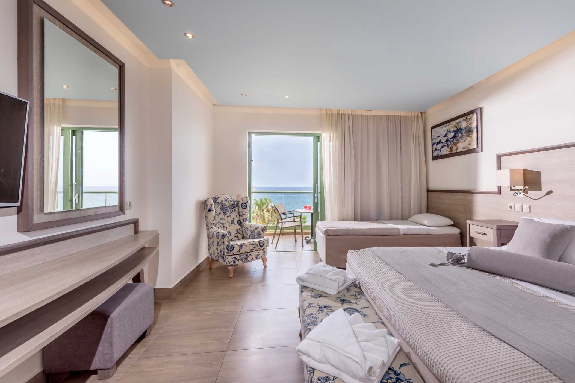 Suite med balkon og havudsigt. En dobbeltseng. Mulighed for ekstra opredning i enkeltseng. Gratis wifi, aircondition og deponering. Køleskab - to flasker vand er inkluderet og genopfyldes hver dag. Mikroovn. El-kedel og kaffe/te. Tv med internationale kanaler. Hårtørrer. Badeværelse med badekar eller bruser samt toilet. Rengøring 7 gange om ugen. Børn under to år tæller med i det maksimale antal personer på værelset.