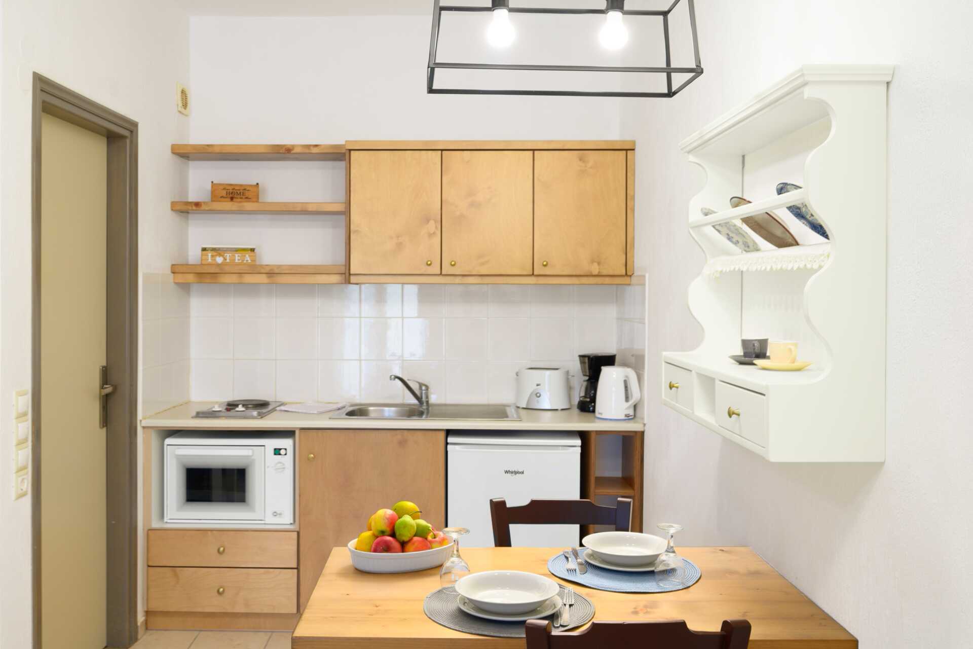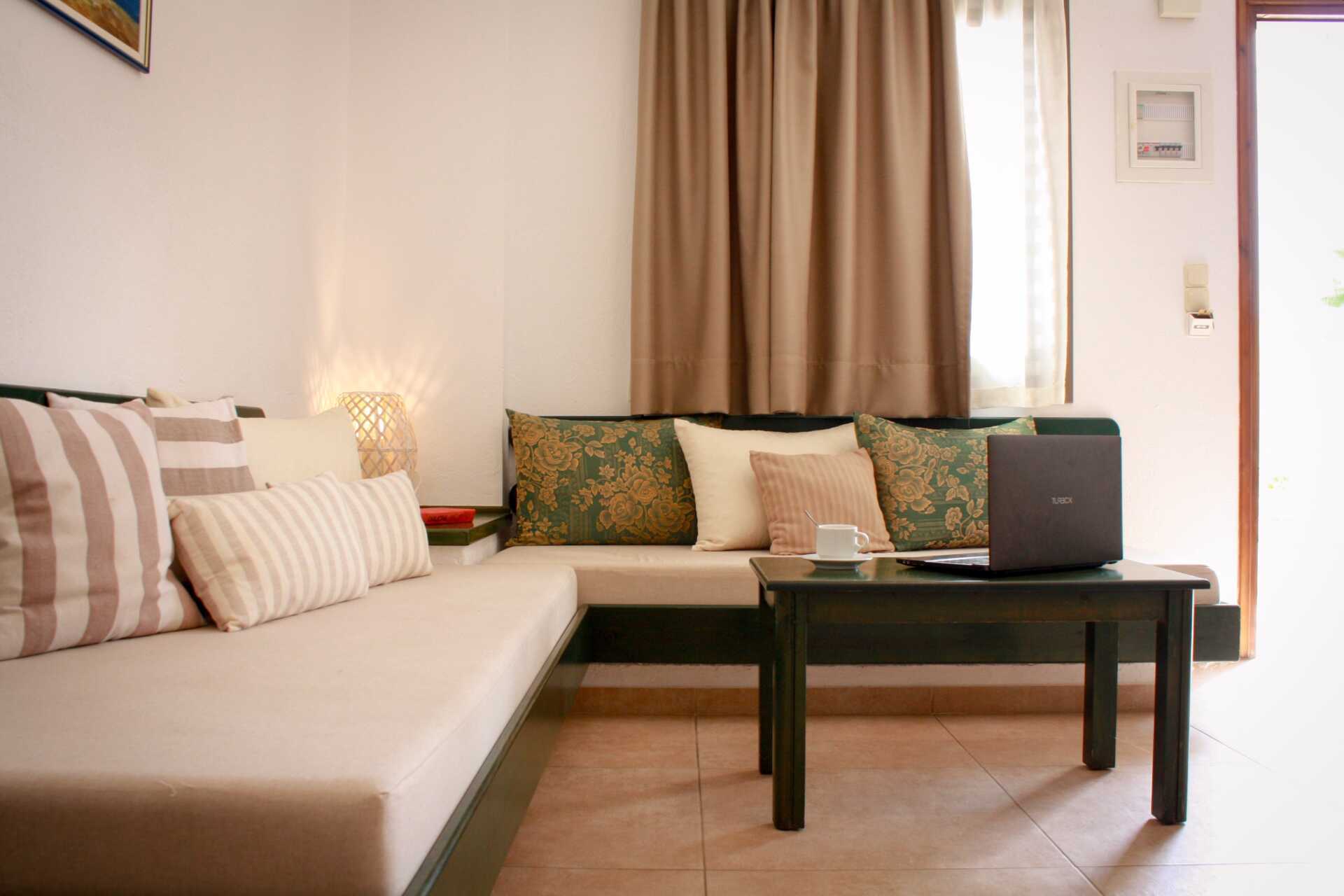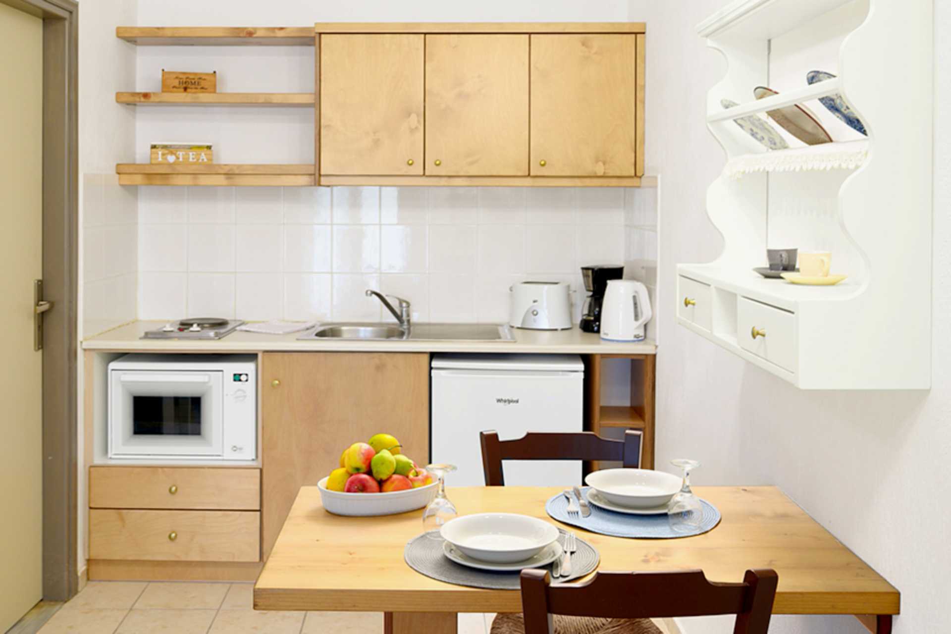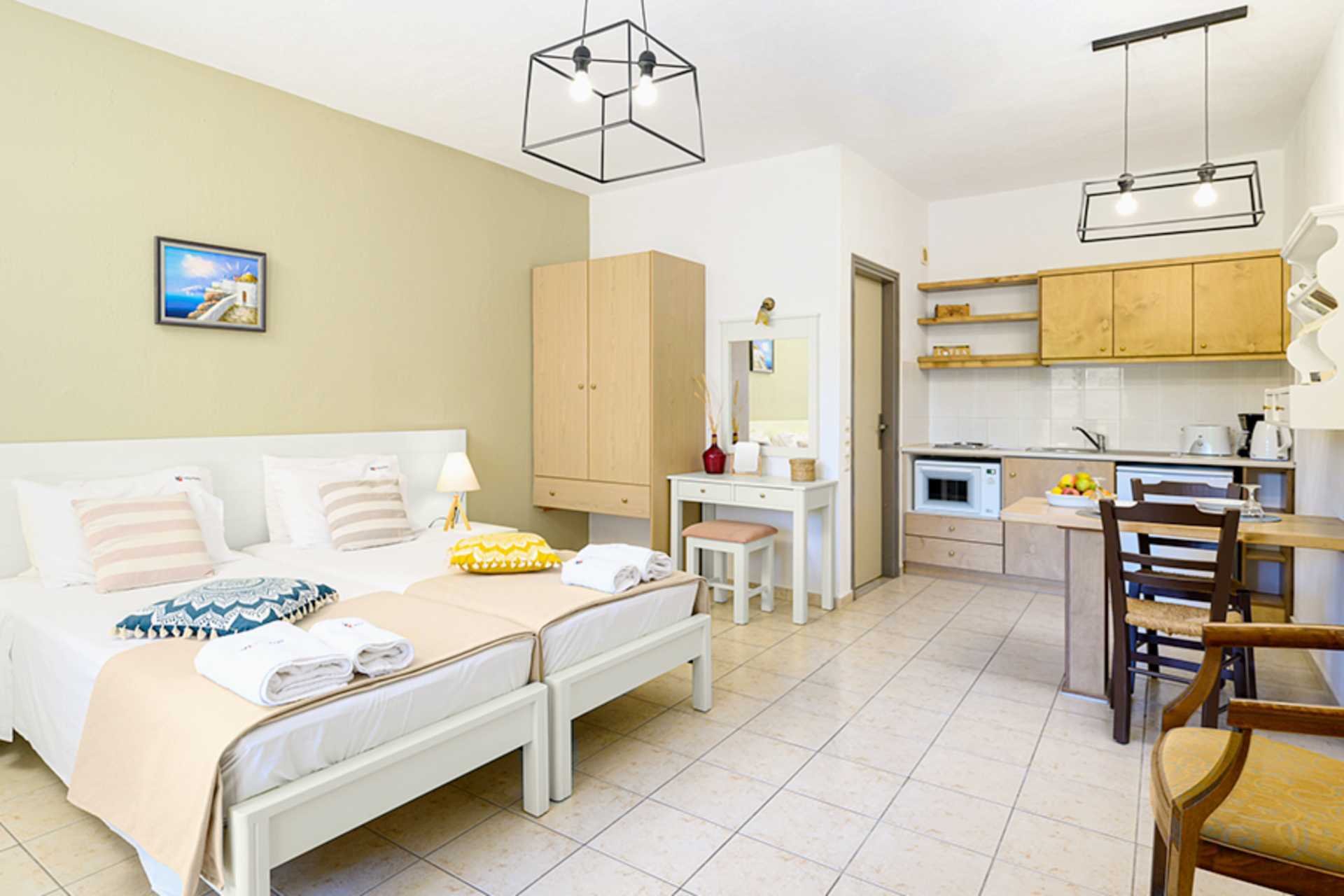 1-værelses lejlighed med balkon eller terrasse i stueplan. Kombineret soveværelse og minikøkken. To enkeltsenge. Mulighed for en ekstra opredning i en sovesofa. Minikøkken med komfur, ovn, køleskab, el-kedel, kaffemaskine, brødrister og enkelt køkkenudstyr. Gratis wifi og deponering. Aircondition mod betaling. Tv med internationale kanaler. Hårtørrer. Badeværelse med bruser og toilet. Rengøring 6 gange om ugen.