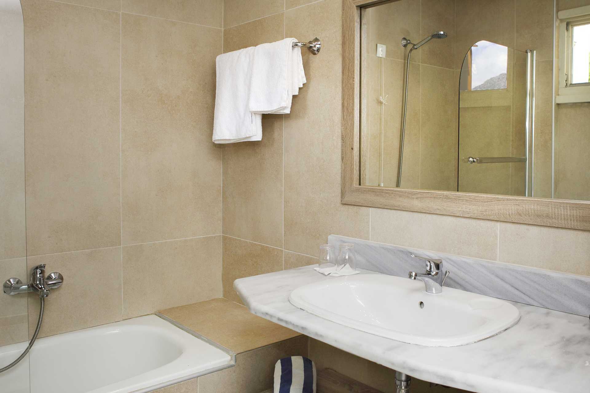 Familie-værelse i etage med terrasse. To enkeltsenge. Mulighed for ekstra opredning i sovesofa. Gratis wifi, aircondition og deponering. Køleskab. El-kedel og kaffe/te. Tv med internationale kanaler. Badeværelse med badekar eller bruser samt toilet. Hårtørrer. Rengøring 7 gange om ugen.