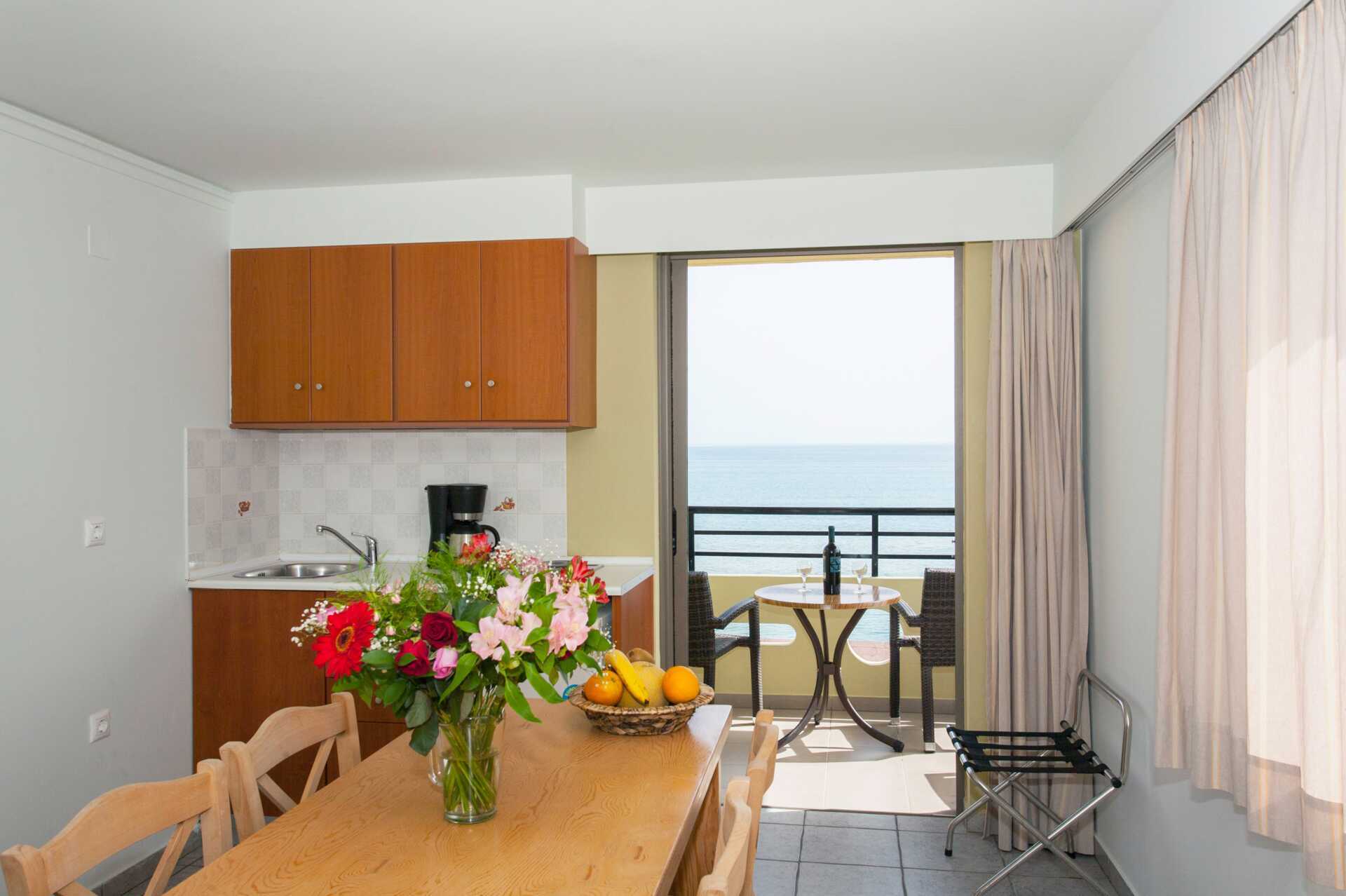 1-værelses lejlighed med balkon eller balkon i stueplan, nogle med havudsigt, delvis havudsigt eller med balkon og pooludsigt. Kombineret soveværelse og minikøkken. To enkeltsenge. Mulighed for ekstra opredning i enkeltseng. Minikøkken med kogeplader, køleskab, kaffemaskine, el-kedel, brødrister og enkelt køkkenudstyr. Gratis wifi og aircondition. Deponering mod betaling. Tv med lokale kanaler. Hårtørrer. Badeværelse med bruser og toilet. Rengøring 6 gange om ugen.