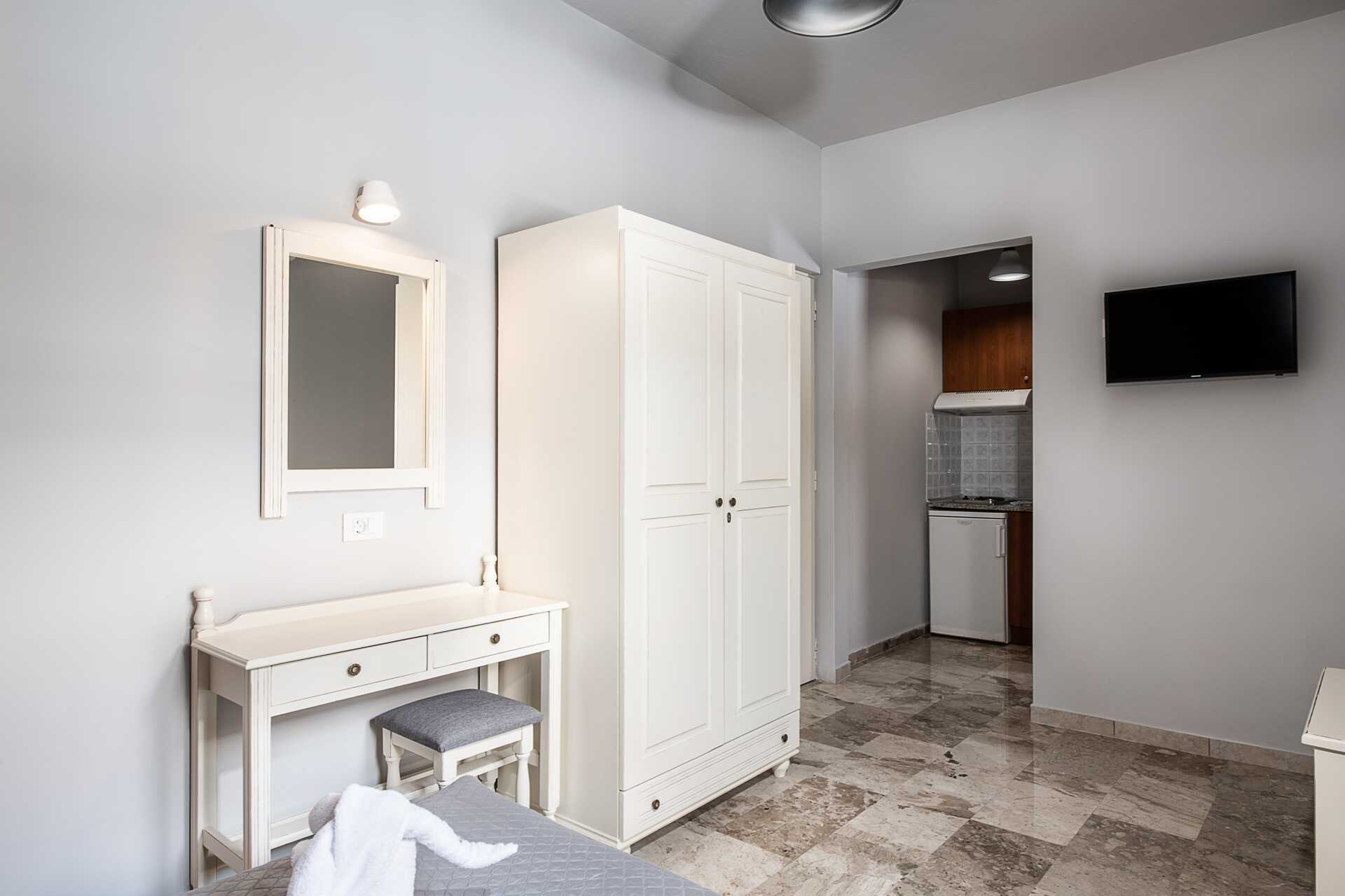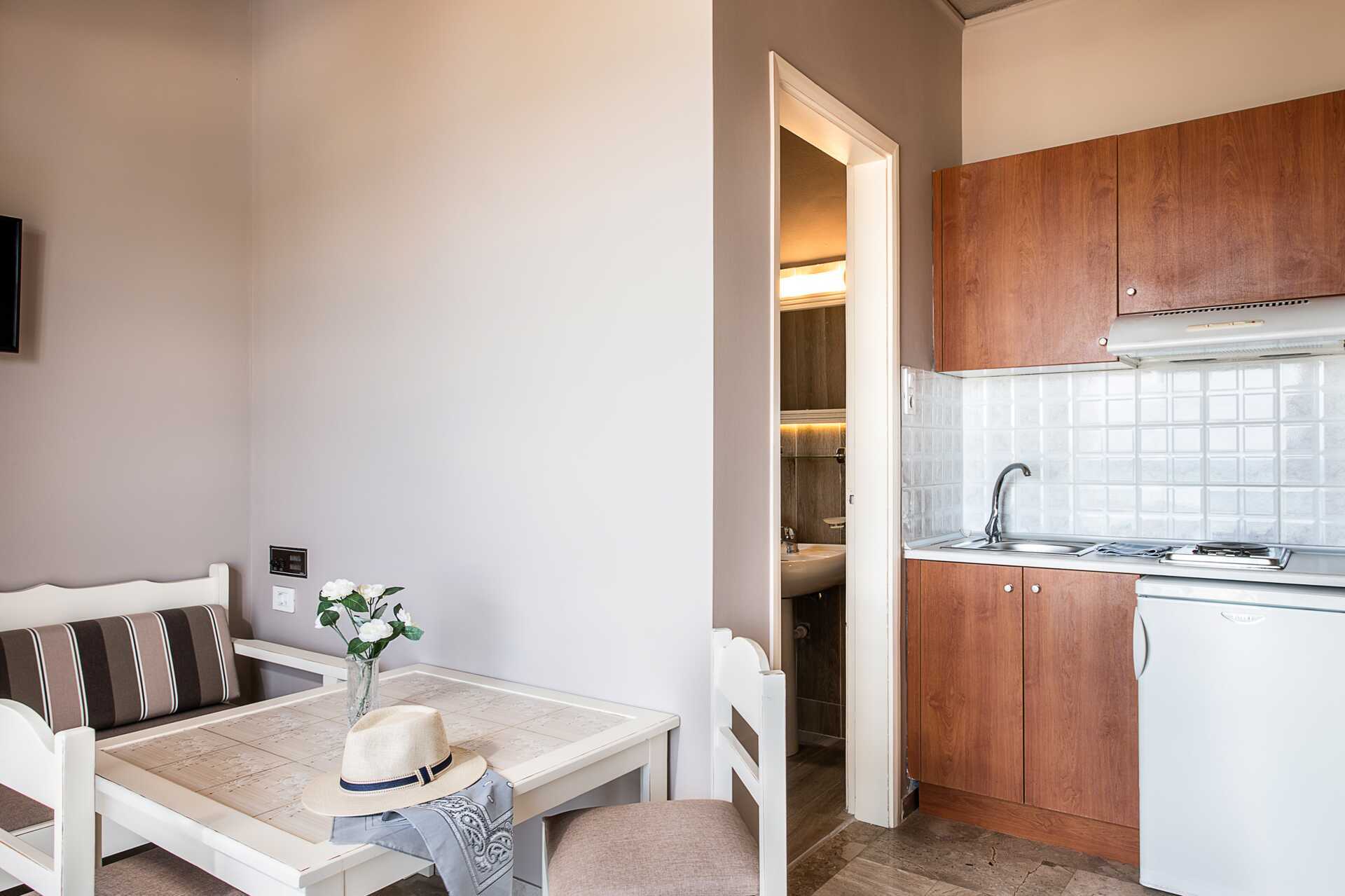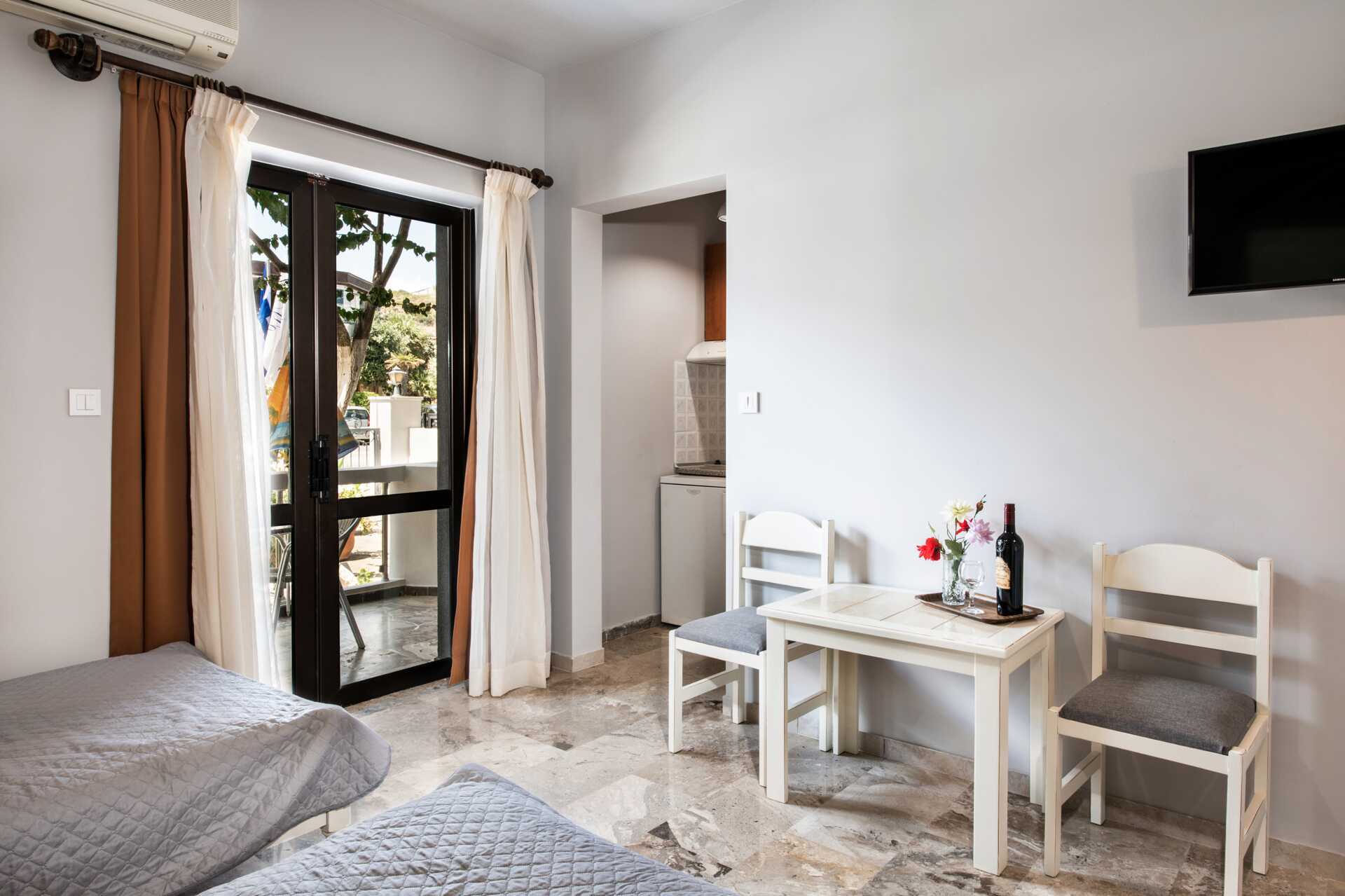 1-værelses lejlighed med balkon eller terrasse, nogle med delvis havudsigt. Soveværelse kombineret med minikøkken. En enkeltseng eller to enkeltsenge. Minikøkken med kogeplader, køleskab, kaffemaskine, el-kedel og enkelt køkkenudstyr. Gratis wifi. Aircondition og deponering mod betaling. Tv med internationale kanaler. Hårtørrer. Badeværelse med bruser og toilet. Rengøring 6 gange om ugen.