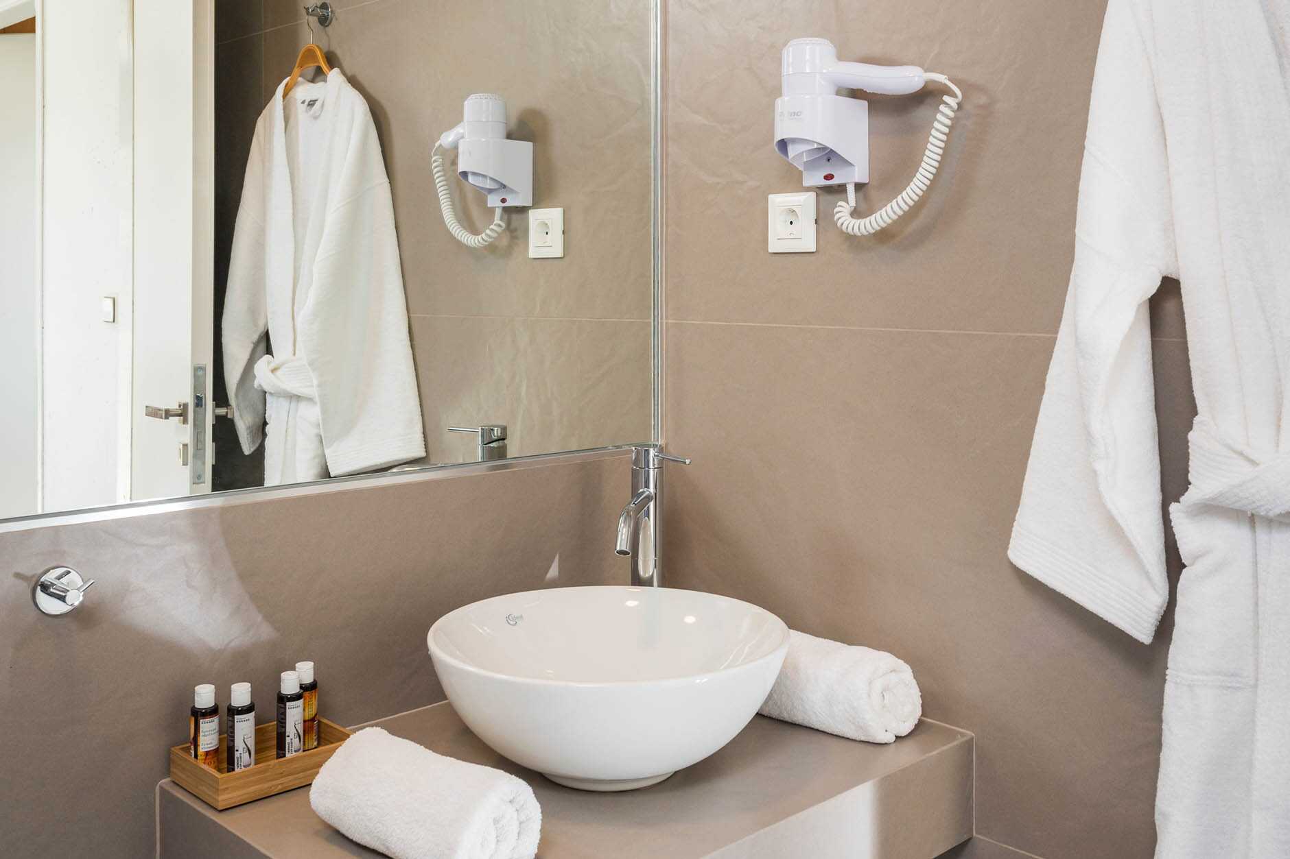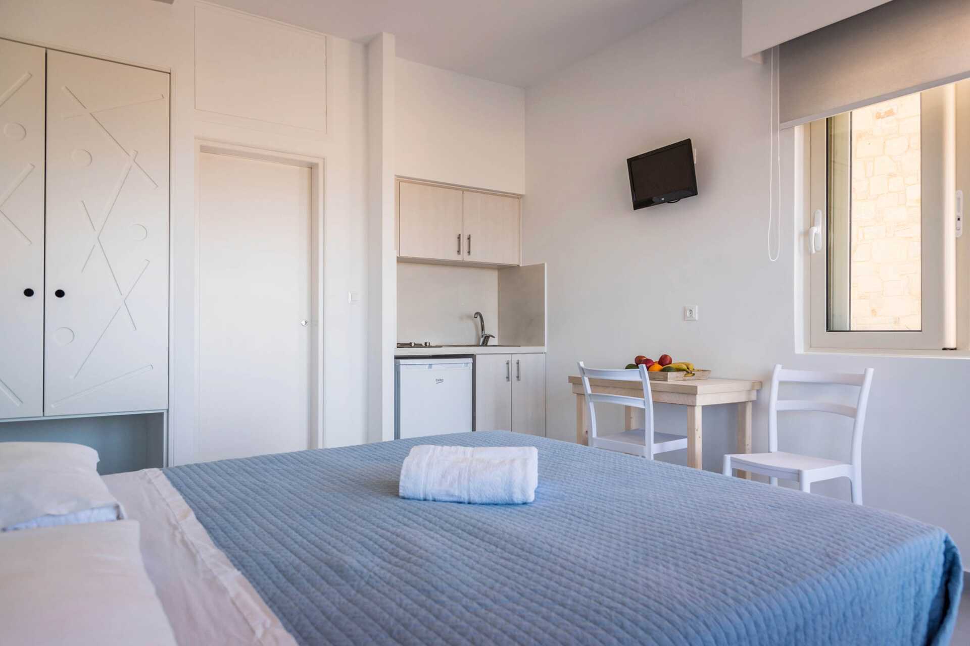 1-værelses lejlighed med balkon, nogle med havudsigt eller pooludsigt eller med terrasse i stueplan og havudsigt. En dobbeltseng eller to enkeltsenge. Mulighed for ekstra opredning i sovesofa. Kombineret soveværelse og minikøkken. Minikøkken med kogeplader, køleskab, kaffemaskine, el-kedel og enkelt køkkenudstyr. Gratis wifi og aircondition. Deponering mod betaling. Hårtørrer. Badeværelse med bruser og toilet. Rengøring 6 gange om ugen.