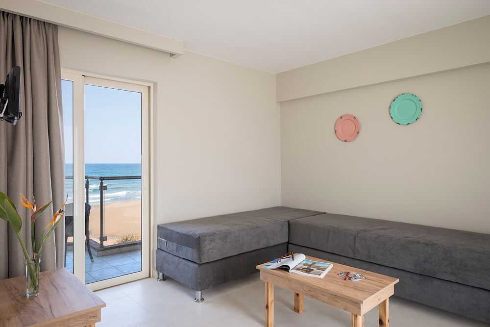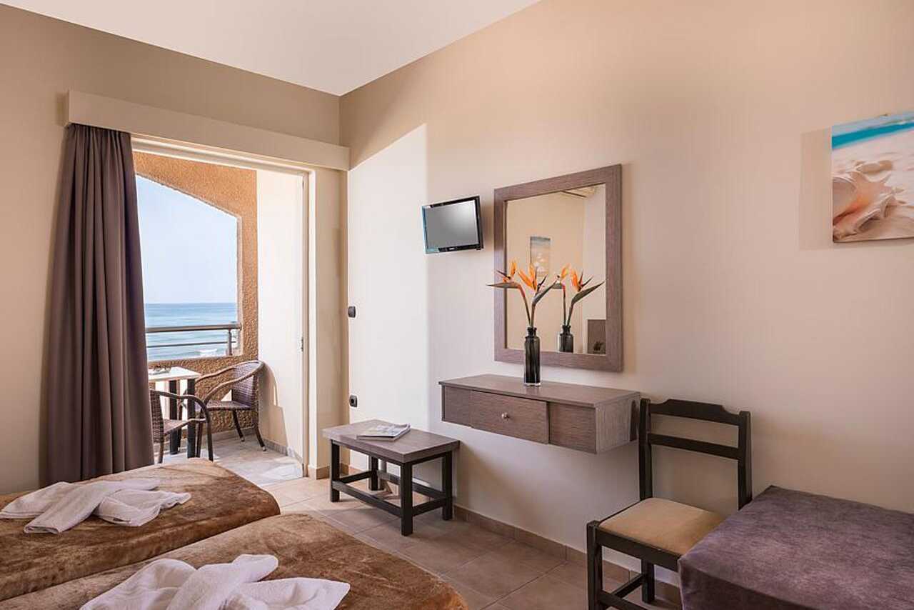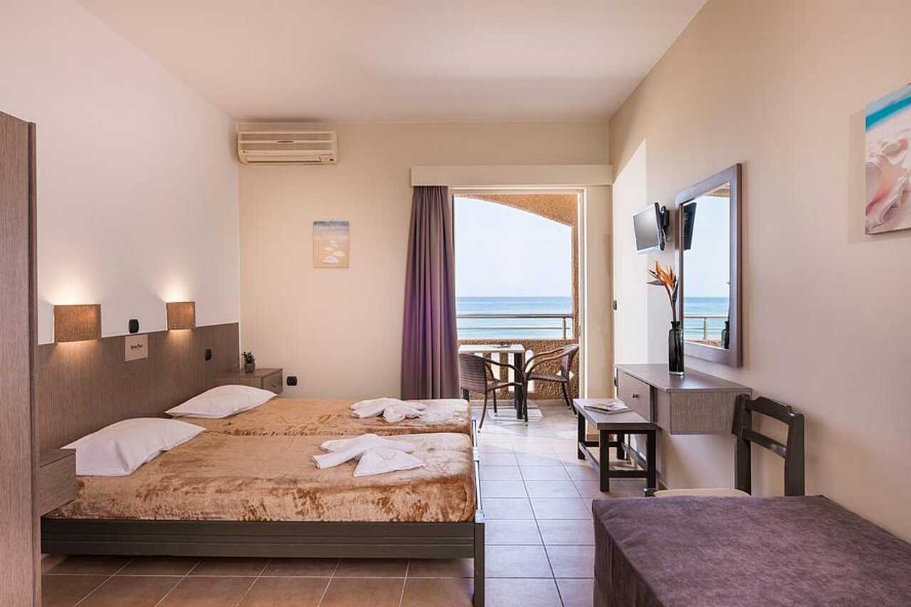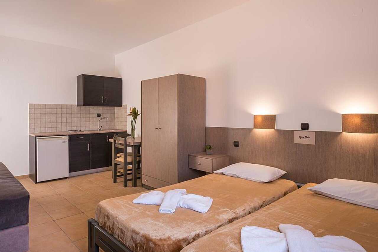 2-værelses lejlighed med balkon og havudsigt. Soveværelse og kombineret opholdsrum med minikøkken. En dobbeltseng eller to enkeltsenge. Mulighed for ekstra opredninger i sovesofa. Minikøkken med kogeplader, køleskab, kaffemaskine, el-kedel og enkelt køkkenudstyr. Gratis wifi og aircondition. Deponering mod betaling. Hårtørrer. Badeværelse med bruser og toilet. Rengøring 6 gange om ugen.