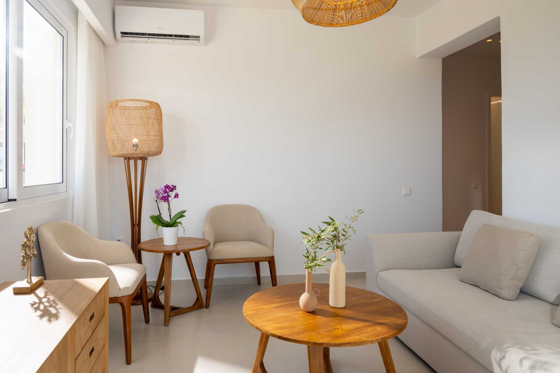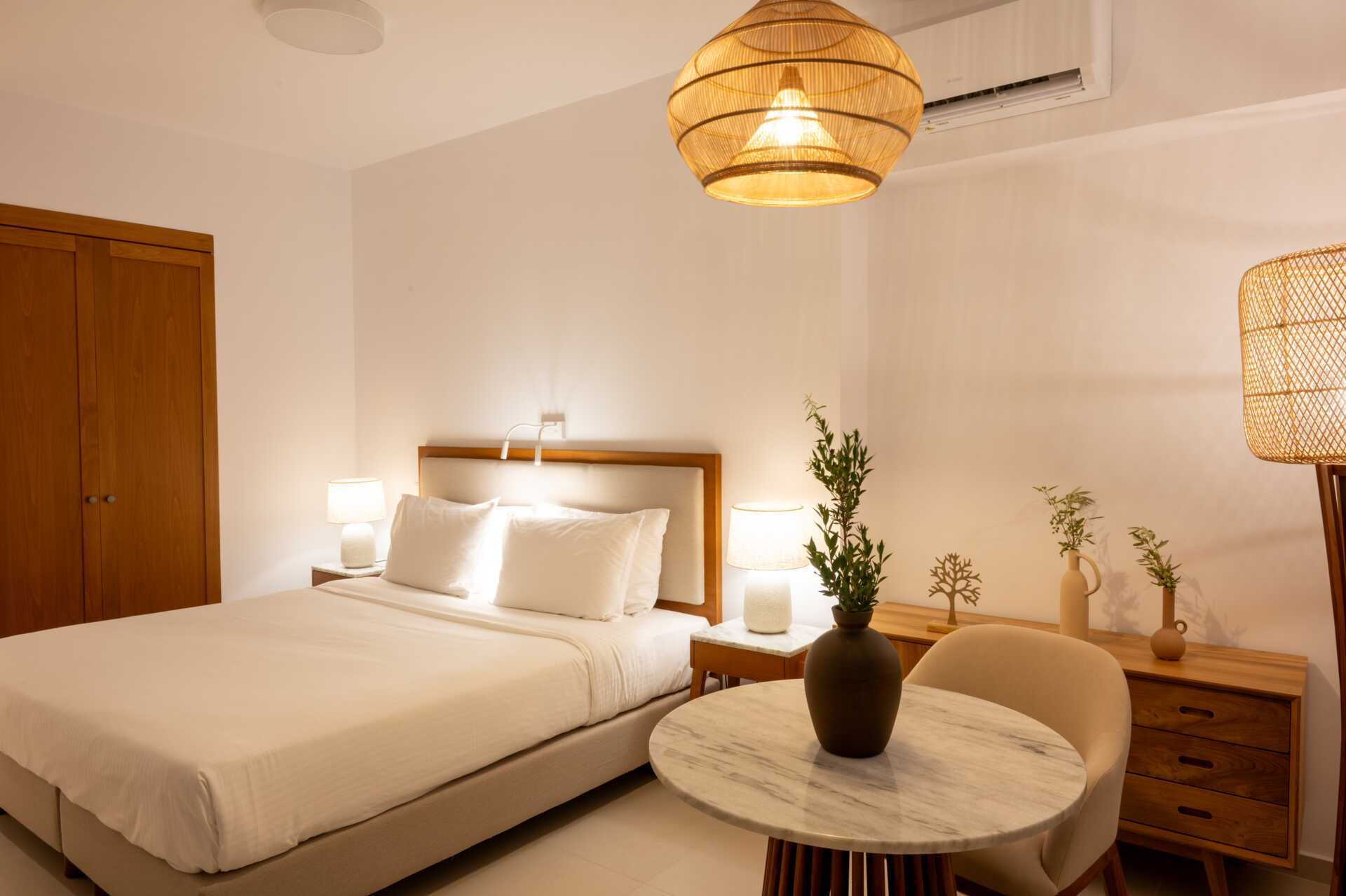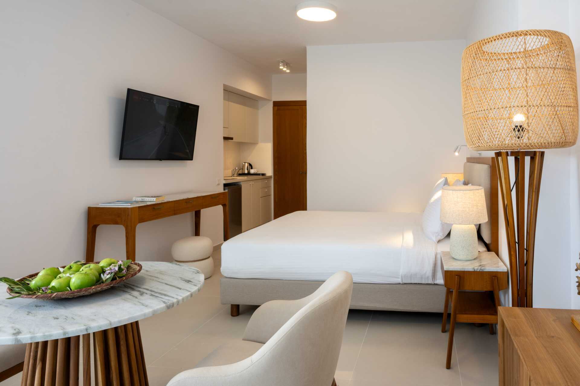 2-værelses lejligheder med balkon eller med terrasse og delvis havudsigt. Kombineret soveværelse og minikøkken. En dobbeltseng eller to enkeltsenge. Mulighed for ekstra opredning i fold ud-seng. Minikøkken med kogeplader, køleskab, el-kedel og enkelt køkkenudstyr. Gratis wifi, aircondition og deponering. Tv med internationale kanaler. Hårtørrer. Badeværelse med bruser og toilet. Rengøring 7 gange om ugen. Børn under to år tæller med i det maksimale antal personer på værelset.