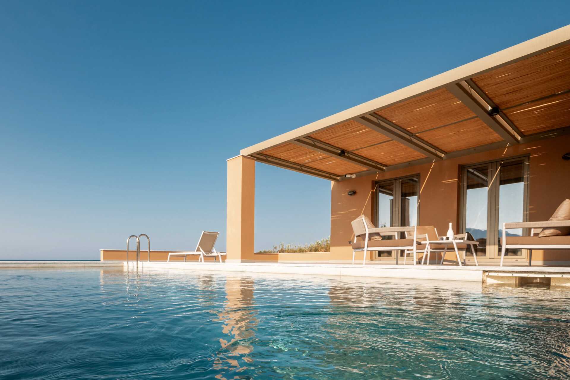 3-værelses villa med balkon eller terrasse med havudsigt. På terrassen er der en pool på 30 kvm (dybde 140 cm) med solstole og parasoller og poolhåndklæder. To pergolaer, hvor du kan nyde hvile og en middag i skyggen. Hotellet kalder villaen Giannoulis Ele Sole. Gratis wifi, aircondition og deponering. Vaskemaskine og tørretumbler Strygejern og strygebræt. Rengøring 6 gange om ugen. Rengørings- og vaskeudstyr samt vaske- og rengøringsmidler.