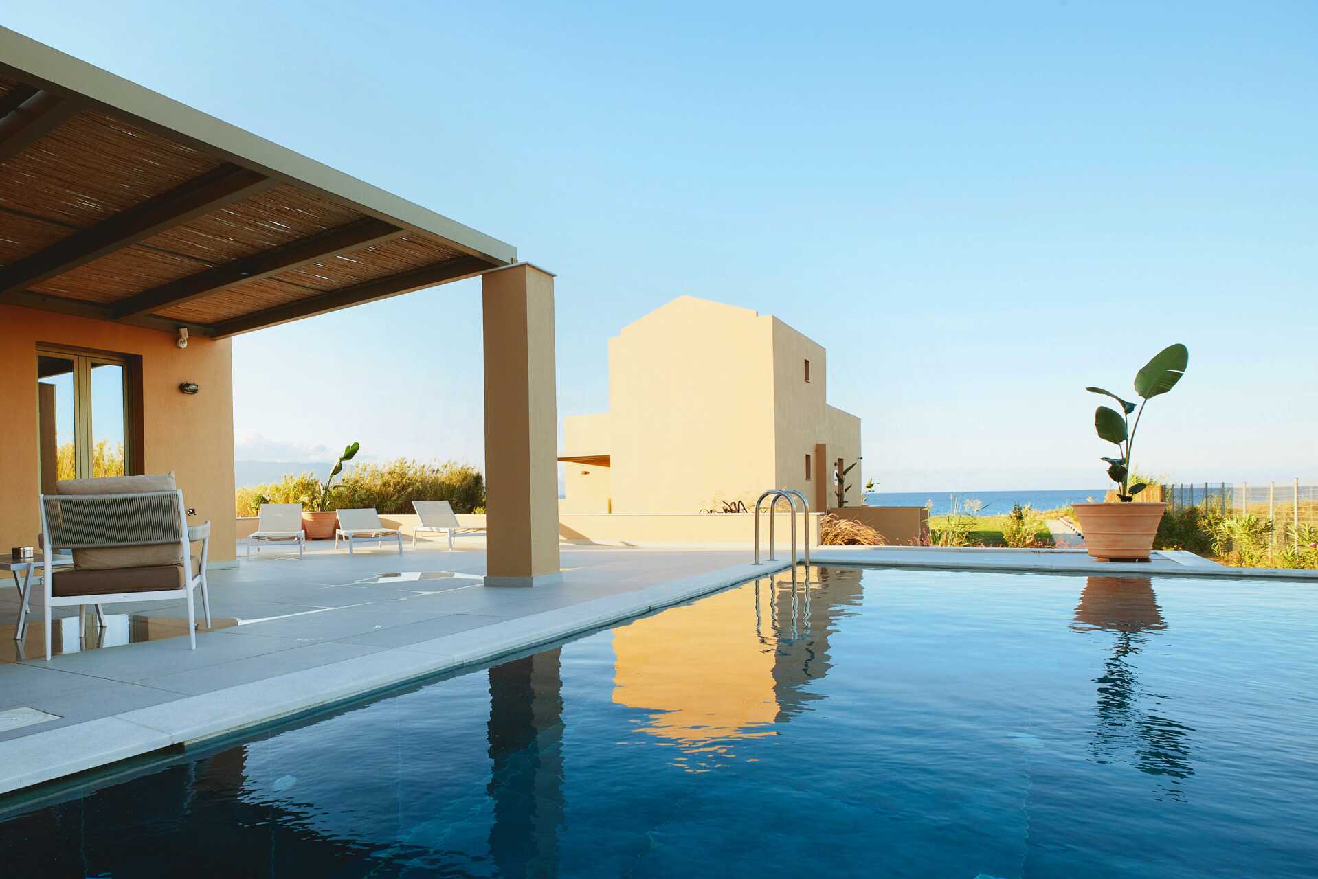 3-værelses villa med balkon og terrasse ud mod havet. På terrassen er der en pool på 30 kvm (dybde 140 cm) med solstole og parasoller og poolhåndklæder. To pergolaer, hvor du kan nyde hvile og en middag i skyggen. Hotellet kalder villaen Giannoulis Ele Mare. Gratis wifi, aircondition og deponering. Vaskemaskine og tørretumbler Strygejern og strygebræt. Rengøring 6 gange om ugen. Rengørings- og vaskeudstyr samt vaske- og rengøringsmidler.