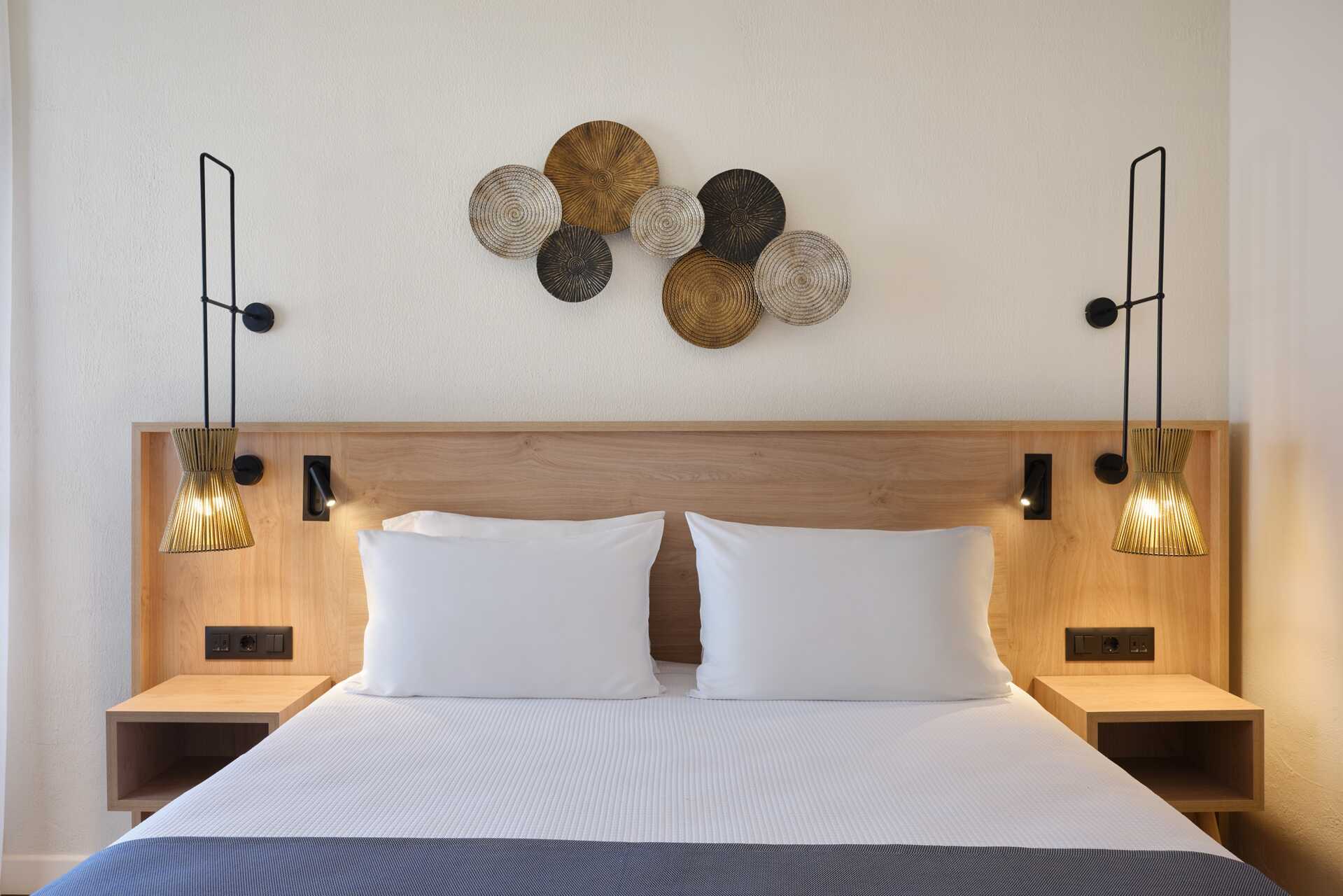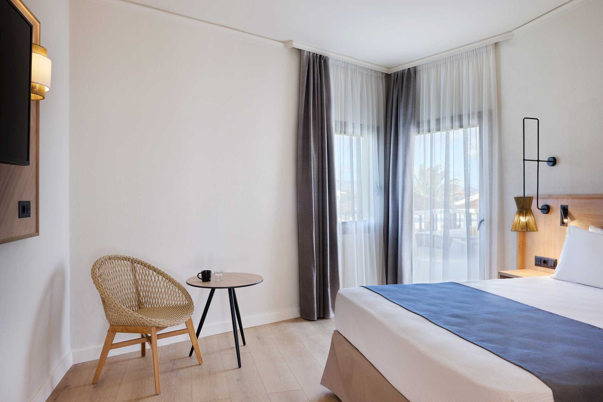 Dobbeltværelser med balkon eller terrasse, nogle med delvis havudsigt og nogle med havudsigt. Værelserne er placeret i hovedbygningen eller i de to bungalowbygninger uden elevator. En dobbeltseng. Mulighed for ekstra opredning i sovesofa. Gratis wifi, aircondition og deponering. Køleskab. El-kedel og kaffe/te. Tv med internationale kanaler. Strygejern og strygebræt. Hårtørrer. Badeværelse med bruser og toilet. Rengøring 7 gange om ugen.