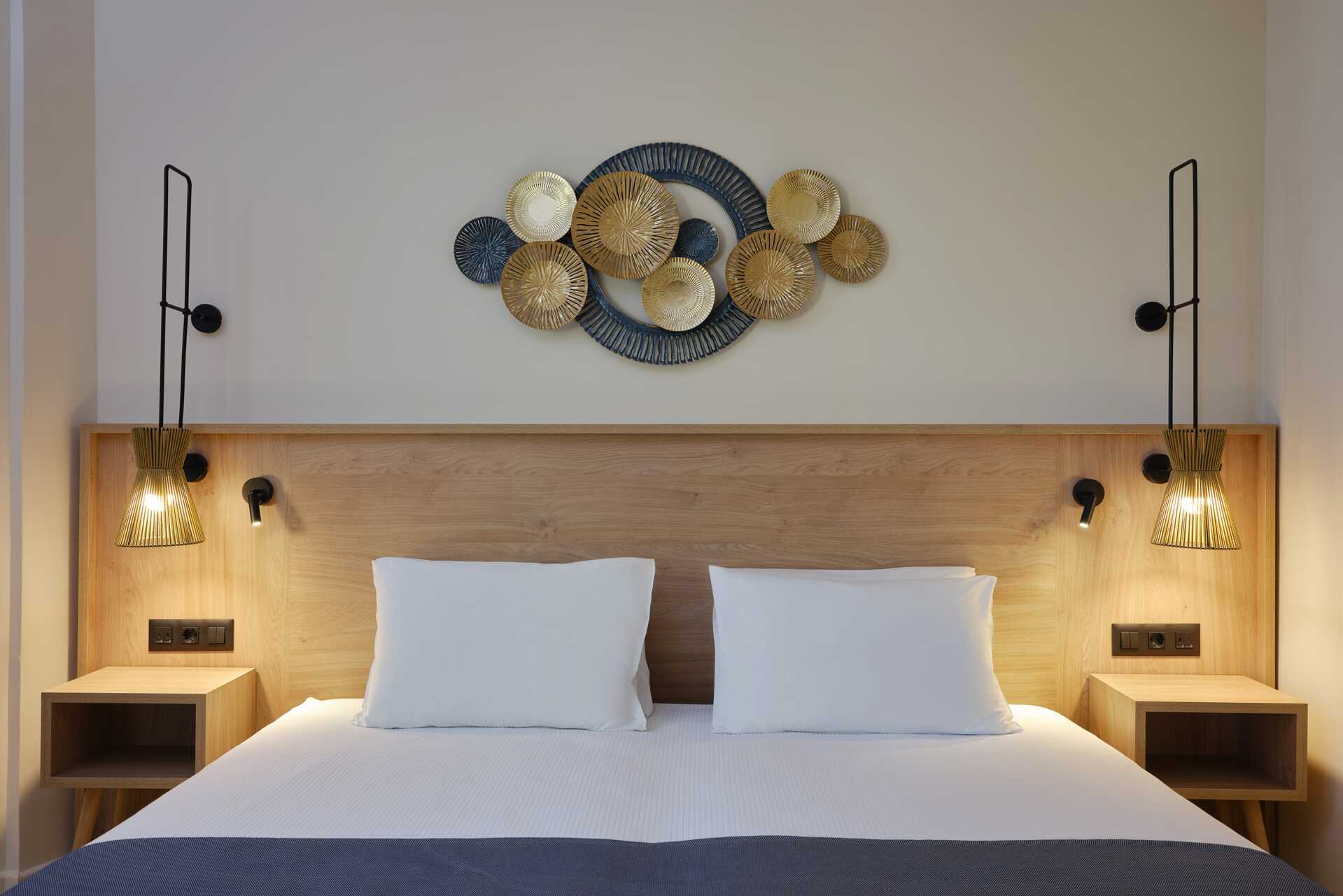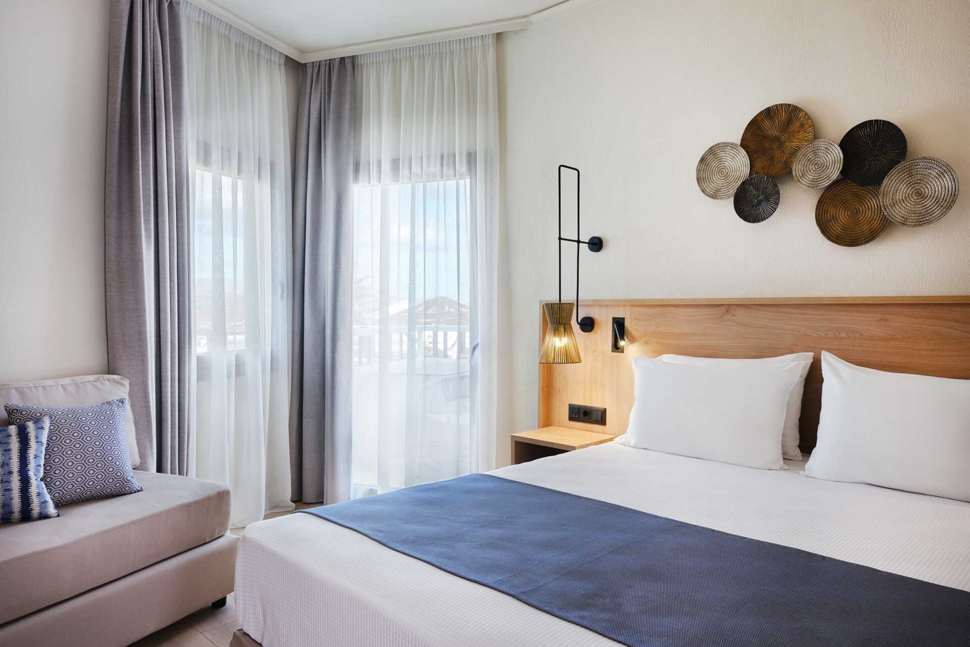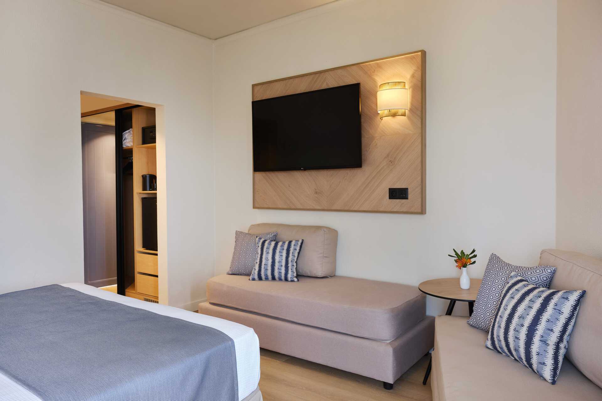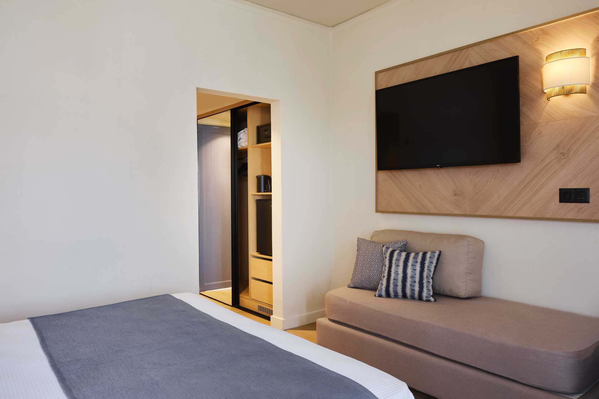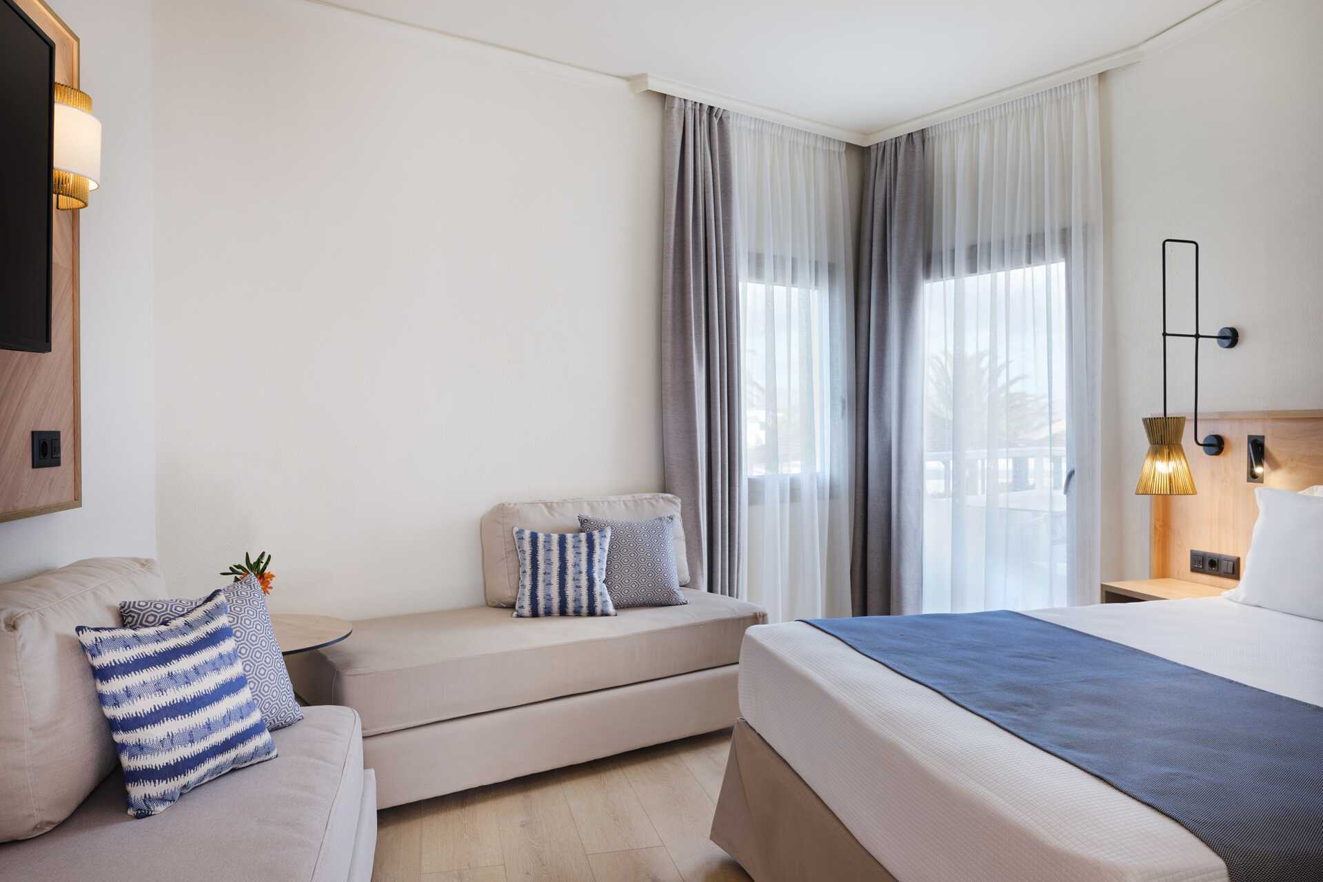 Større dobbeltværelse med balkon eller terrasse. Værelserne er placeret i hovedbygningen eller i de to bungalowbygninger uden elevator. En dobbeltseng. Mulighed for ekstra opredninger i to sovesofaer. Gratis wifi, aircondition og deponering. Køleskab. El-kedel og kaffe/te. Tv med internationale kanaler. Strygejern og strygebræt. Hårtørrer. Badeværelse med bruser og toilet. Rengøring 7 gange om ugen.