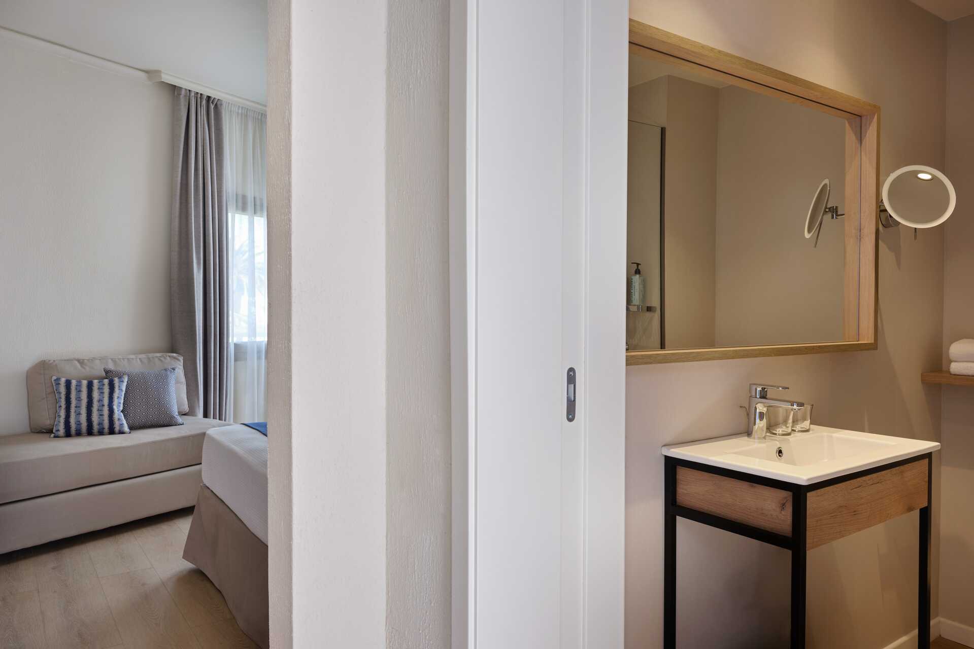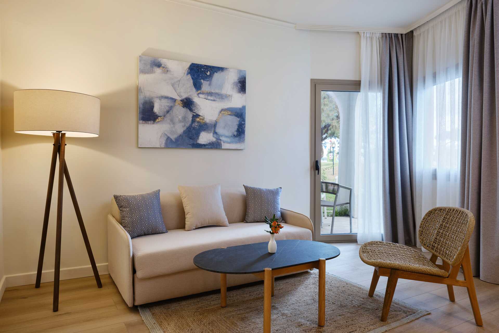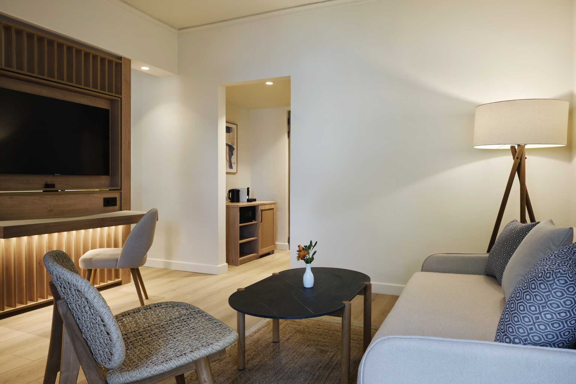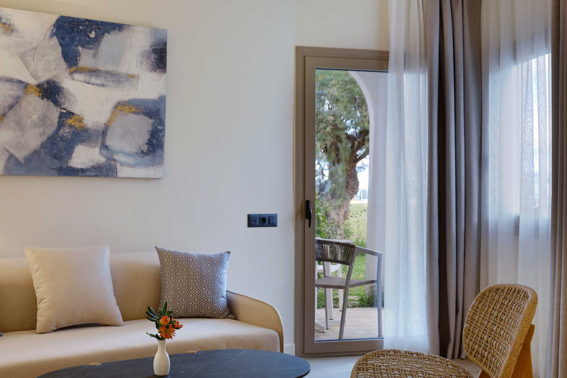 Suite med balkon eller terrasse, nogle med havudsigt og nogle med delvis havudsigt. Suiten består af et soveværelse med dobbeltseng og en stue med mulighed for ekstra opredning i en sovesofa. Suiterne er placeret i hovedbygningen eller i de to bungalowbygninger uden elevator. Gratis wifi, aircondition og deponering. Køleskab. El-kedel og kaffe/te. Espressomaskine. Tv med internationale kanaler. Strygejern og strygebræt. Hårtørrer. Badeværelse med bruser og toilet. Rengøring 7 gange om ugen.