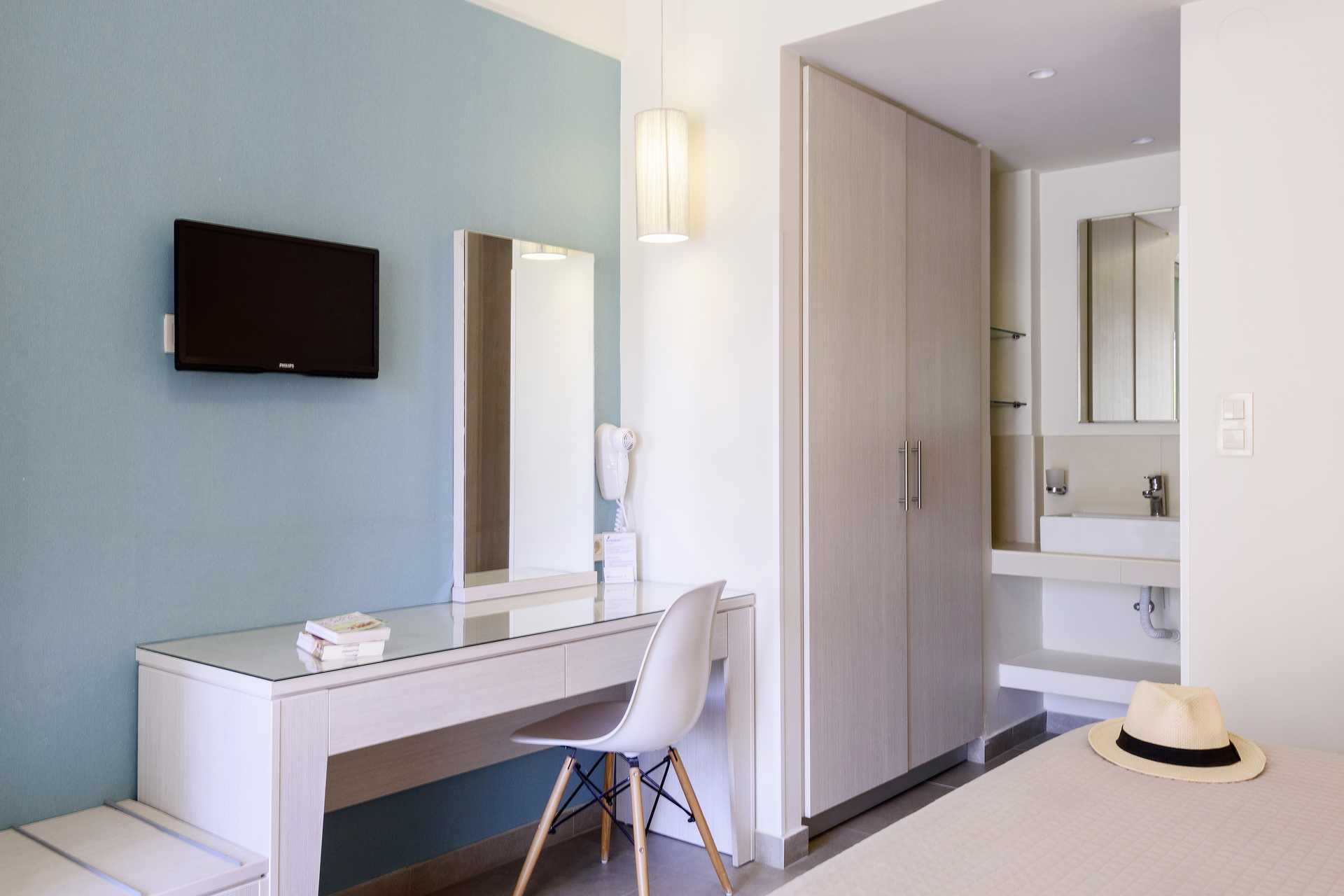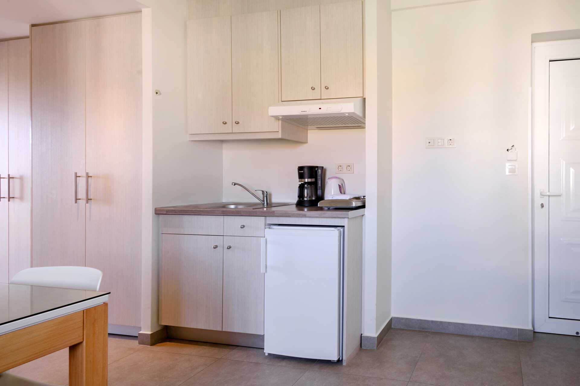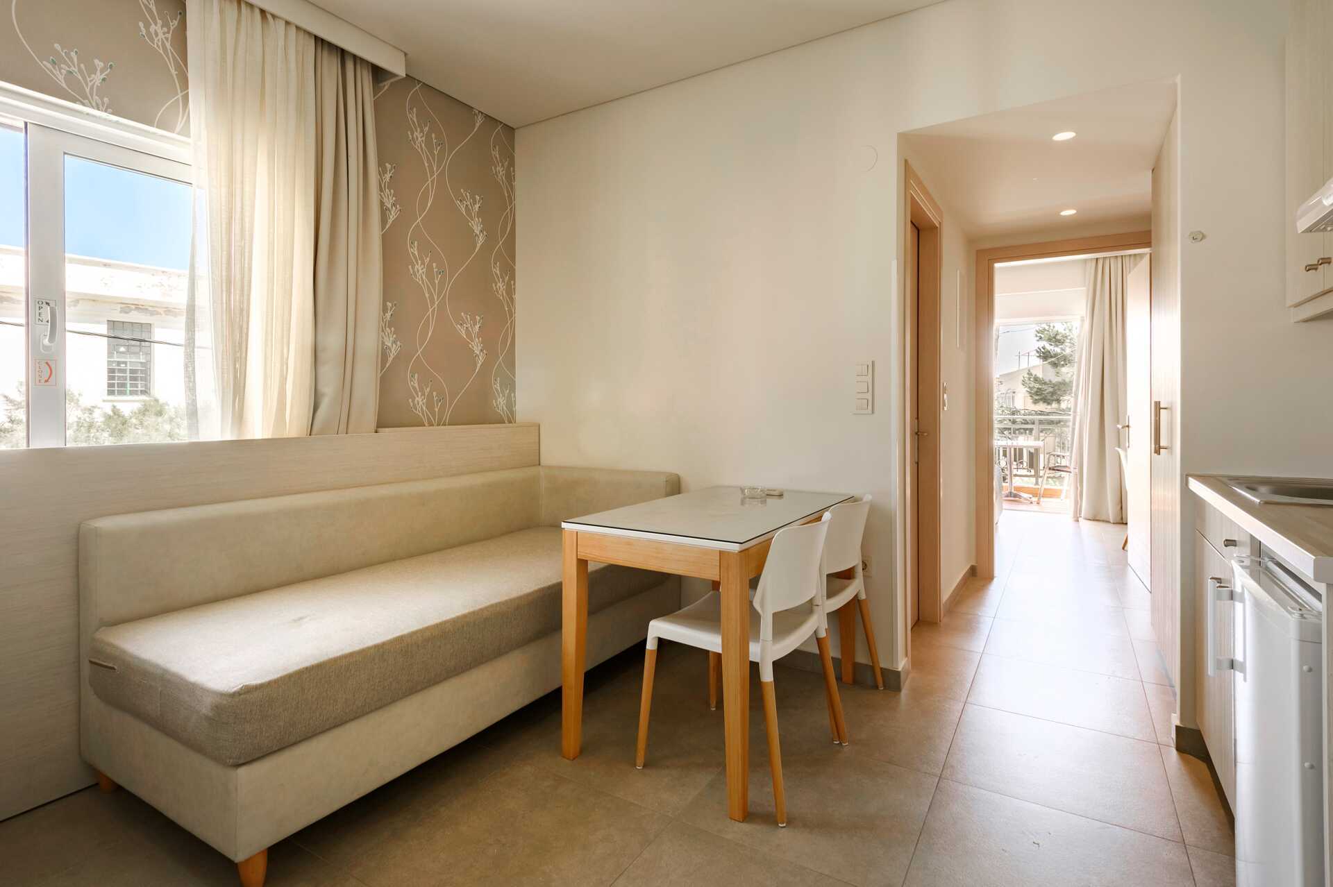 1-værelses lejligheder med balkon eller terrasse. Lejlighederne ligger i både hovedbygningen og sidebygningen, ca. 250 meter væk. Kombineret soveværelse og minikøkken. En dobbeltseng eller to enkeltsenge. Mulighed for ekstra opredning i sovesofa. Minikøkken med kogeplader, køleskab, kaffemaskine, el-kedel og enkelt køkkenudstyr. Gratis wifi, aircondition og deponering. Tv med internationale kanaler. Myggenet i balkondørene. Hårtørrer. Badeværelse med badekar eller bruser samt toilet. Rengøring 7 gange om ugen.