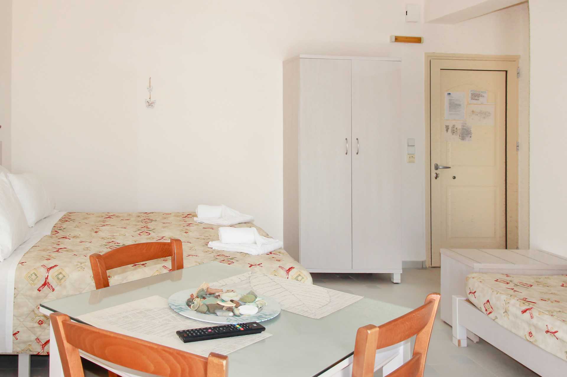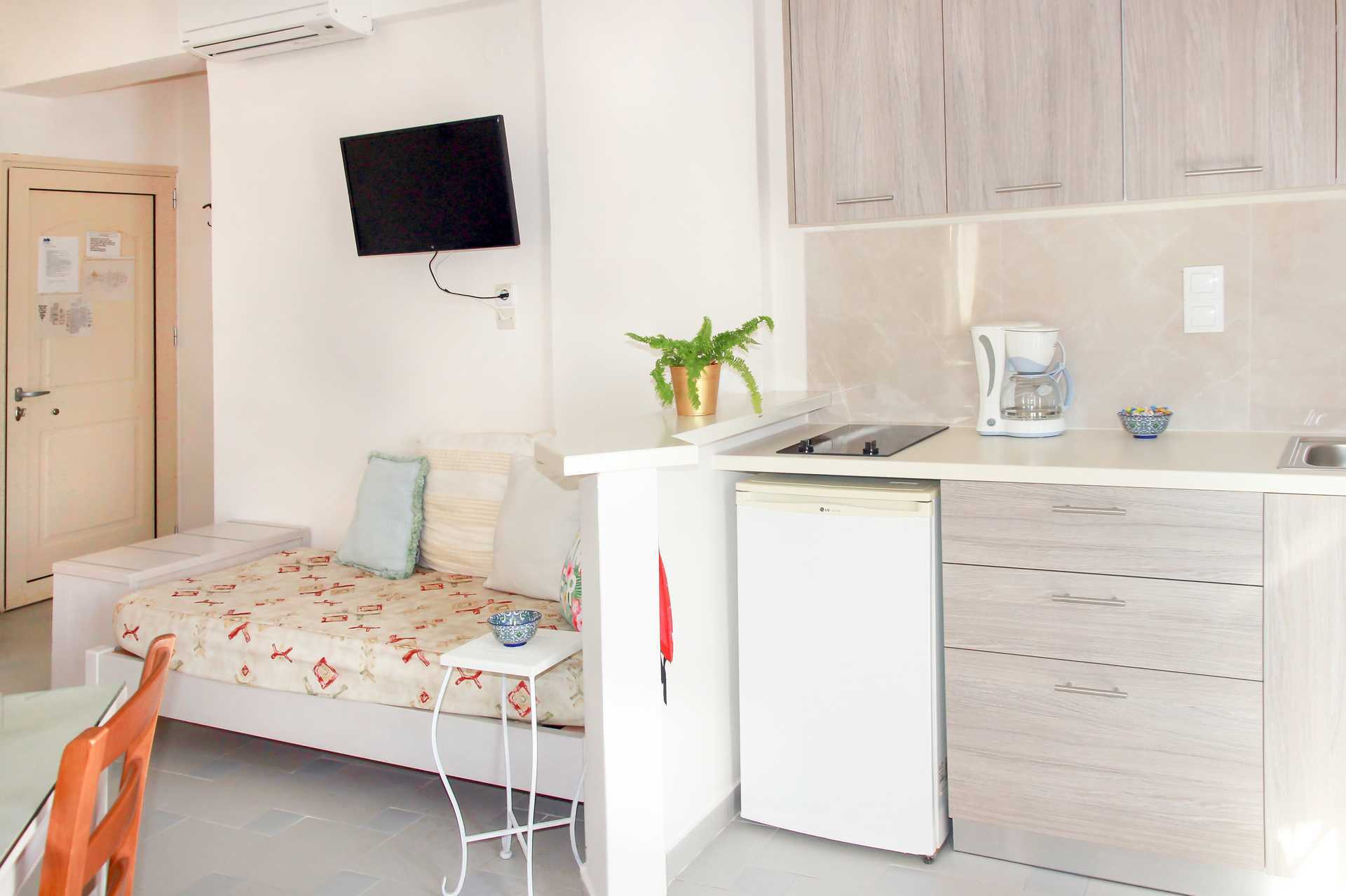 2-værelses lejligheder med balkon. Et soveværelse samt et kombineret opholdsrum og minikøkken. To enkeltsenge. Mulighed for ekstra opredninger i sovesofa. Minikøkken med køleskab, kogeplader, kaffemaskine, el-kedel og enkelt køkkenudstyr. Gratis wifi, deponering og aircondition. Tv med internationale kanaler. Hårtørrer. Badeværelse med bruser og toilet. Rengøring 6 gange om ugen. Trapper til alle lejligheder.