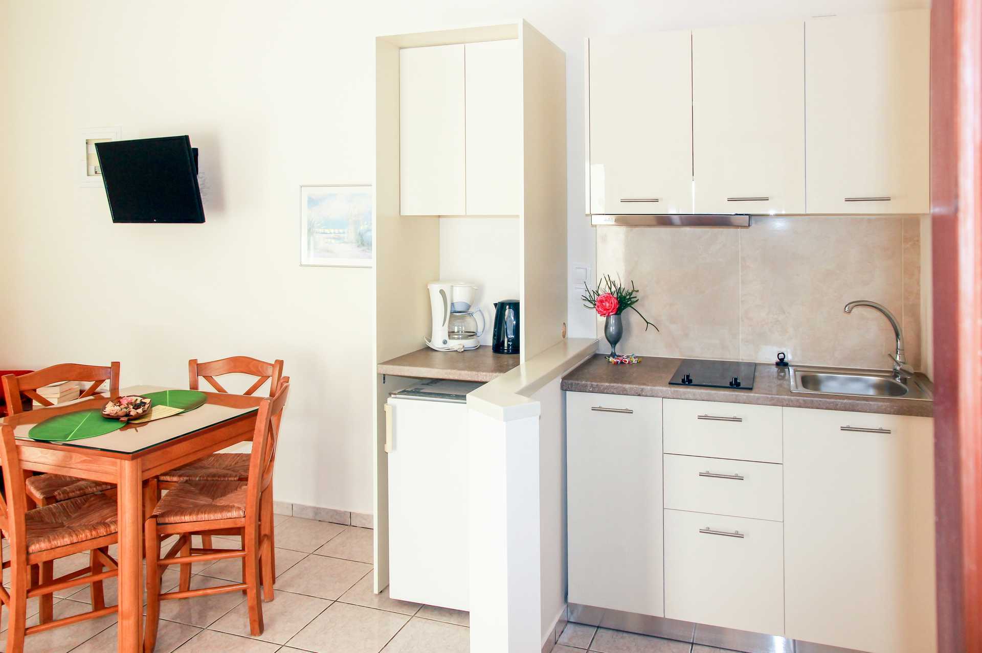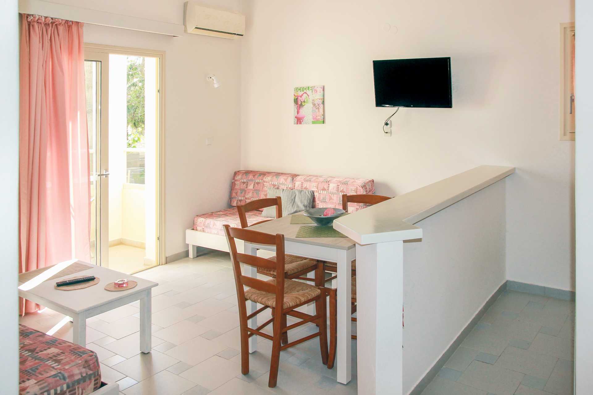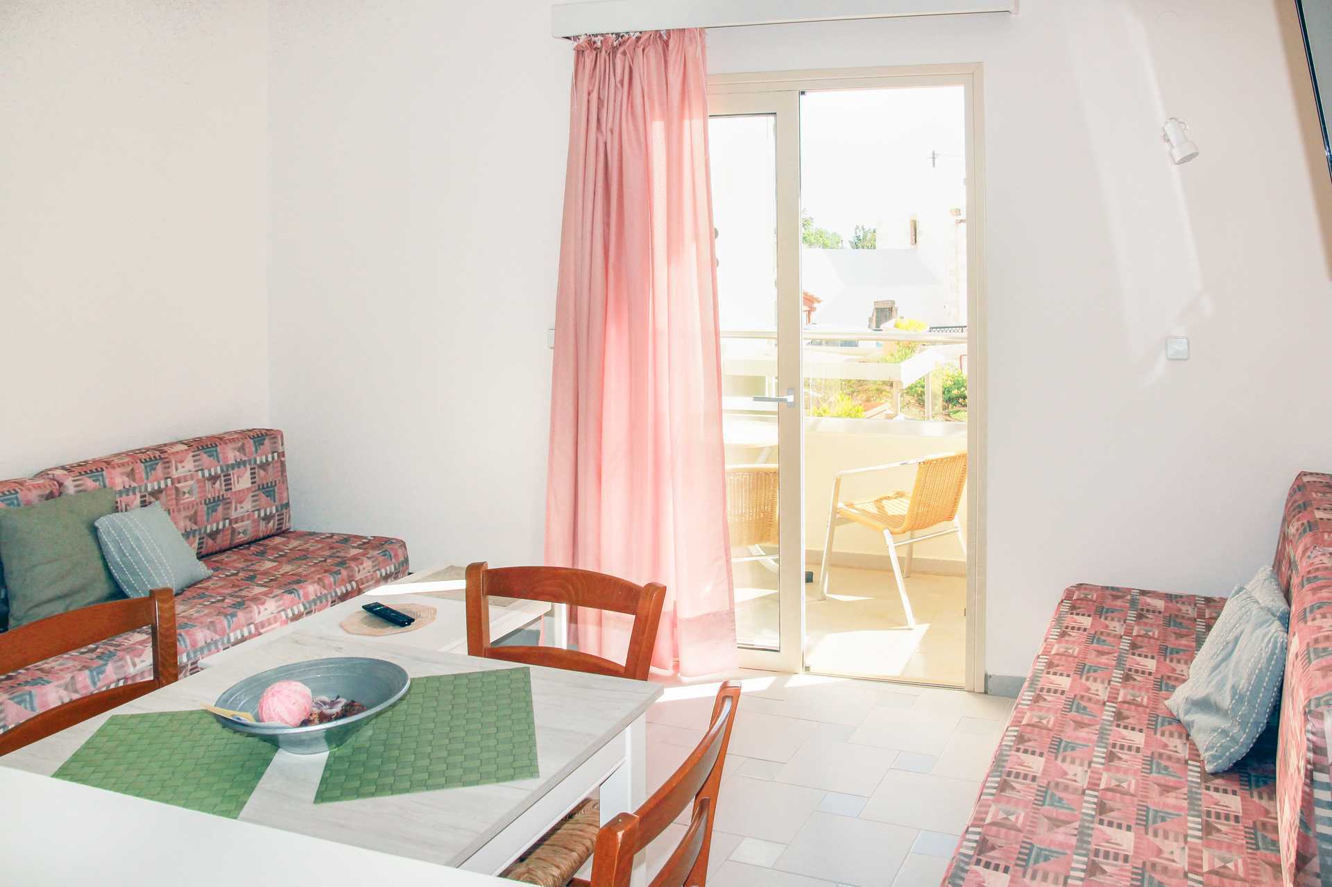 1-værelses lejligheder med balkon, nogle med udsigt mod poolen. Kombineret soveværelse og minikøkken. To enkeltsenge. Mulighed for ekstra opredning i sovesofa. Minikøkken med køleskab, kogeplader, kaffemaskine, el-kedel og enkelt køkkenudstyr. Gratis wifi, deponering og aircondition. Tv med internationale kanaler. Hårtørrer. Badeværelse med bruser og toilet. Rengøring 6 gange om ugen. Trapper ind til alle lejligheder.