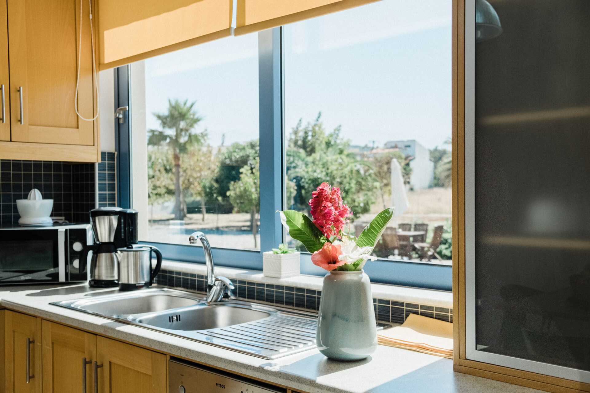 3-værelses lejlighed i 1- eller 2-etagers villaer med privat pool og delvis havudsigt fra terrassen i stueplan. På terrassen er der spiseplads og solstole, og hver lejlighed har en balisseng på græsplænen. To soveværelser og et kombineret opholdsrum/køkken. Komfortabel dobbeltseng med topmadras i soveværelserne. Mulighed for ekstra opredninger i lænestole. Veludstyret køkken med komfur og ovn, køleskab, opvaskemaskine, kaffemaskine, saftpresser, mikroovn og enkelt køkkenudstyr. El-kedel på forespørgsel. Gratis wifi, aircondition og deponering. Tv med internationale kanaler. Hårtørrer. To badeværelser med badekar eller bruser samt toilet. Rengøring 6 gange om ugen.