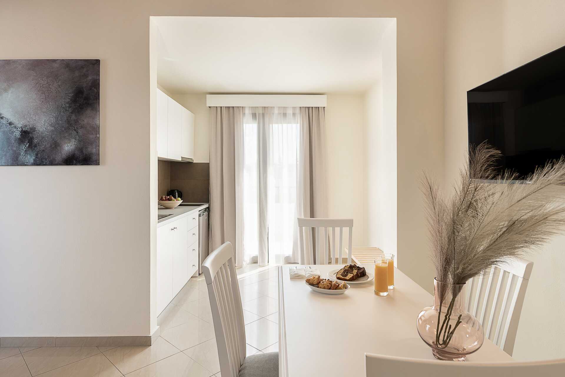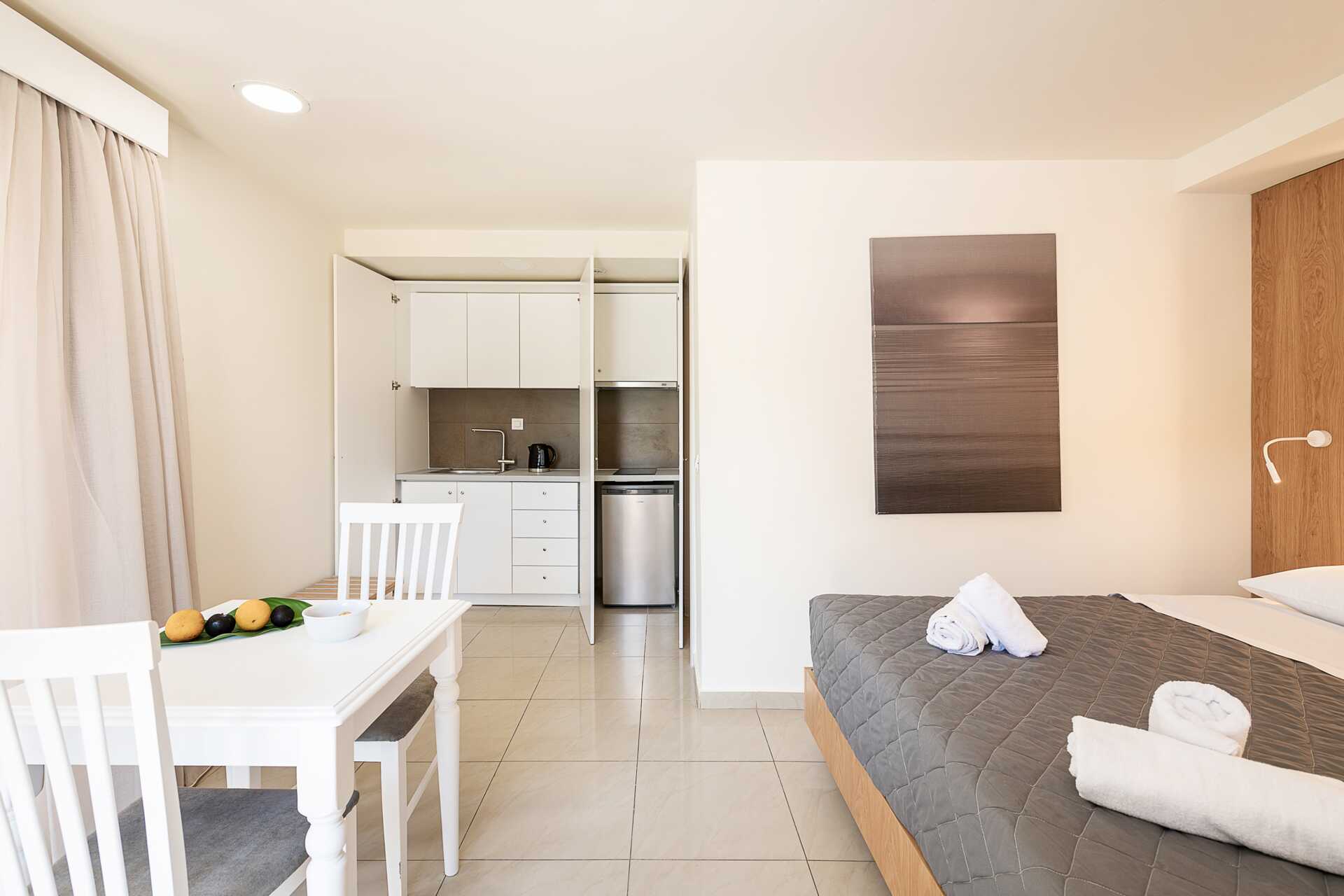 1-værelses lejligheder med balkon eller terrasse. Kombineret soveværelse og minikøkken. En dobbeltseng. Mulighed for ekstra opredning i sovesofa. Minikøkken med køleskab, kogeplader, mikrobølgeovn og enkelt køkkenudstyr. Gratis wifi, aircondition og deponering. Tv med internationale kanaler. Strygejern og strygebræt. Badekåber og tøfler. Hårtørrer. Badeværelse med badekar eller bruser samt toilet. Rengøring 7 gange om ugen.
