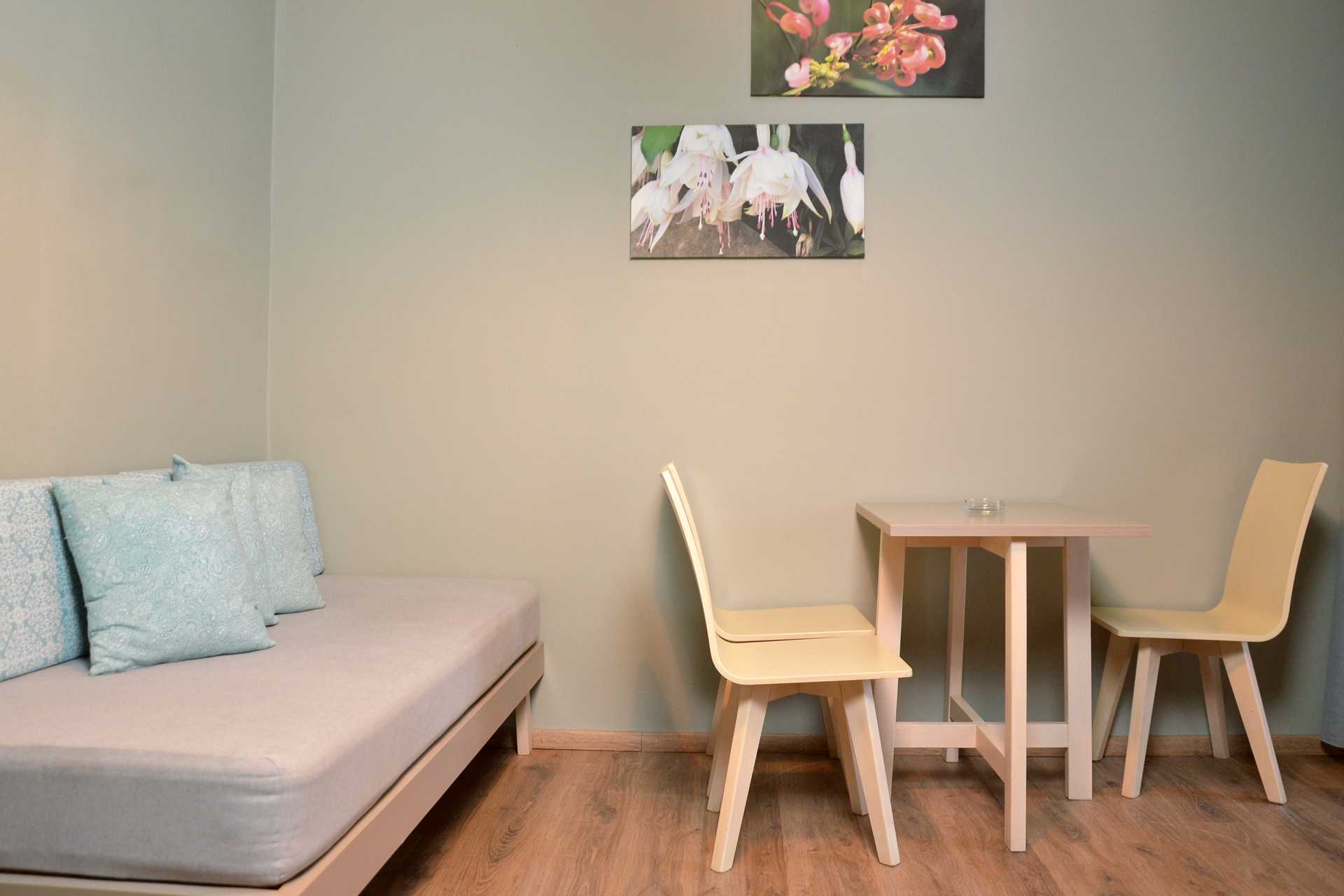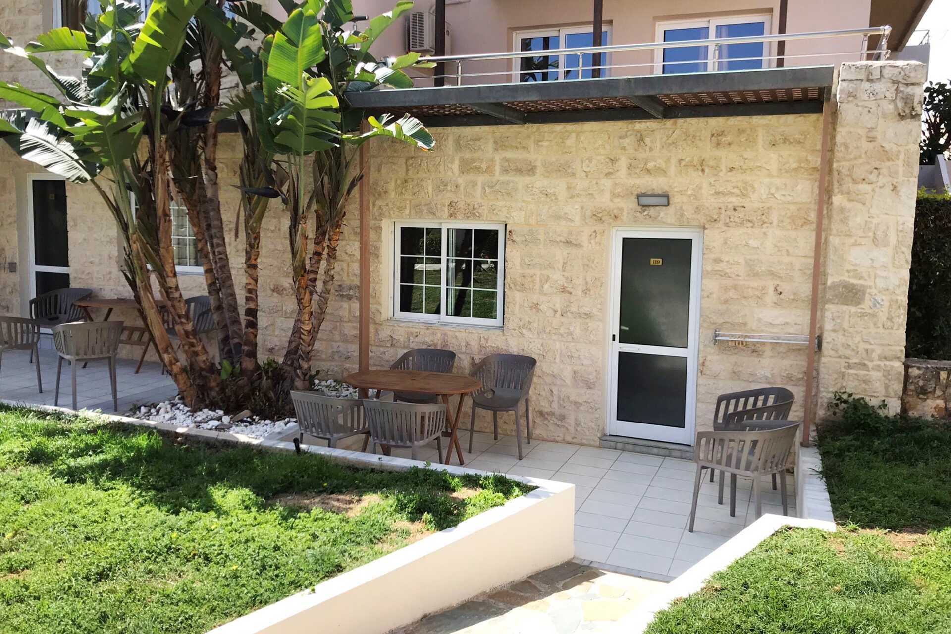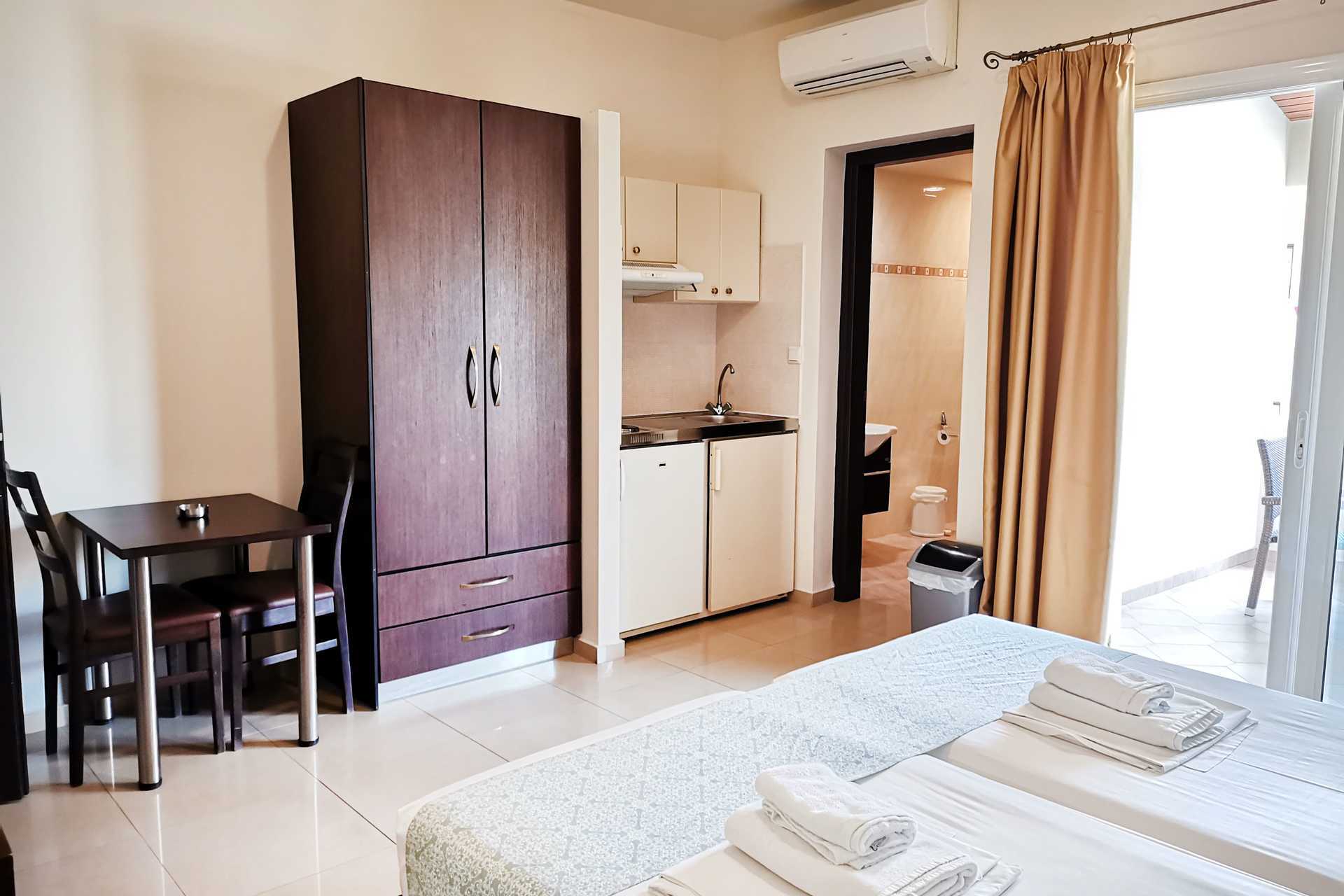 1-værelses lejlighed med balkon, balkon i stueplan eller terrasse i stueplan. En af lejlighederne har niveauforskel/trappetrin inde i lejligheden. Nogle af lejlighederne ligger i hovedbygningen og er tilgængelige via trapper fra receptionen. Der er ingen elevator. Dette gælder også for de lejligheder som har balkon i stueplan. Kombineret soveværelse med minikøkken. En dobbeltseng eller to enkeltsenge. Mulighed for ekstra opredning i en sovesofa eller en fold ud-stol. Minikøkken med kogeplader, køleskab, kaffemaskine, el-kedel, brødrister og enkelt køkkenudstyr. Gratis wifi, aircondition og deponering. Tv med lokale kanaler. Badeværelse med badekar eller bruser samt toilet. Rengøring 6 gange om ugen.