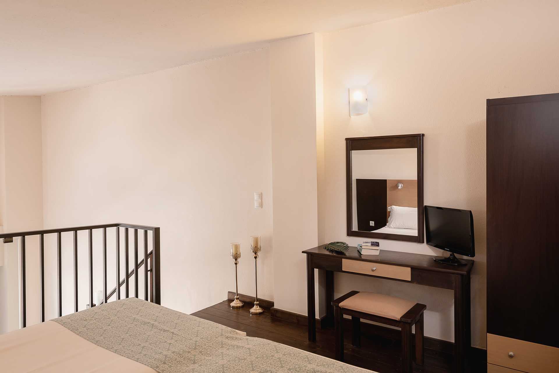 1-værelses lejligheder i etage med balkon. I entréplan findes kombineret opholdsrum og minikøkken samt badeværelse. En meget stejl trappe til overetagen med to enkeltsenge. Åben planløsning mellem etagerne. Mulighed for ekstra opredning i sovesofa. Minikøkken med kogeplader, køleskab, kaffemaskine, el-kedel, brødrister og enkelt køkkenudstyr. Gratis wifi, aircondition og deponering. Tv med lokale kanaler. Badeværelse med badekar eller bruser samt toilet. Rengøring 6 gange om ugen.