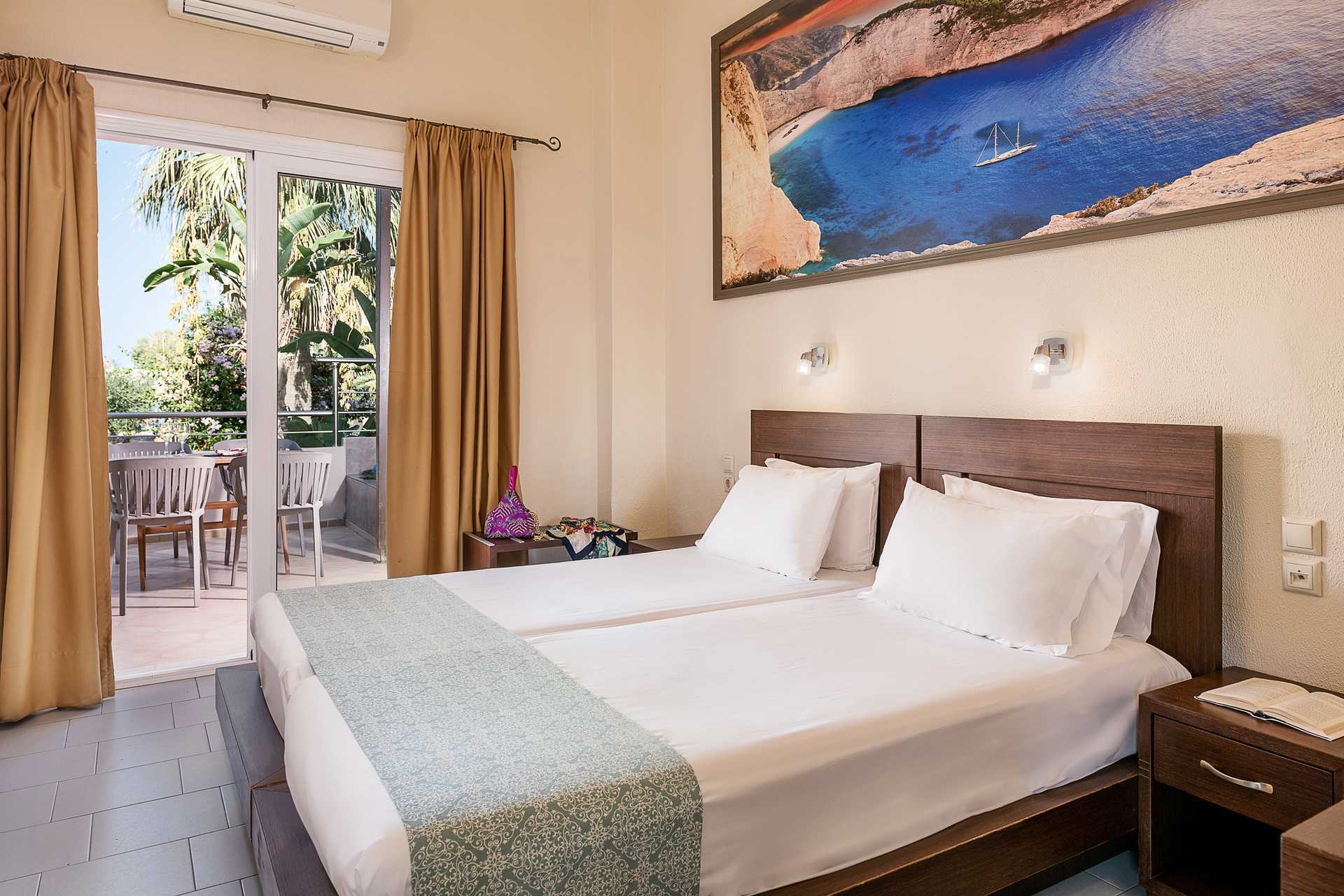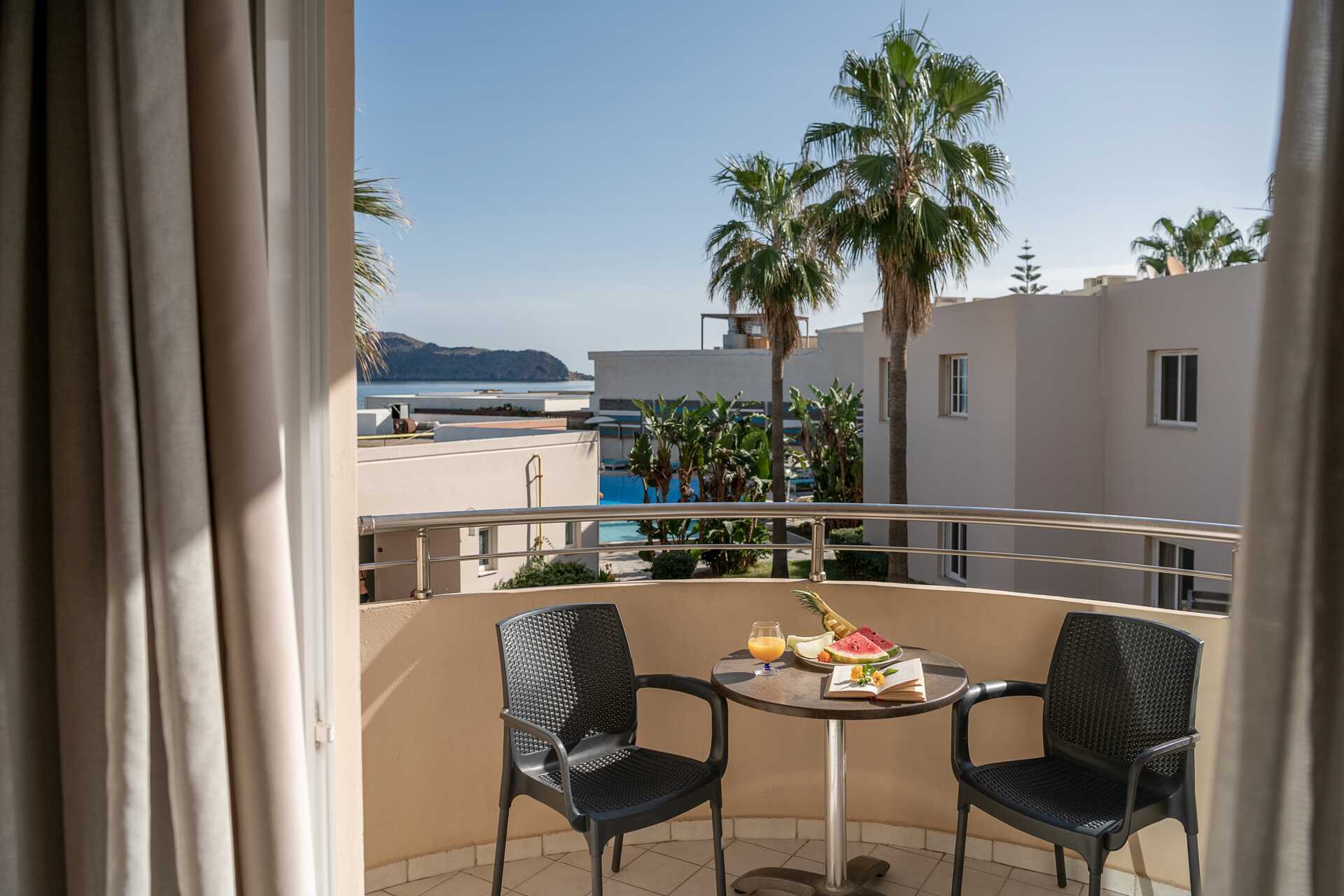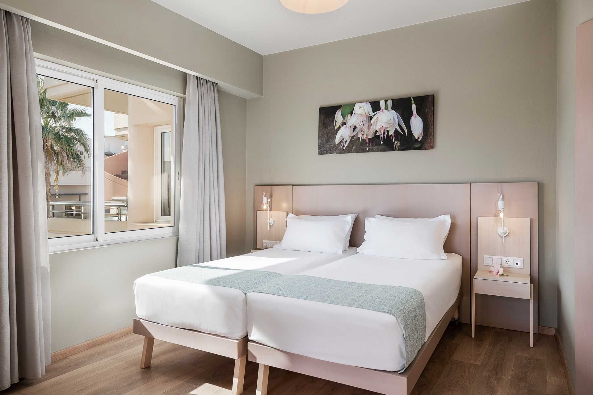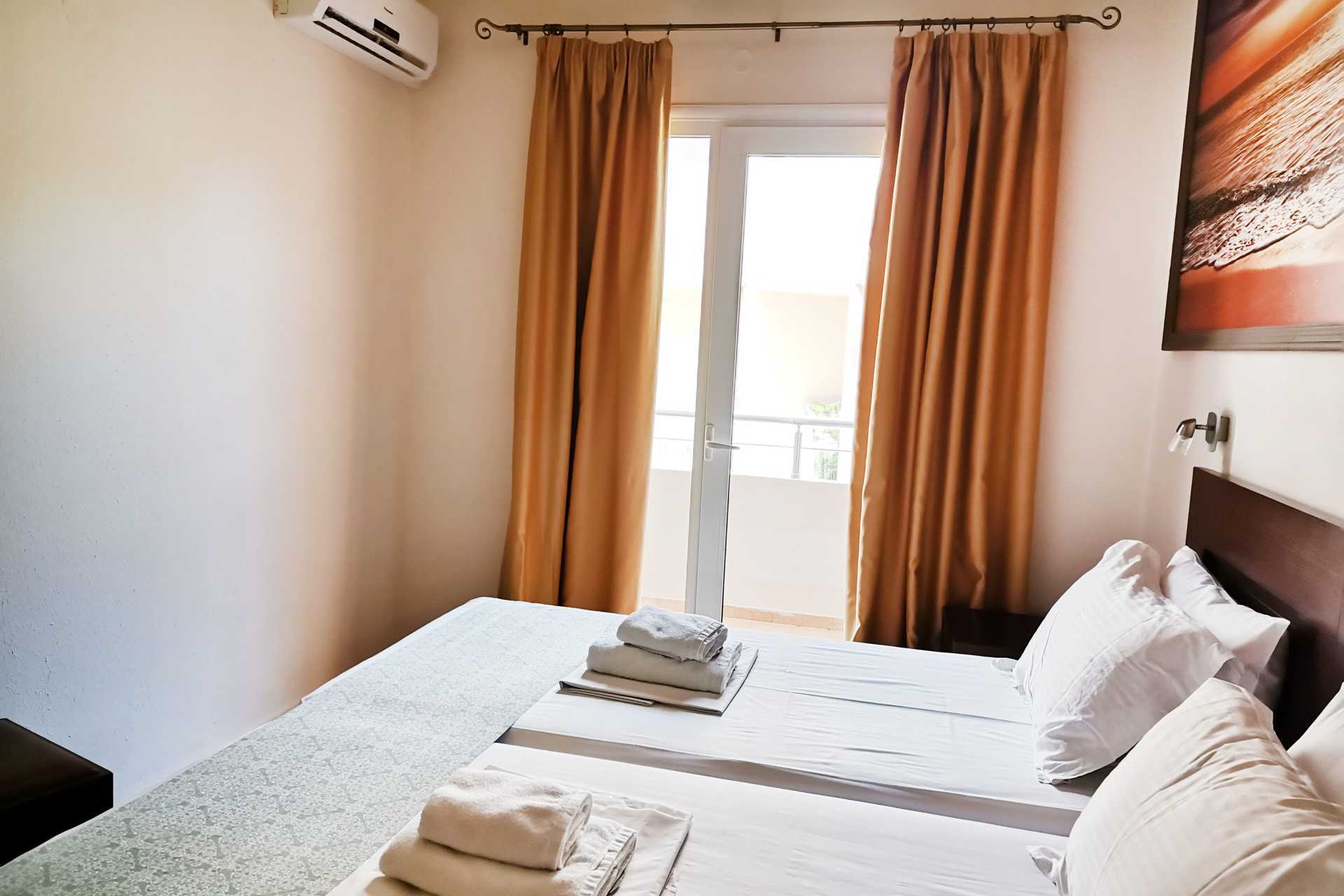 2-værelses lejligheder med balkon, balkon i stueplan eller terrasse. Lejlighederne ligger en trappe op fra receptionen. Ingen elevator. Soveværelse samt kombineret opholdsrum og minikøkken. To enkeltsenge. Mulighed for ekstra opredninger i sovesofa. Minikøkken med kogeplader, køleskab, kaffemaskine, el-kedel, brødrister og enkelt køkkenudstyr. Gratis wifi, aircondition og deponering. Tv med lokale kanaler. Badeværelse med badekar eller bruser samt toilet. Rengøring 6 gange om ugen.